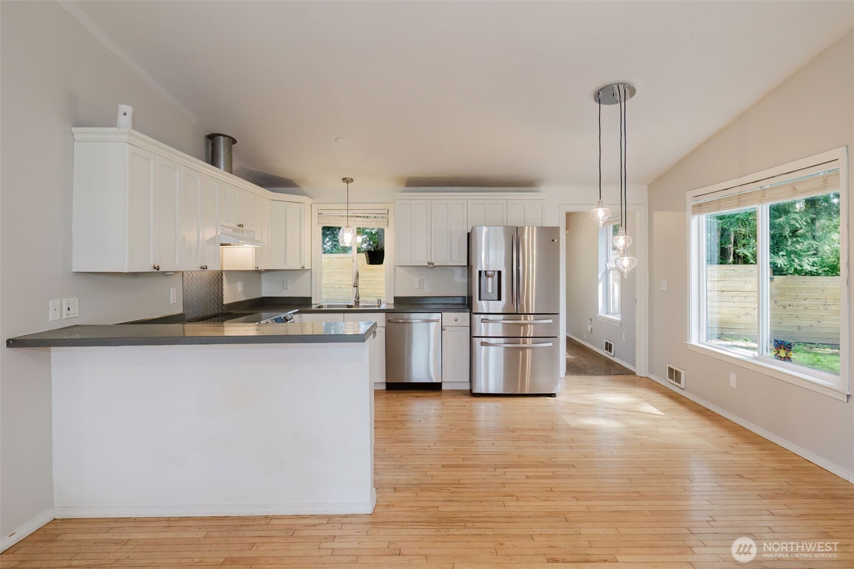 Charming 2 bedroom, 1 bath home with fresh exterior paint and inviting curb appeal. Light filled living spaces and a comfortable floor plan create an inviting interior. This well maintained property offers a fully fenced yard perfect for outdoor entertainment, gardening, or relaxing. Conveniently located near schools, shopping, dining, and ferries, with easy access to everyday amenities. A great opportunity to own a move-in ready home in a desirable location. New hot water heater, fall 2025. Large laundry room off of kitchen.