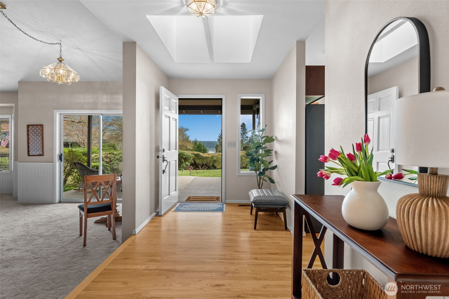 A rare opportunity to own a meticulously cared for home in this highly sought-after neighborhood. Located about a mile up the hill from Hwy 303, you’ll enjoy quick access to PSNS, Bangor, and Keyport all while feeling tucked away on a peaceful and picturesque lot. Perched above the beautiful Brownsville area, this home offers stunning water views stretching toward the Cascade Mountains. Step into the light-filled foyer and immediately feel the quality and care poured into every detail. Morning sunlight floods the open-concept living spaces, highlighting cathedral ceilings, skylights, and expansive windows throughout. The spacious kitchen, complete with a double oven, makes hosting effortless, while multiple living areas provide flexibility for relaxing, entertaining, and everyday living. The primary suite is a true retreat, featuring three closets, a large double-sink vanity, and a spa-inspired walk-in shower with a window overlooking the garden. The additional bedrooms are generously sized with large closets. This home offers two dedicated office spaces that offer the perfect setup for remote work or could easily function as an additional bedroom, playroom or hobby space. Built-in cabinetry, shelving, and abundant storage throughout ensure exceptional organization and functionality in the home. Outside, enjoy a beautifully maintained, terraced yard with mature landscaping and ample space for play, gardening, and entertaining. Welcome home to a place you'll love forever.