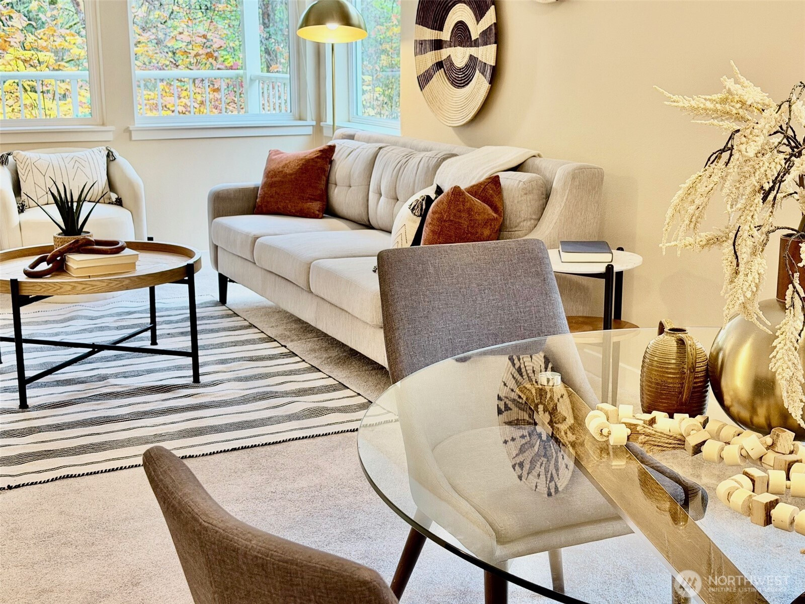 This rare two-bedroom, two-parking corner end unit lives like a private retreat overlooking protected green space. Enjoy single-level living with a Juliette balcony off the dining area and a spacious covered balcony extending from the living room—perfect for morning coffee or evening relaxation. The well-appointed kitchen features stainless appliances, and the oversized entry closet adds exceptional storage. The serene primary suite captures lush views, while the versatile second bedroom doubles beautifully as an office or creative space. With two dedicated parking spots, a storage area, and a premier in-town location, this is Bainbridge Island living made effortless.
