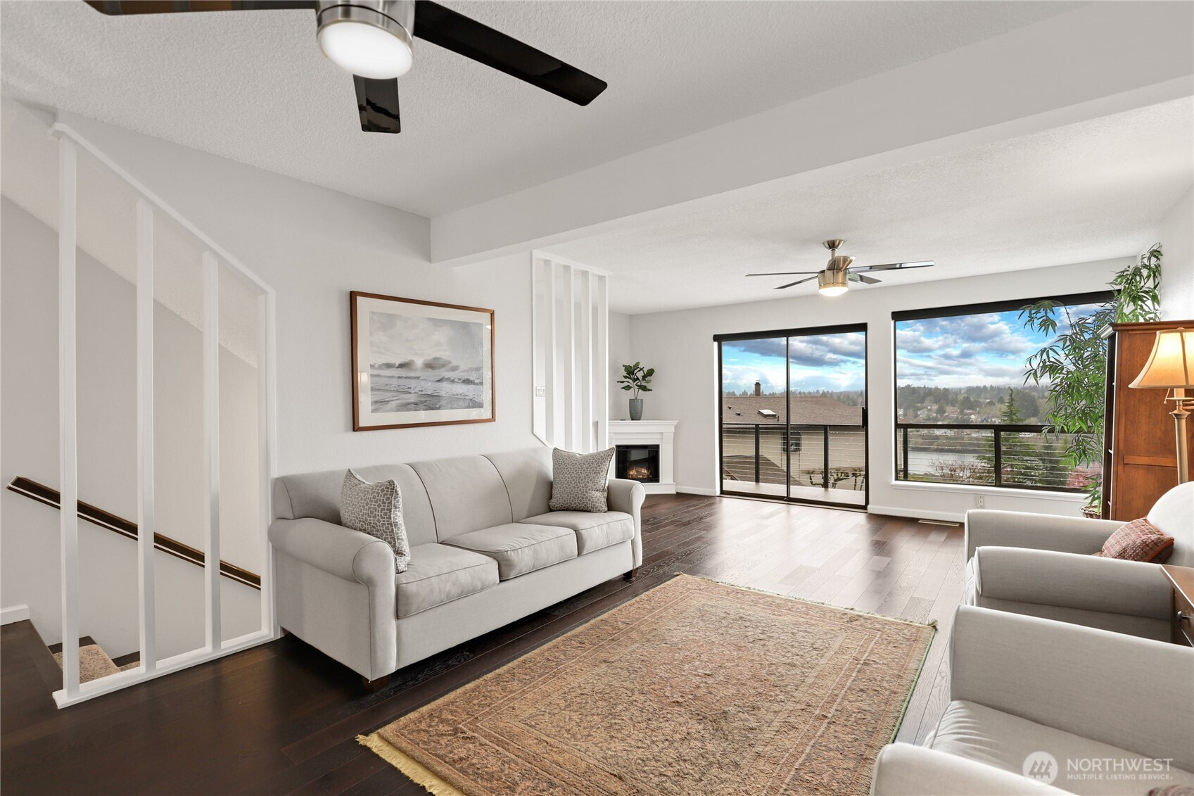 Light and bright, this 2-bedroom condo lives large with stunning Puget Sound views and an inviting, open layout. The spacious living area is anchored by a cozy electric fireplace and flows seamlessly into the kitchen, featuring granite countertops, stainless steel appliances, and ample prep space. Large windows bring in natural light, enhancing the warm and welcoming feel throughout. Step out onto the private balcony to relax and take in the views. An individual garage provides secure parking and extra storage. Ideally located near parks, scenic trails, and everyday amenities, this home offers a perfect blend of comfort, convenience, and Northwest charm.