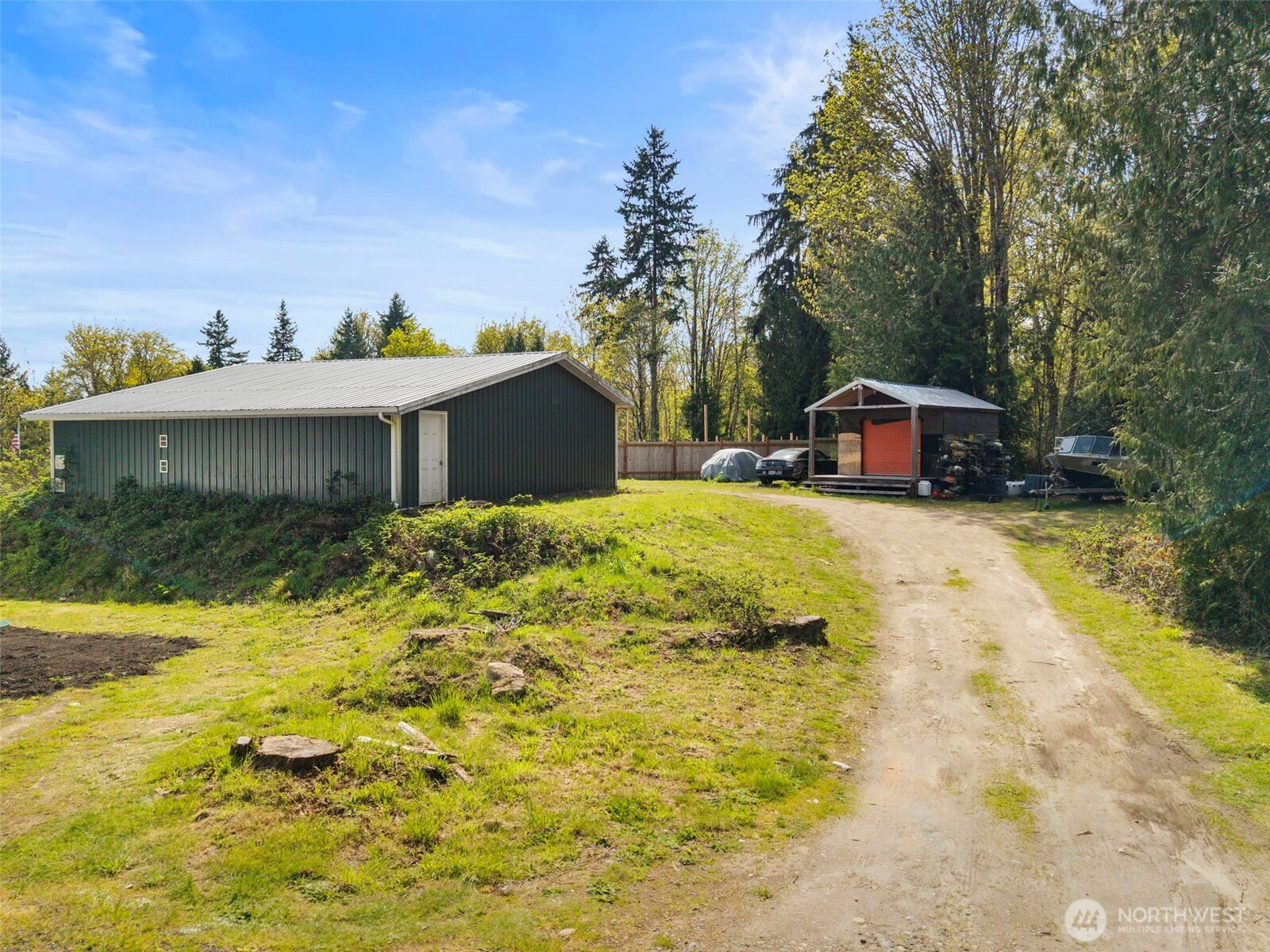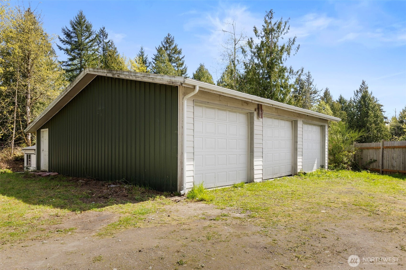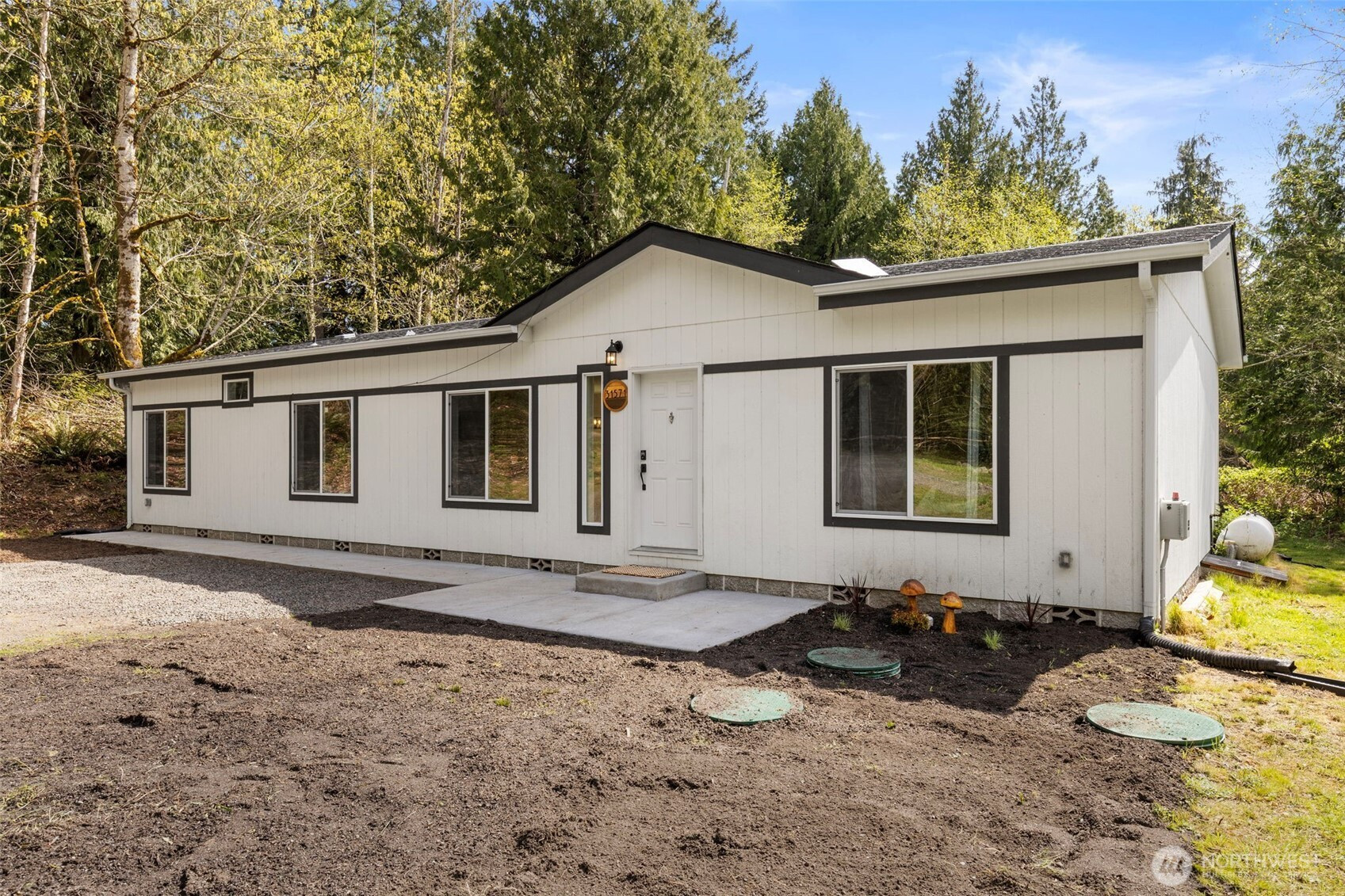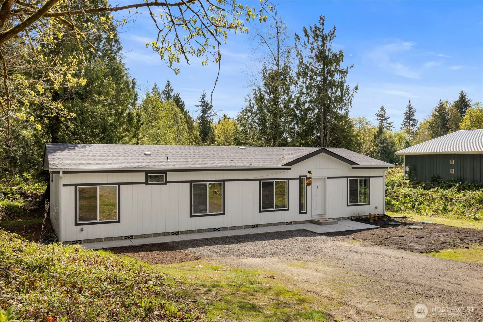 Nearly-new 1,566 sq ft home set on 2.5 peaceful acres, offering space, privacy, and modern finishes just minutes from Kingston. This 3-bedroom, 1.75-bath home features an open layout with elevated finishes including stainless steel appliances, quartz countertops, contemporary lighting, and a huge pantry for exceptional storage. Two separate living areas provide flexibility for relaxing, entertaining, or working from home. The primary suite is privately situated on the opposite side of the home from the two guest bedrooms, offering added separation and comfort. The property is well-suited for those needing space for hobbies or equipment, highlighted by a 36x36, 1,296 sq ft insulated and powered 3-car garage or workshop with 200 amp service, plus a 12x12 shed and ample RV or boat parking. Enjoy the balance of a quiet, rural setting with convenient access to Kingston ferries including the fast ferry to Seattle, schools, restaurants, beaches, and trails. No HOA. A versatile property with room to live, work, and play!