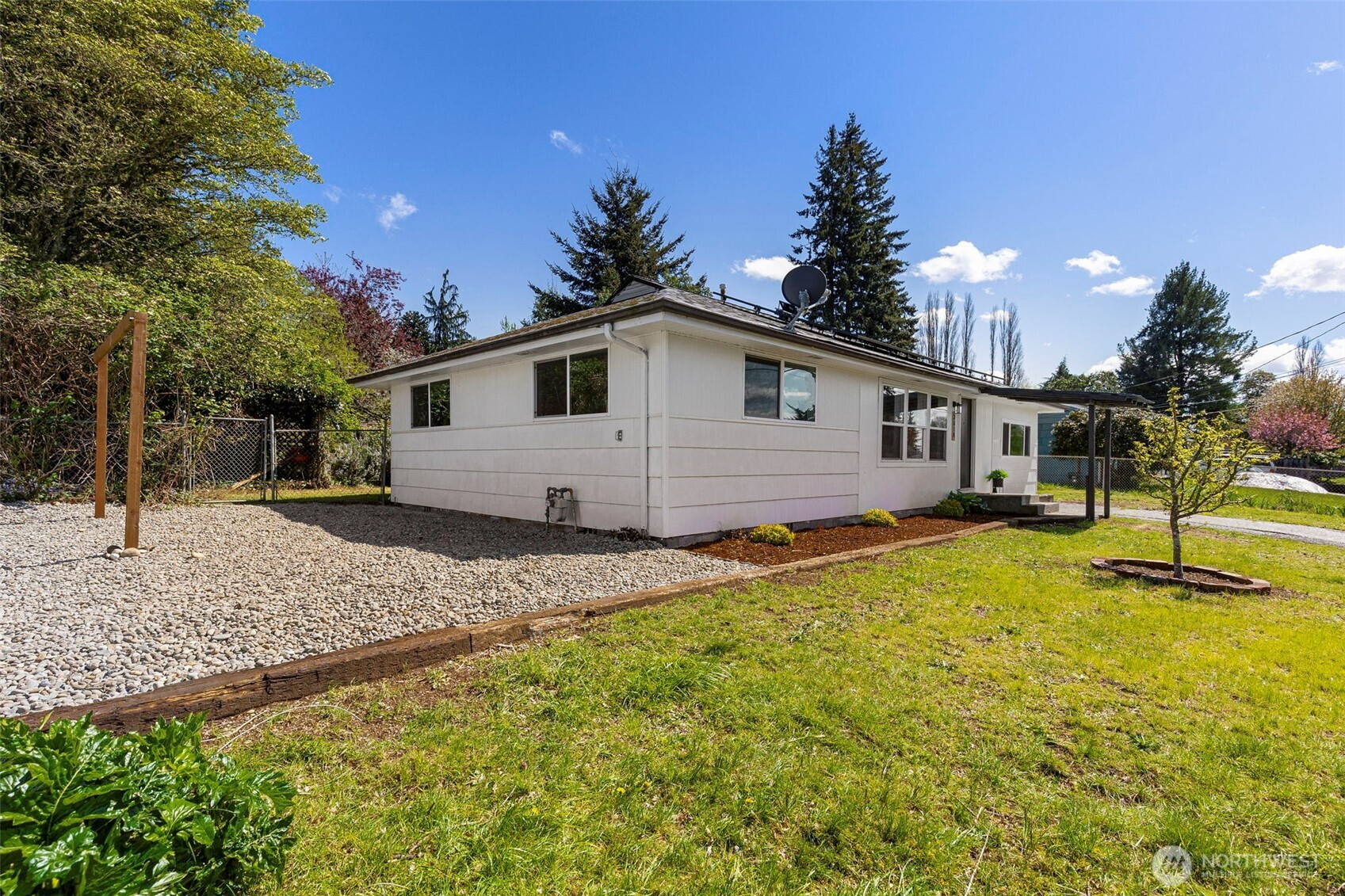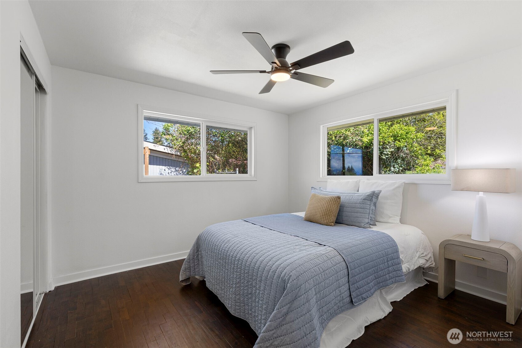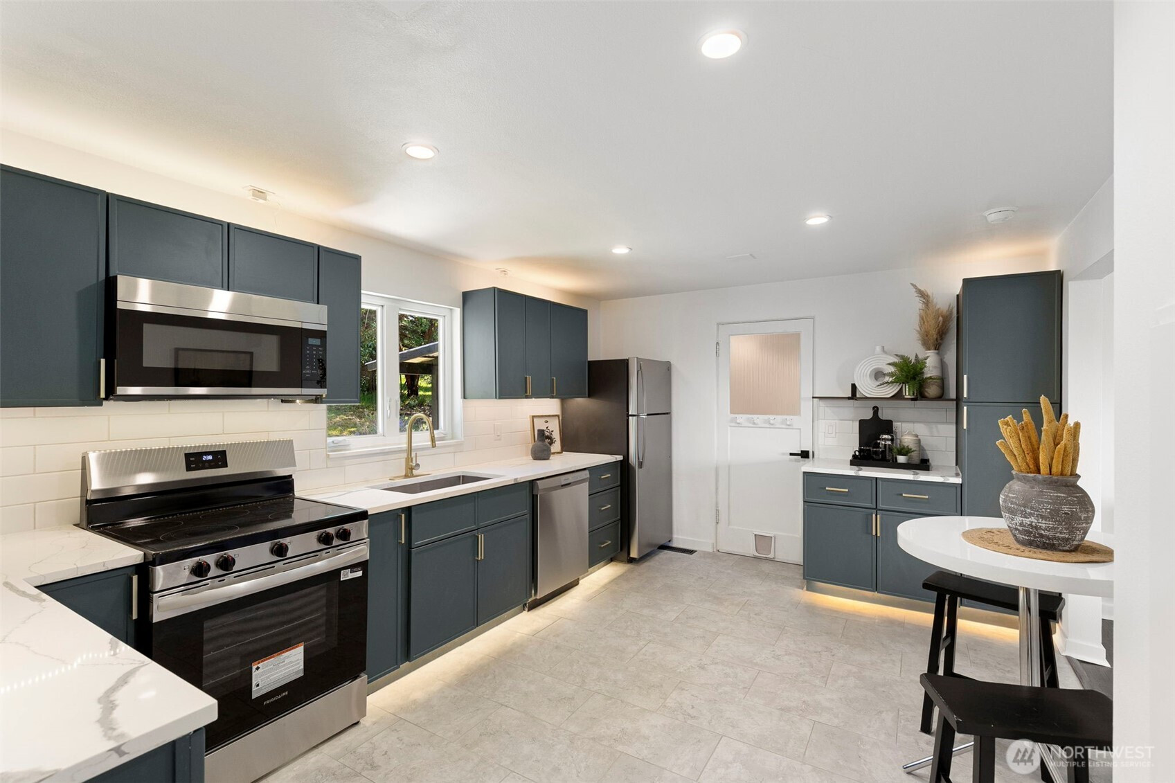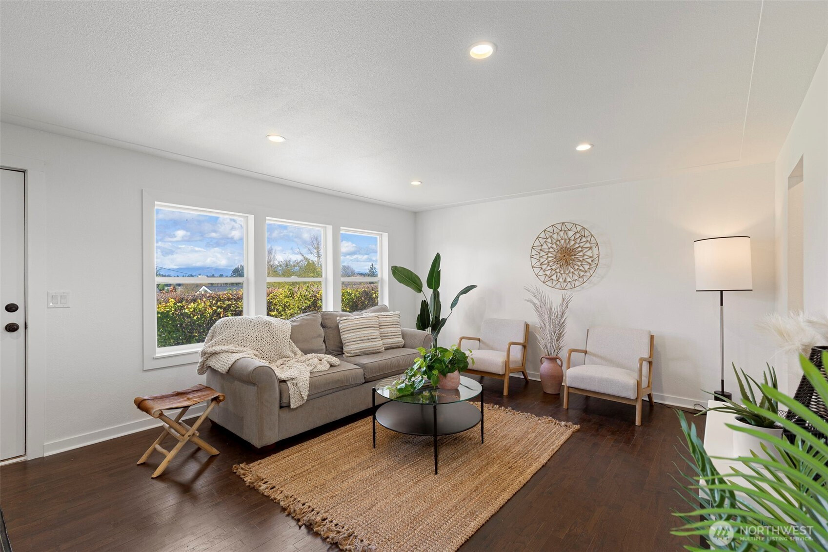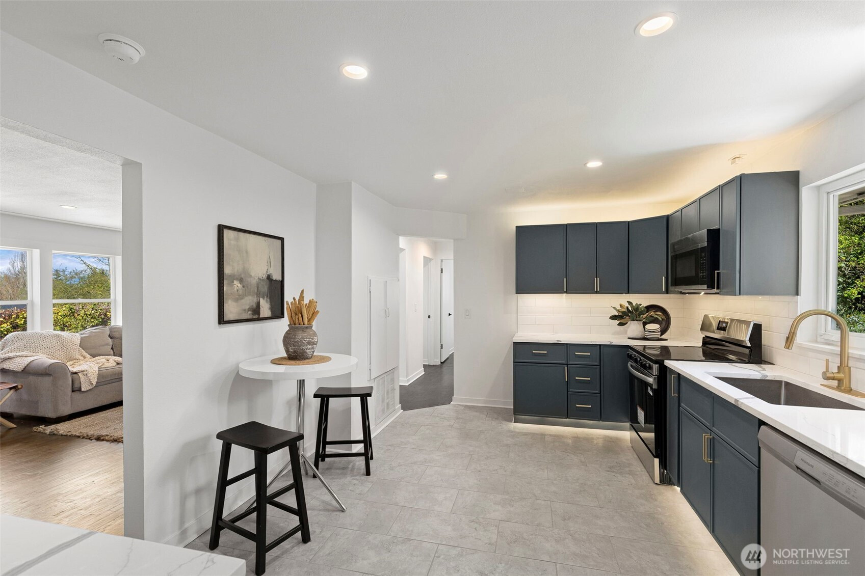 Completely reimagined and effortlessly stylish, this stunning single-level home offers modern living at its finest. The front yard hedges frame the Olympic Mountain range beautifully allowing you to capture stunning sunsets and year around views inside and out. From the moment you step inside, you're welcomed by refinished natural hardwood flooring that flows throughout paired with new stone tile, creating a warm and cohesive feel. The beautifully updated kitchen is a true showpiece, featuring new cabinetry accented with striking gold hardware, gleaming stainless steel appliances, and elegant white marbled quartz countertops that bring both sophistication and function together. The bathroom has been thoughtfully updated with contemporary finishes andclean, modern touches. Step outside to a covered patio perfect for year-round entertaining or quiet relaxation, all surrounded by mature landscaping that provides both beauty and privacy. Enjoy the benefits of the solar panels offering peace of mind and energy efficieney for years to come. With its single-level layout, high-end finishes, and turn-keycondition, this home delivers the perfect blend of comfort, style, and smart living.