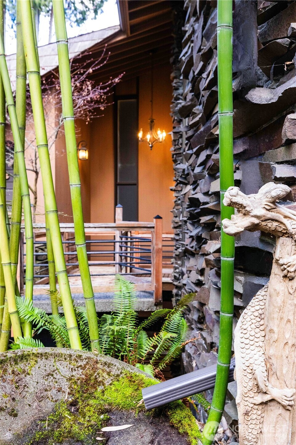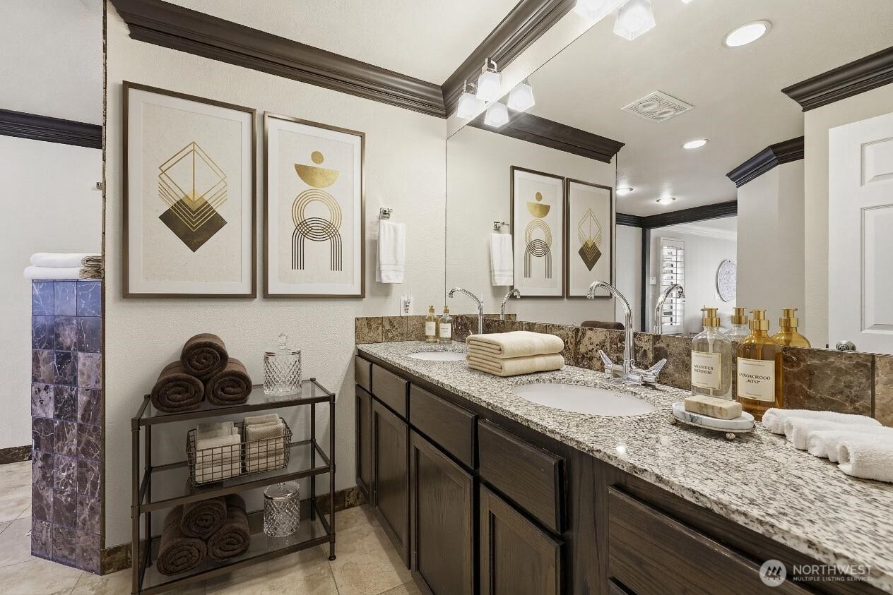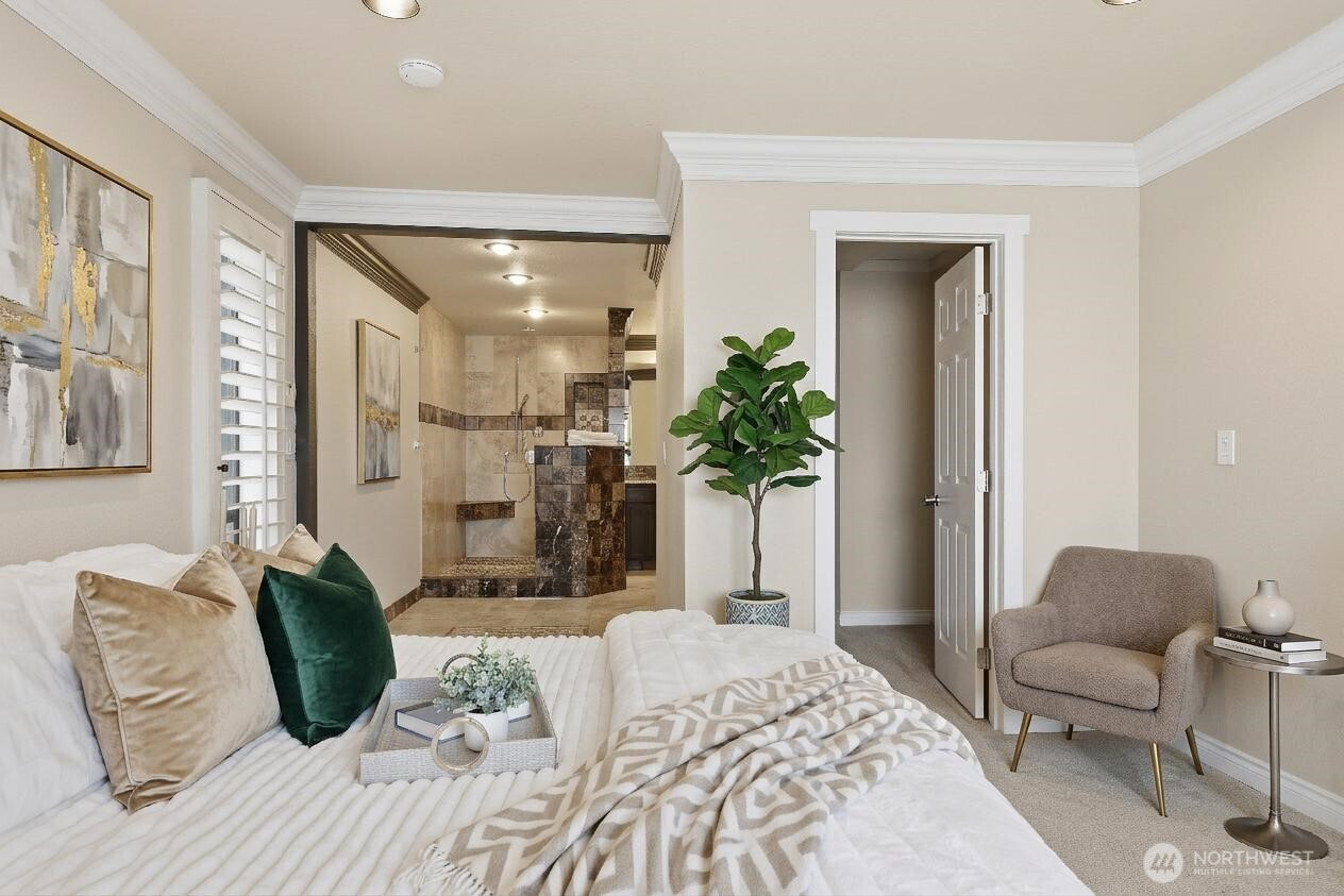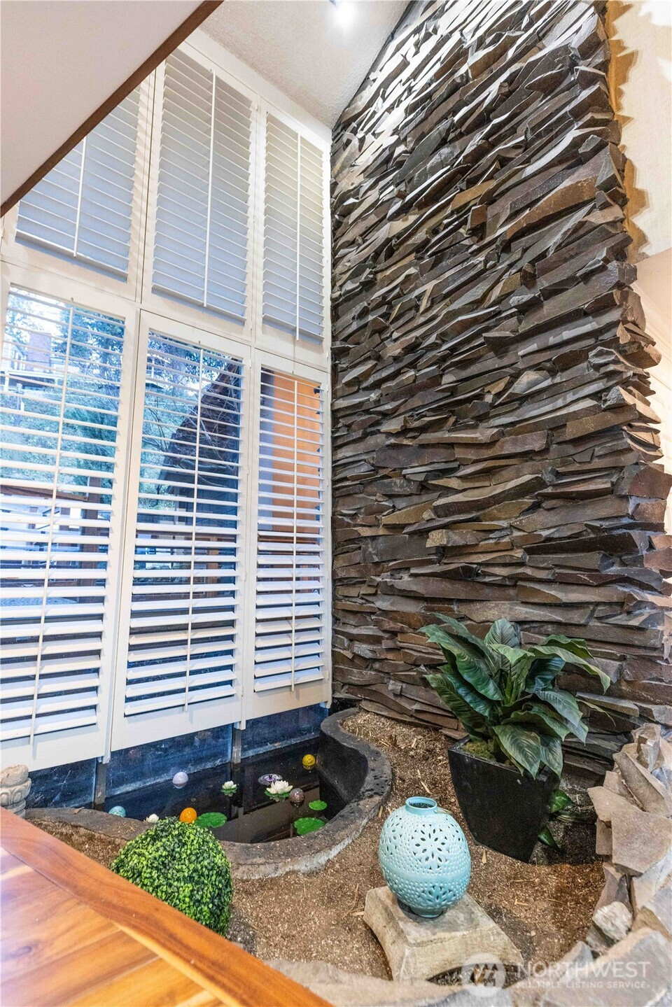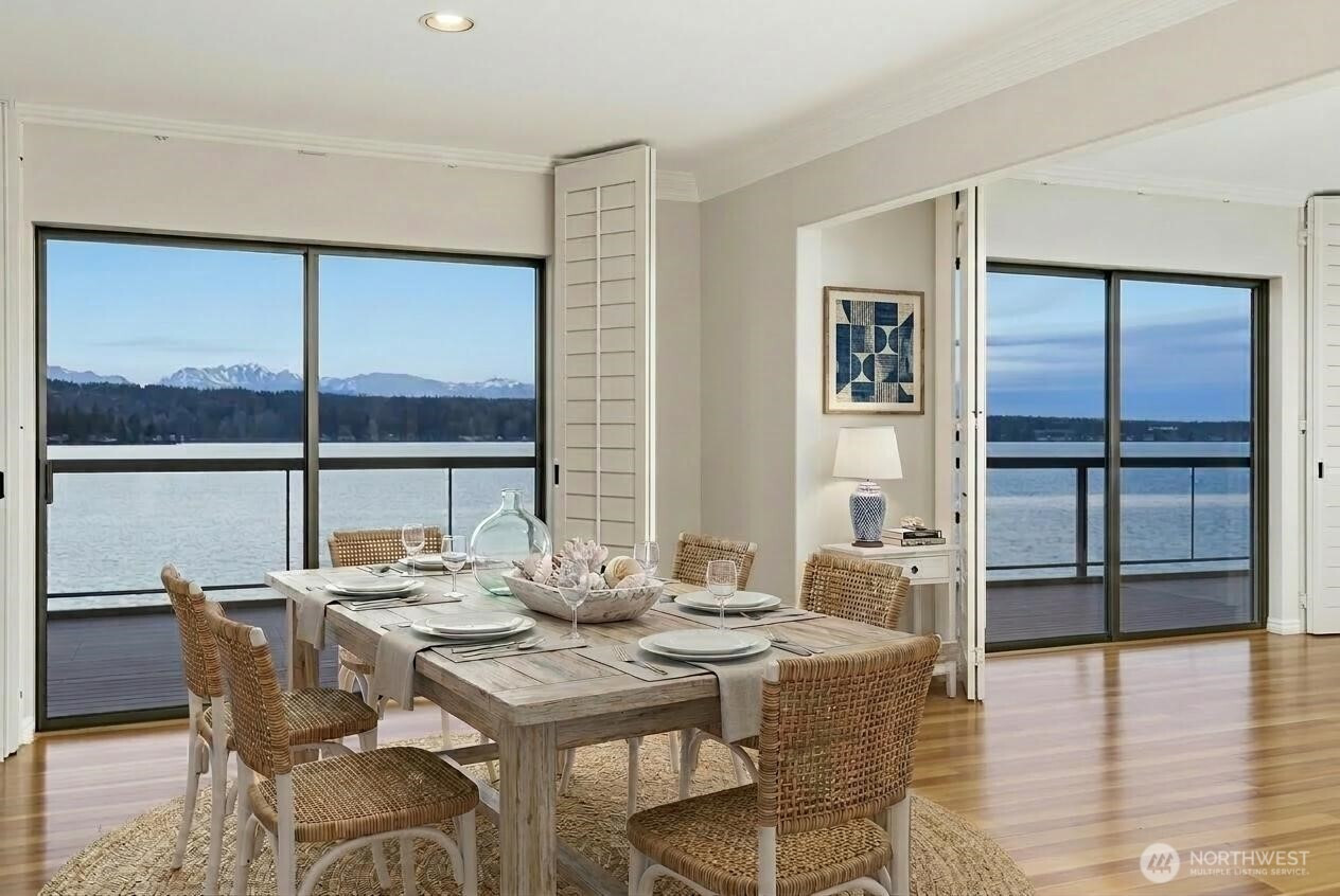 Nearly 100' of no bank waterfront, unobstructed views, this is quintessential Pacific NW living! Luxurious, spacious and unique 3-bedroom, +bonus room + den waterfront home with spectacular views of the Olympic Mountains. Enter across a tranquil koi pond into this striking two-story cedar and natural rock home featuring a dramatic 25-foot indoor waterfall & pond. Inside, enjoy a spacious kitchen with stainless steel appliances, cherry hardwood floors and a wine fridge. The wraparound living room has floor-to-ceiling windows showcasing sweeping Puget Sound and mountain views, filling the home with natural light. The family room is anchored by a black rock 6-foot flute wood-burning fireplace and has a wet bar. Plantation style shutters thru home. Main level includes: kitchen, 2 dining areas, living room, a primary suite w/bath, a convenient half bath, large laundry room and access to the attached two-car garage. Two primary suites provide excellent flexibility for guests or multi-generational living. The main-level primary suite features a private sauna, bath, and direct access to the deck, while the upper primary suite offers a five-piece bath and private balcony overlooking the bay.Outside, enjoy 80+ feet of no-bank waterfront from your large deck built over a stunning white crushed shell beach—an exceptionally rare setting. With 3,430 sq ft, no HOA, and a truly special waterfront lifestyle, this home is a private oasis.