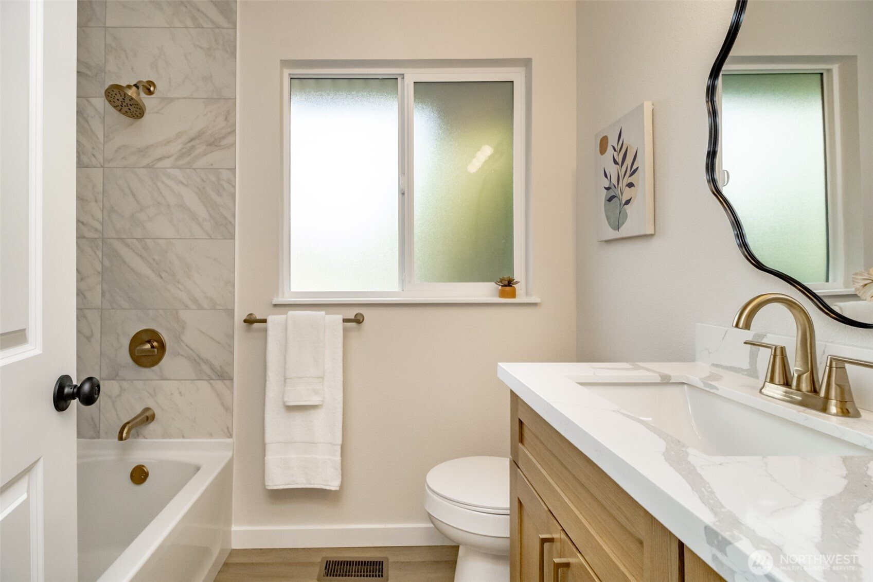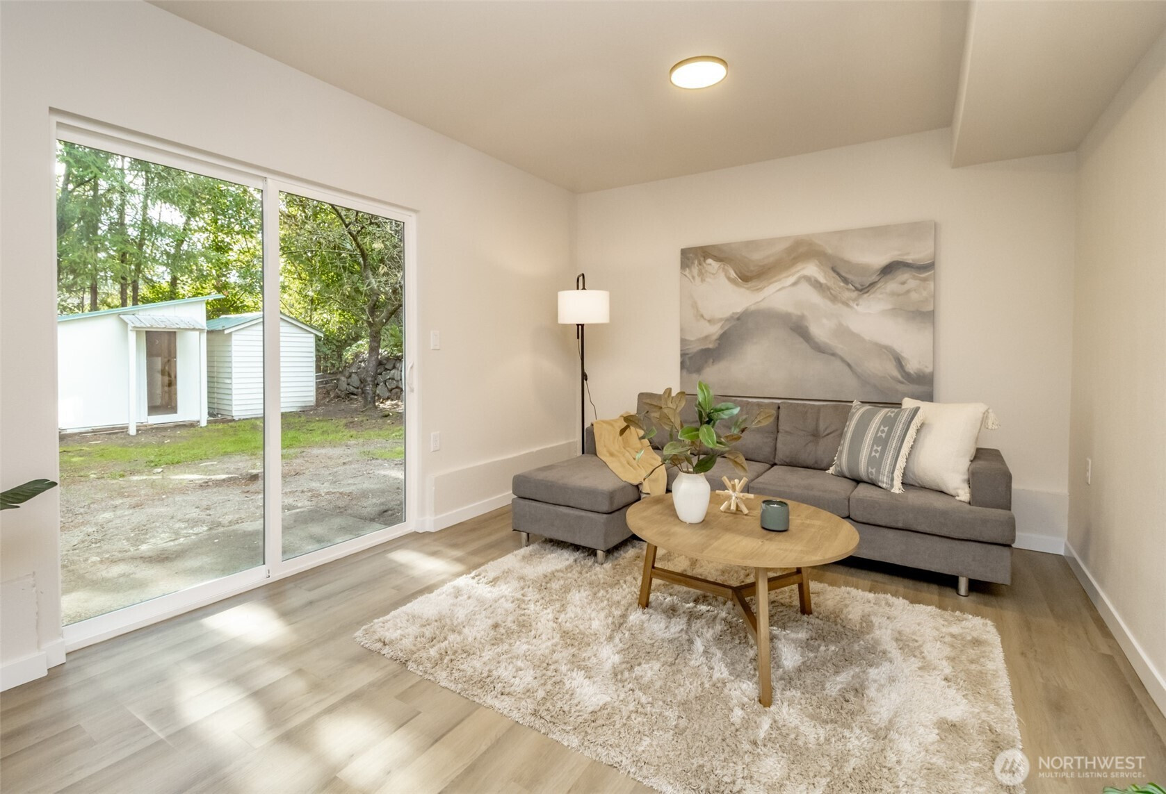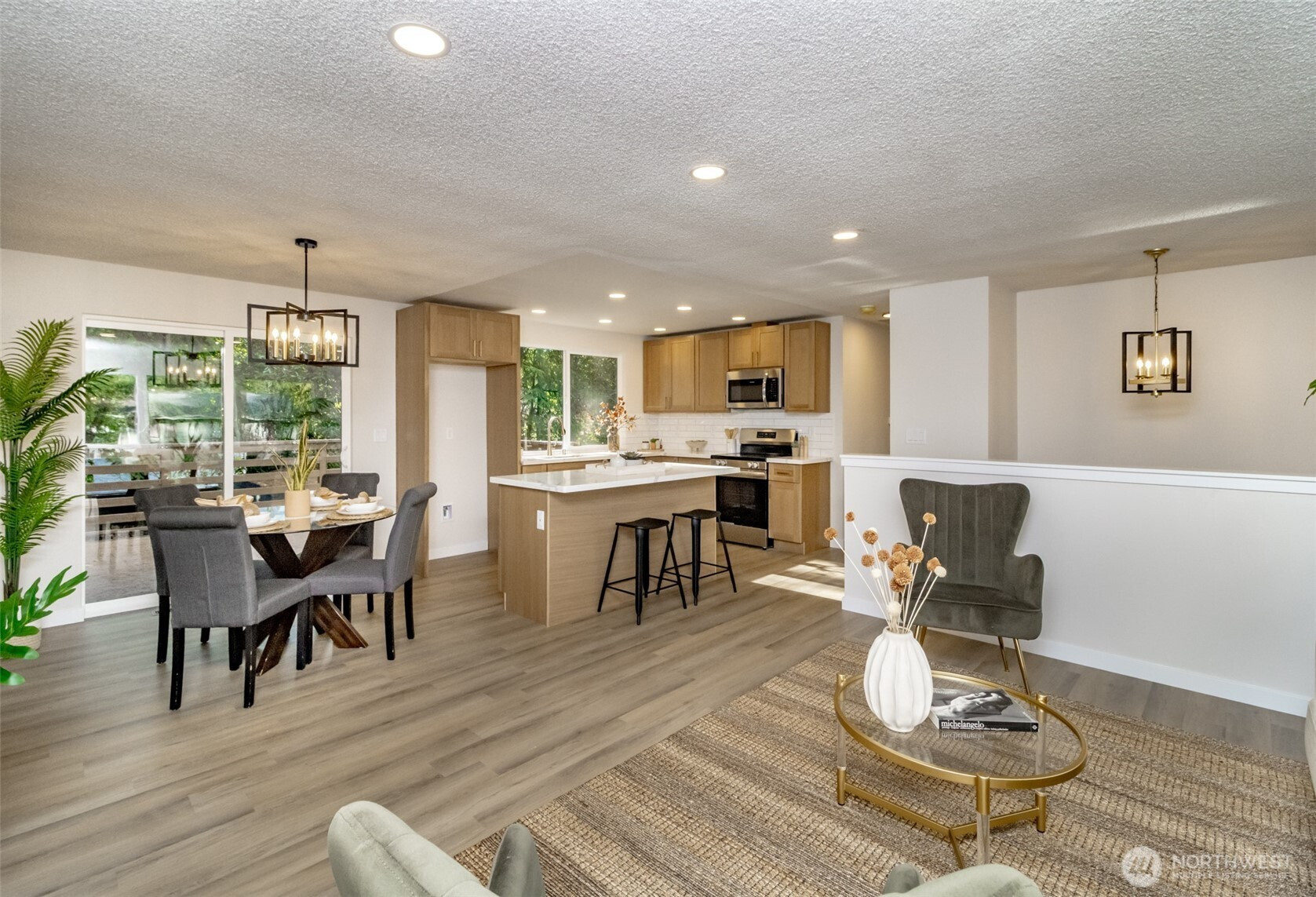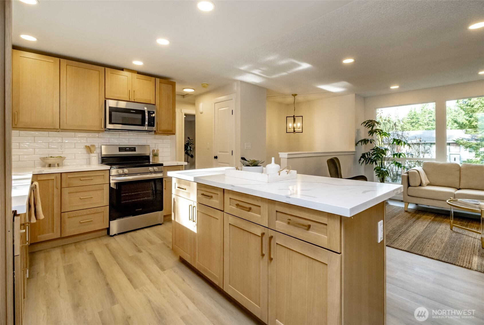 Beautiful 4-bedroom home in a quiet Port Orchard neighborhood! This custom-designed property features LVP flooring throughout, electric fireplace with custom oak slat wall paneling, & a bright open kitchen with an island, tile backsplash, stainless steel appliances, & stylish white oak cabinets. New carpet in all 4 bedrooms. The primary suite offers a white oak vanity with quartz countertop, LED lighted mirror, & a tiled shower surround & floor. Main upstairs bath includes a quartz countertop & tiled tub/shower surround. Downstairs, you’ll find a spacious rec room & a ¾ bath/laundry room. Fully fenced backyard with storage sheds & a nice deck off the dining room—perfect for entertaining. 2-car attached garage completes this impressive home!