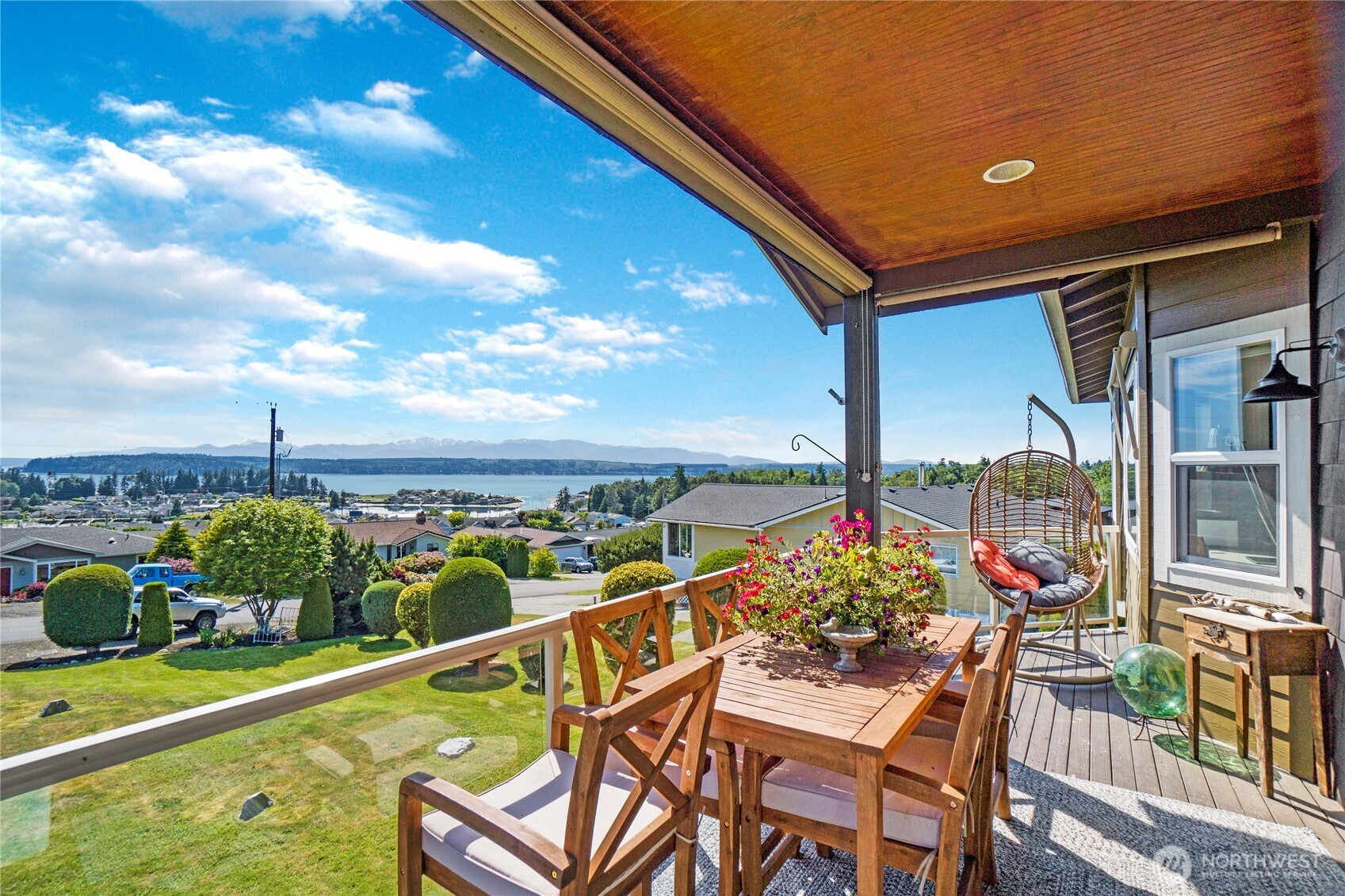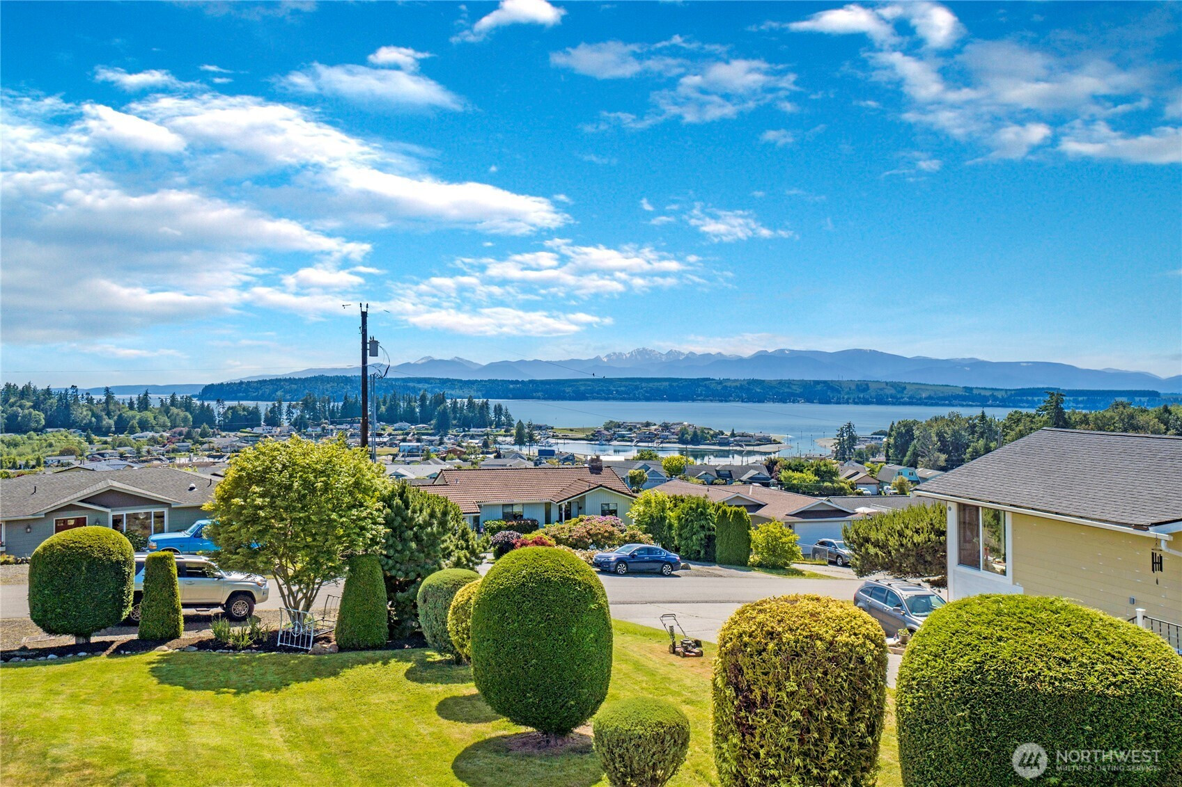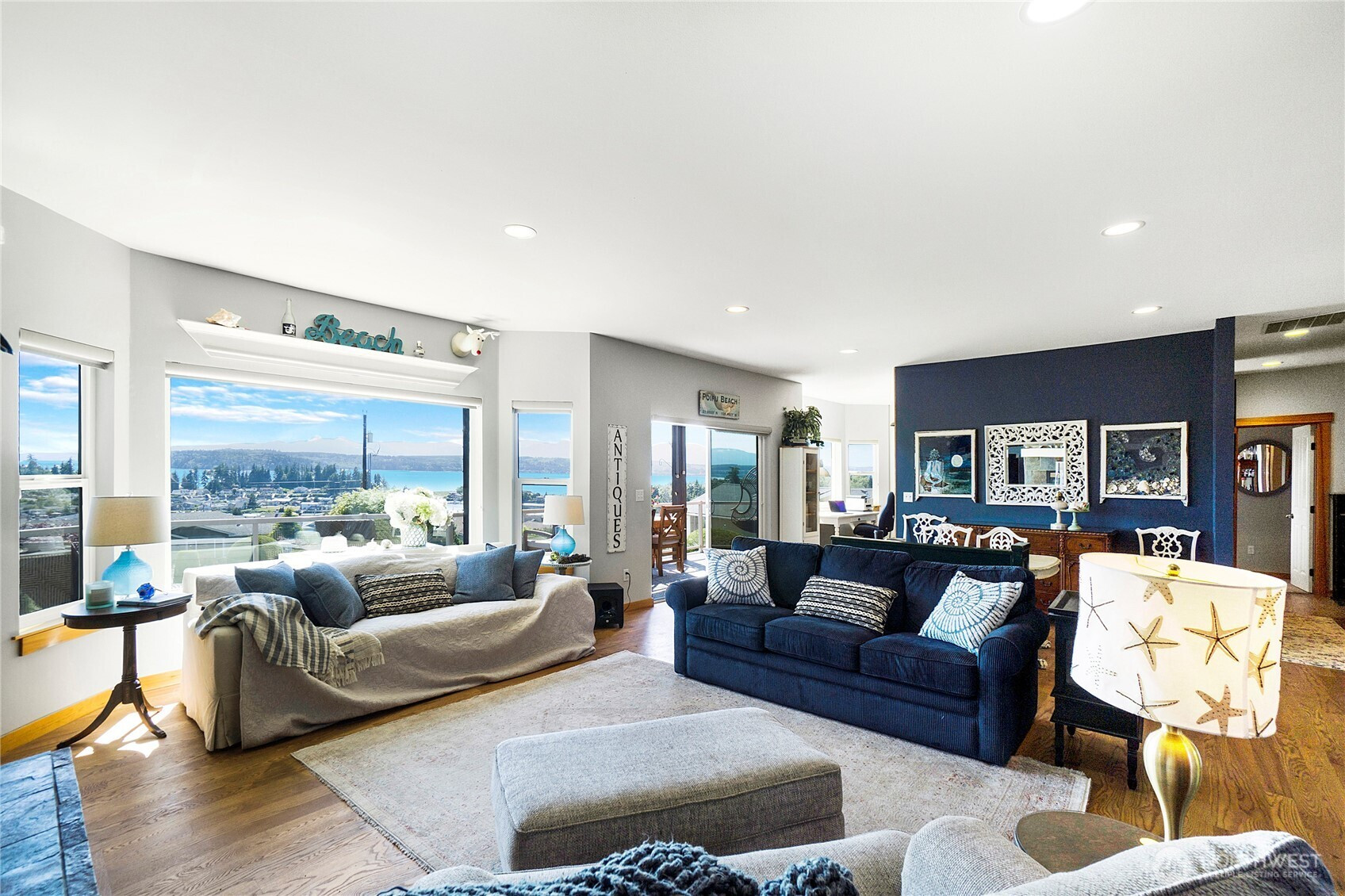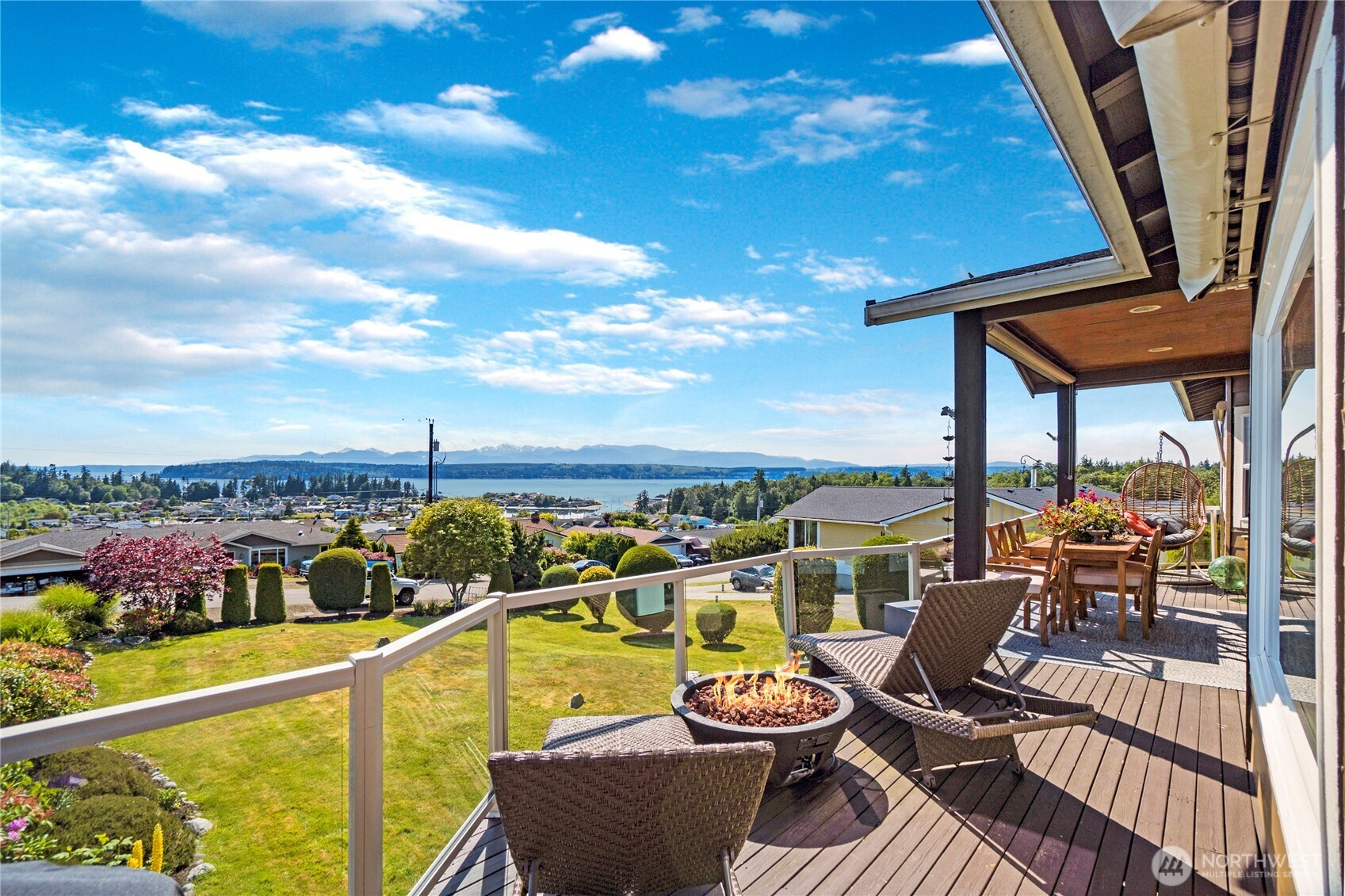 Enjoy breathtaking, unobstructed views of the Marina, Hood Canal, and Olympic Mountains—where sunsets are the highlight of each day! Designed to capture the scenery from every room, this home features 9-foot ceilings, expansive windows, and a spectacular partially covered deck for entertaining. Hardwood floors on the main with a great room, cozy gas fireplace and dining area. Spacious kitchen with great cabinet space, granite counters, and newer gas range/double oven. Cooking with this view will never get old! The main-floor primary suite offers a soaking tub, a walk-in closet, and fresh lighting. Convenient office on the main floor as well. The walkout daylight basement includes two bedrooms, a private laundry, and separate living spaces—ideal for multi-generational living or a caregiver. Unfinished basement space great for storage or workshop with exterior access. Driftwood Key amenities include a pool, clubhouse, dock, marina, and no-bank waterfront. Welcome to Hansville, where stunning views and waterfront living await!