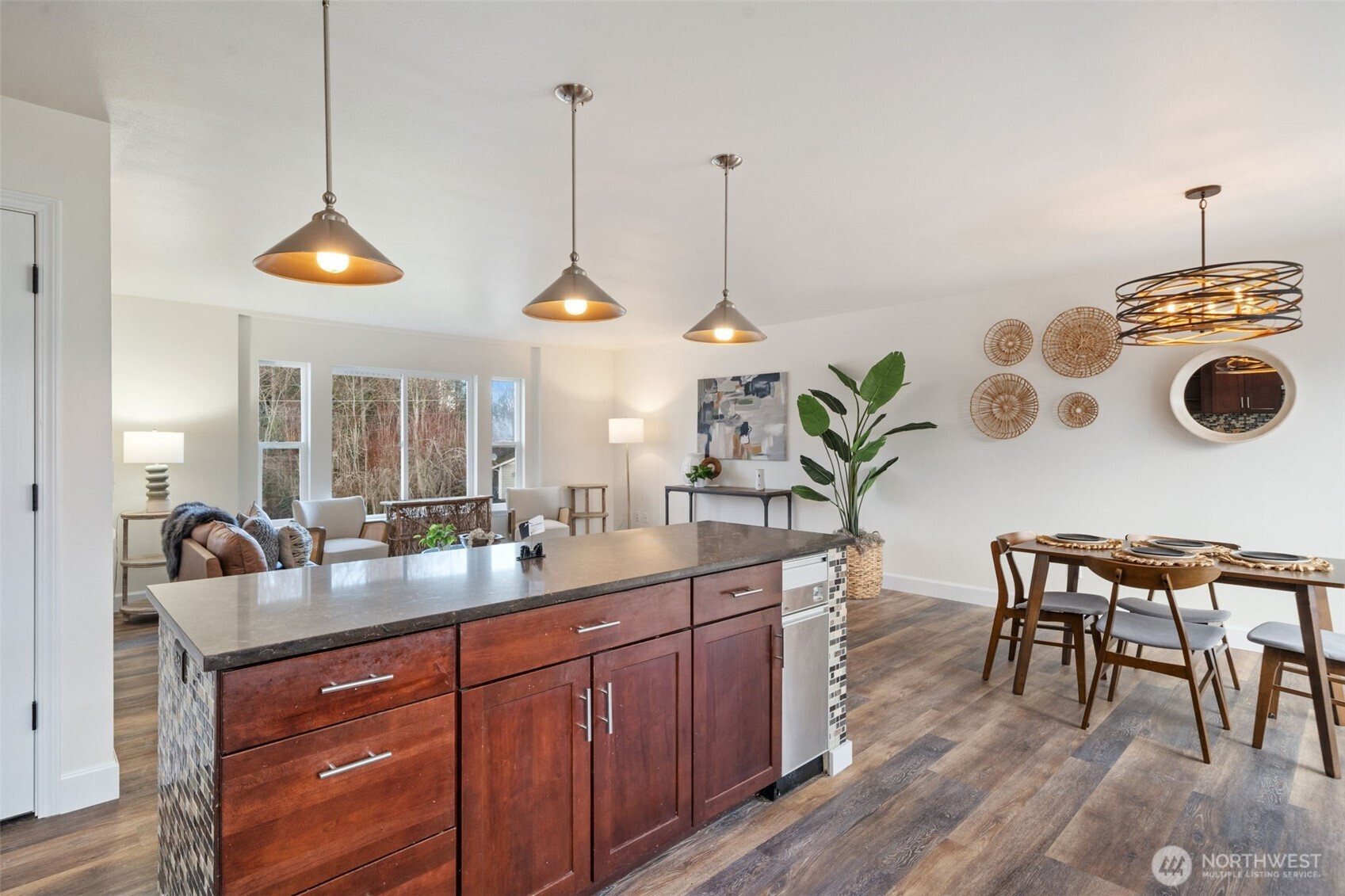 Fabulous Hansville home offering space, light, & lifestyle! This spacious home features a bright, open floor plan w/large windows that flood the home w/natural light. The beautiful kitchen showcases SS appliances, custom tile countertops, w/coordinating backsplash. From the dining area, step through the slider to the upper deck and enjoy peaceful views of the Olympic Mtns and the canal—perfect for morning coffee or evening sunsets. The generous primary suite includes a ¾ bath, complemented by a full hall bath for guests. The lower level offers a large family room w/flexible living space. Two-car garage plus a carport ideal for all your toys. Enjoy community amenities including a clubhouse, pool, marina, & sandy beach—PNW living at its best!