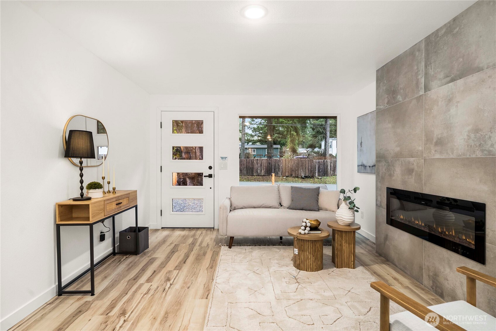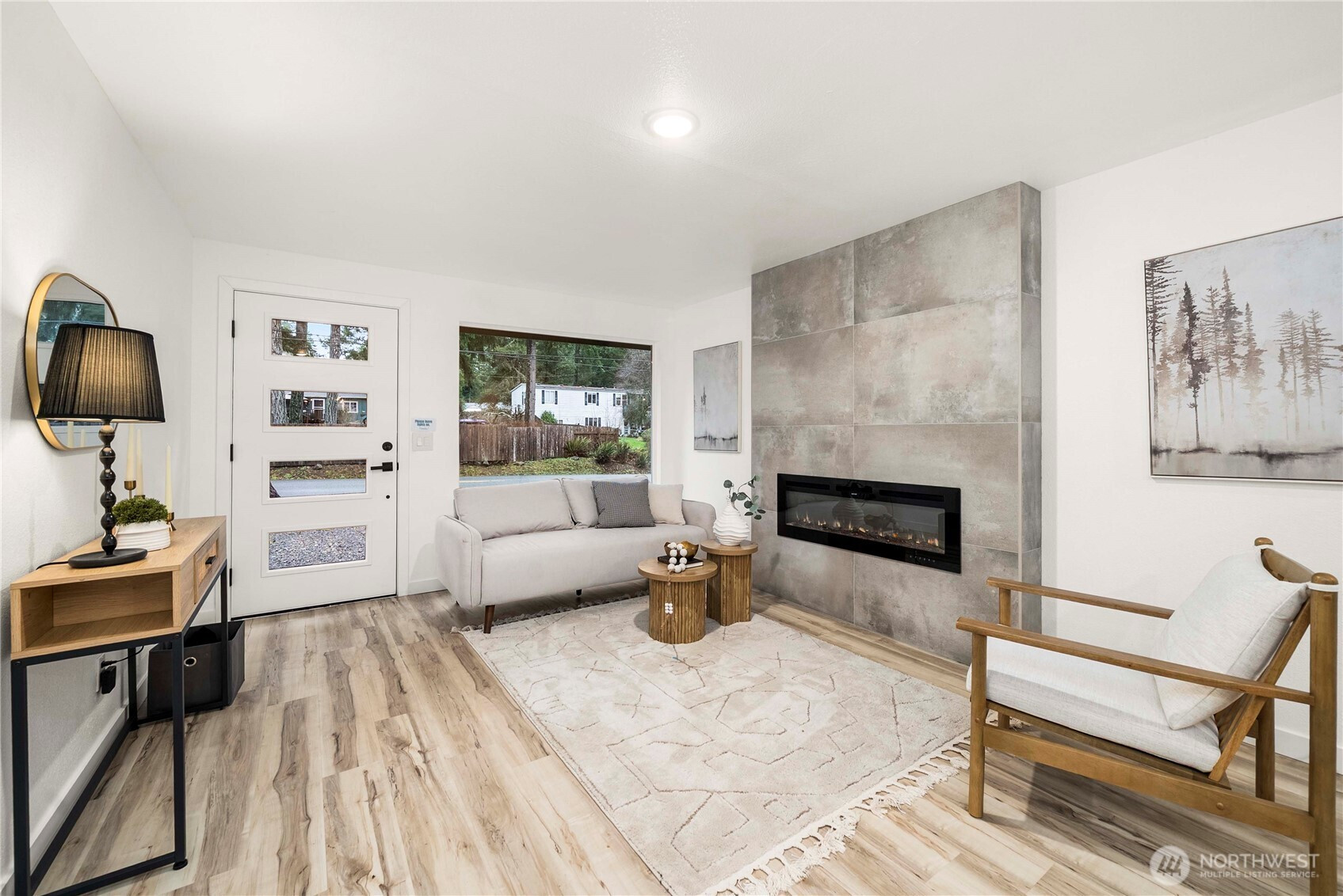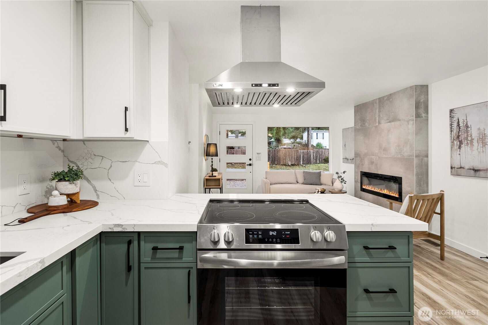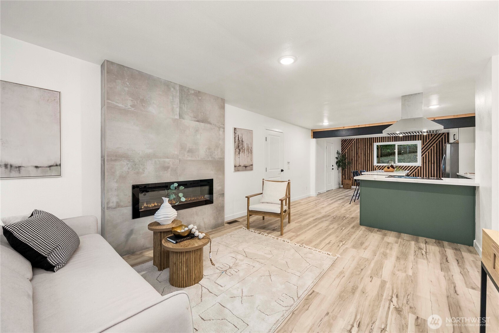 Fresh, modern, and completely move-in ready, this completely remodeled Port Orchard home lets you truly live in style from the moment you walk in. Stunning sage and white cabinetry, stainless appliances, quartz counters, a large island, luxury vinyl plank floors, and a custom wood-slat accent wall create a clean, contemporary look throughout. The sleek fireplace adds a cozy focal point in the living area, while the bright kitchen opens easily to the main living space. A covered patio and fully fenced yard extend your living outdoors, and the designer laundry room adds a thoughtful touch. With room to park a boat and an RV, this home is designed for both everyday living and adventure.