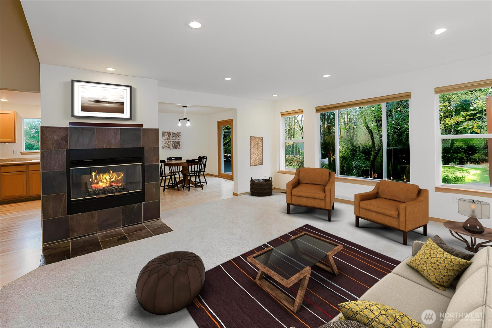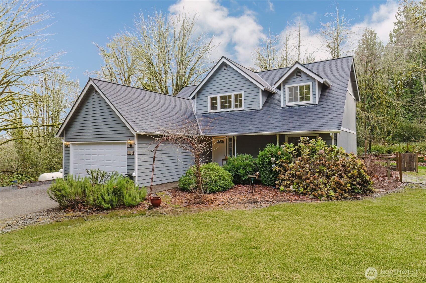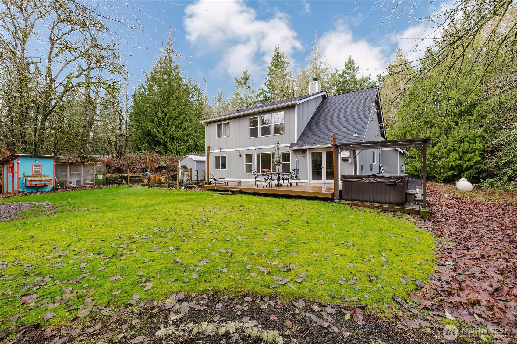 Experience the perfect harmony of modern design and Northwest style in this striking contemporary home, privately set on 2.3 serene acres. A dramatic soaring entry and beautiful flooring lead into light-filled, open-concept living spaces designed for both everyday comfort and effortless entertaining. The family room showcases a stunning wall of windows and a double-sided wood-burning fireplace shared with the dining area, creating a warm and inviting focal point. The open kitchen features a center island with cooktop, stainless steel appliances, and a generous pantry. French doors extend the living space to an expansive deck complete with a hot tub—perfect for gatherings or peaceful evenings under the stars. Upstairs, a flexible loft offers space for a media room, home office, or creative retreat. The primary suite is a true escape with dual vanities, a soaking tub, separate shower, and a walk-in closet with custom built-ins. Outdoor amenities include a firepit, raised garden beds, garden shed, and ample RV parking. Complete with a two-car garage and generator wiring, this exceptional property delivers comfort, versatility, and a tranquil connection to nature.