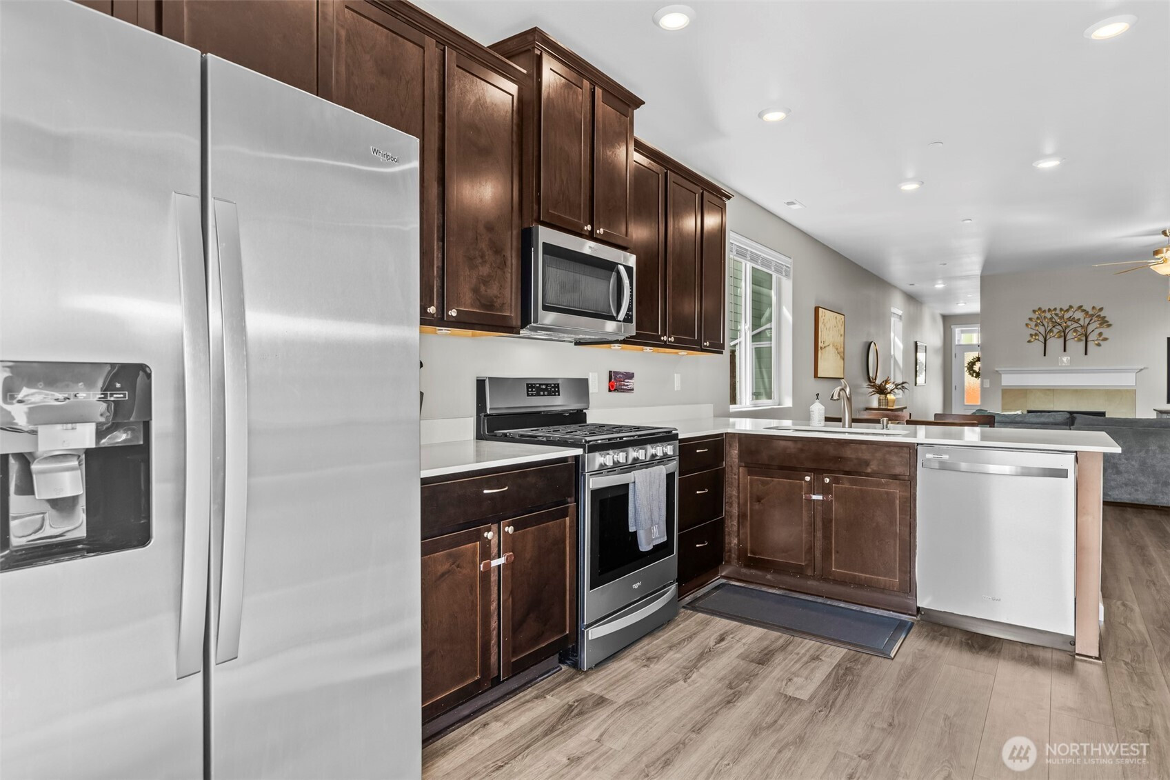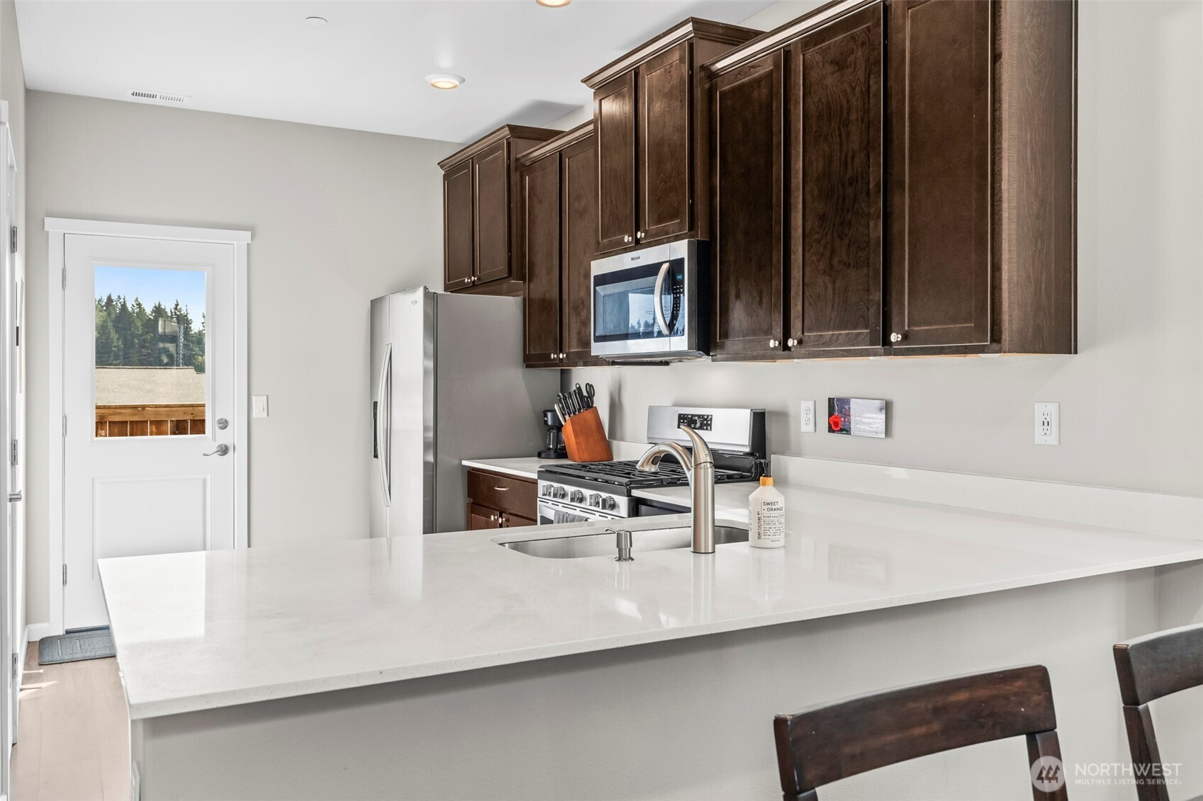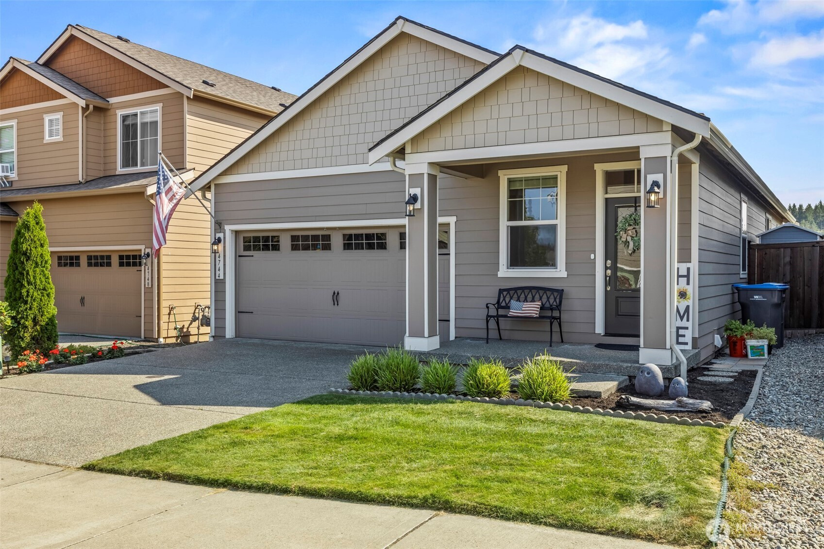 Rare find...built in 2020, this newer home offers 1 level living and is located in the popular Bay Vista community where you have quick access to the Seattle ferry or a short drive to both Bangor & the Navy Shipyard. This home has 3 bedrooms, 2 bathrooms and a 2 car garage with an open floorplan featuring a kitchen with quartz countertops, stainless appliances including gas range and fridge plus a walk-in pantry. Kitchen overlooks the dining space and family room with a gas fireplace keeping this space cozy and warm. Primary bedroom fits a king size bed with plenty of room, walk-in closet and an ensuite with tile walk-in shower. Washer/Dryer stay too! With no home behind, you can enjoy the outdoor space on your wrap around deck. Come see!