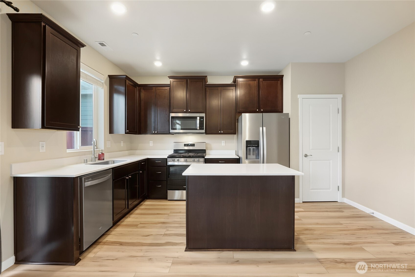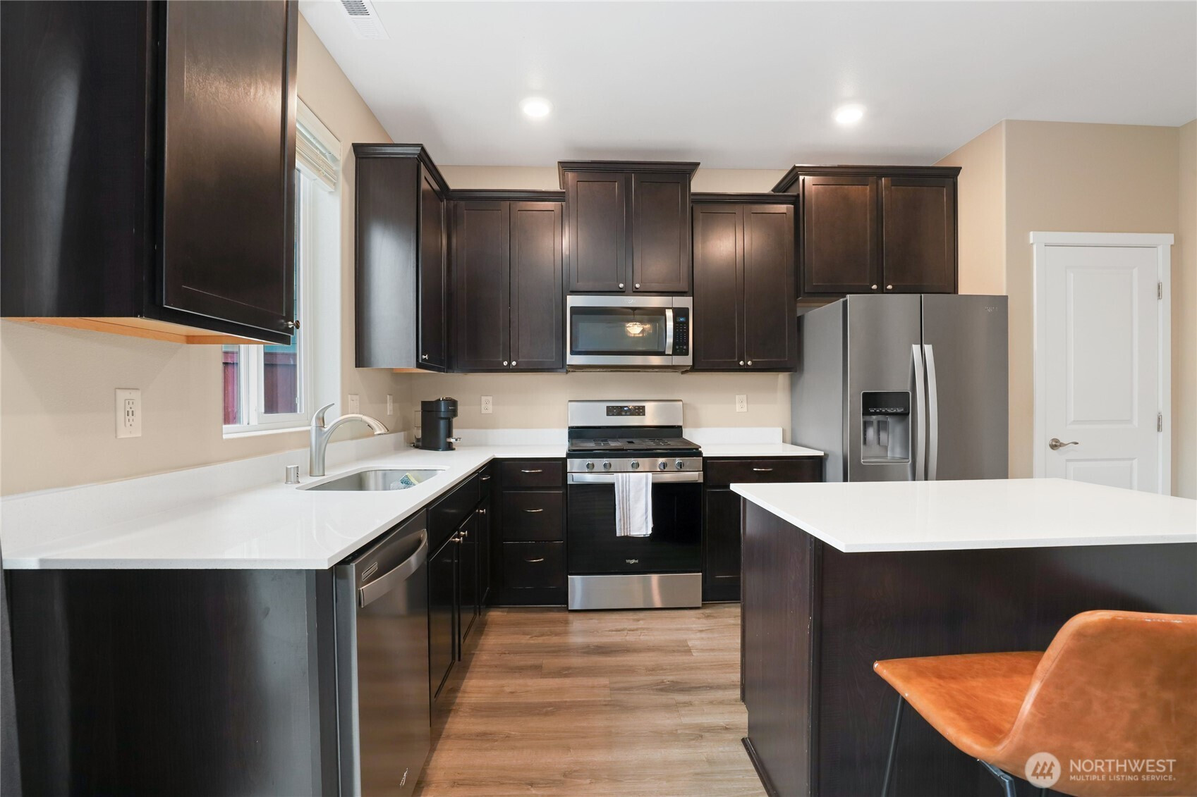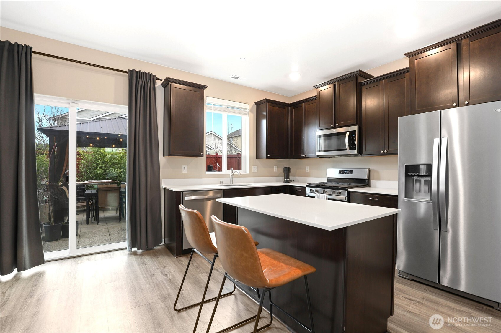 (503) 893-8874Welcome home to this beautifully designed two-story residence offering generous space for everyday living and memorable gatherings. The open-concept main level creates a seamless flow, with durable plank flooring connecting the kitchen, dining area, and great room. At the center, the kitchen features a quartz-topped island perfect for casual meals or entertaining, complemented by 42-inch cabinetry and sleek stainless steel Whirlpool appliances. Natural light fills the living area, enhancing the warm and inviting atmosphere throughout. Step outside to a covered patio overlooking a fully fenced backyard, ideal for outdoor dining, relaxation, or year-round enjoyment. Upstairs, the spacious primary retreat offers a well-appointed bath and a large walk-in closet with ample storage. A versatile loft provides flexible space for a home office, creative studio, or bonus area. Recent updates include brand new flooring, along with a newer refrigerator and microwave. An ADT alarm system adds convenience and peace of mind. Ideally located near the ferry terminal, Bremerton, Bangor, and major commuter routes, this move-in ready home offers comfort, functionality, and accessibility in one well-rounded package.