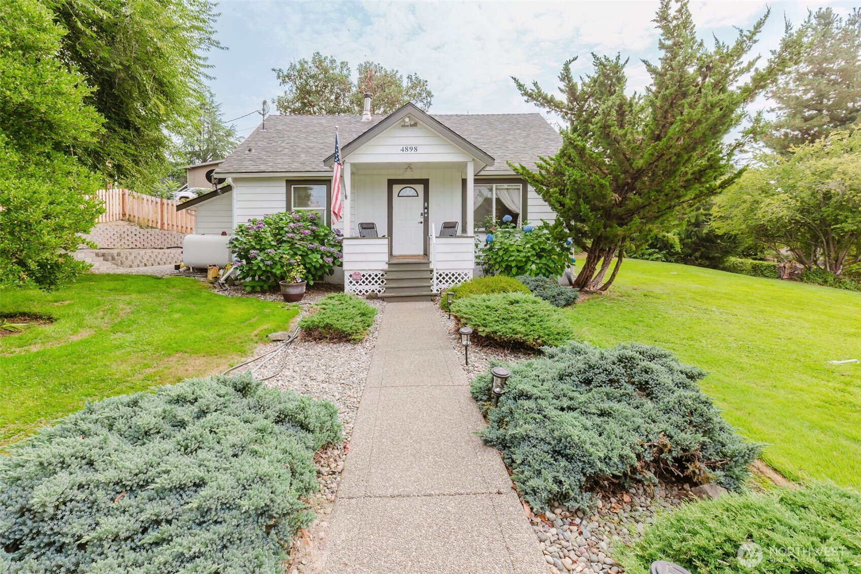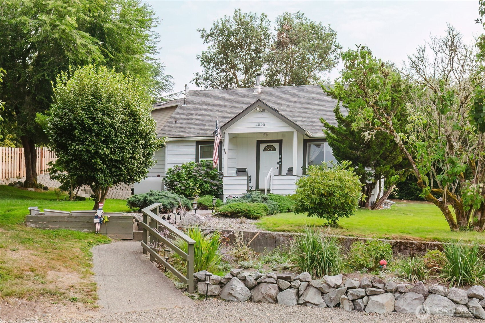 Welcome to a picture-perfect Craftsman nestled on a sunny hilltop, offering views of mountains, city skyline & the bay. Set on a roomy .58-acre lot, blending vintage charm & modern updates ~truly "Home Sweet Home" for 1st time buyers or downsizers alike! Renewed throughout w/new kitchen, Corian counters, stainless steel appliances, remodeled bath w/tiled shower, newer windows, roof, heat pump/furnace. Coved ceilings, tile floors, handy mud room, laundry room & clean unfinished basement for storage. Covered front porch framed by blooming hydrangeas ~just add rocking chairs! Mature landscaping, fruit trees & sunny private yard. Has been a short-term rental. A rare gem ~ a peaceful retreat w/easy access to town & a setting that never gets old!