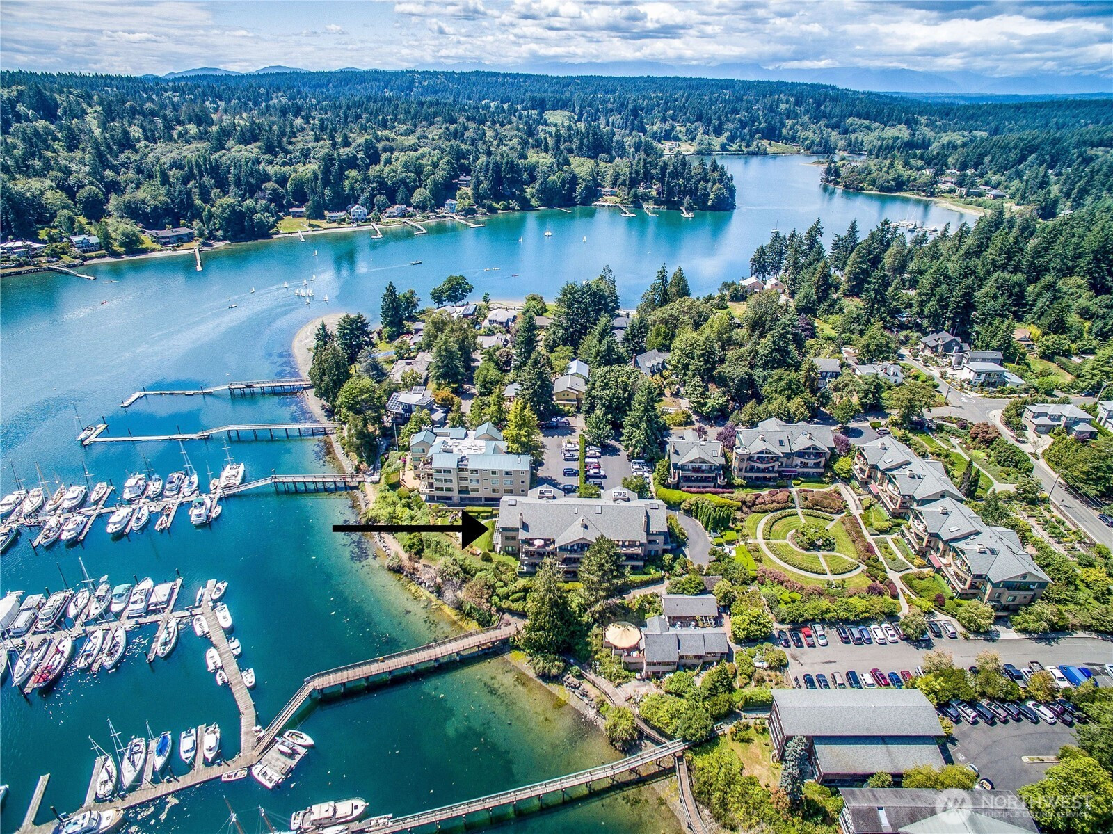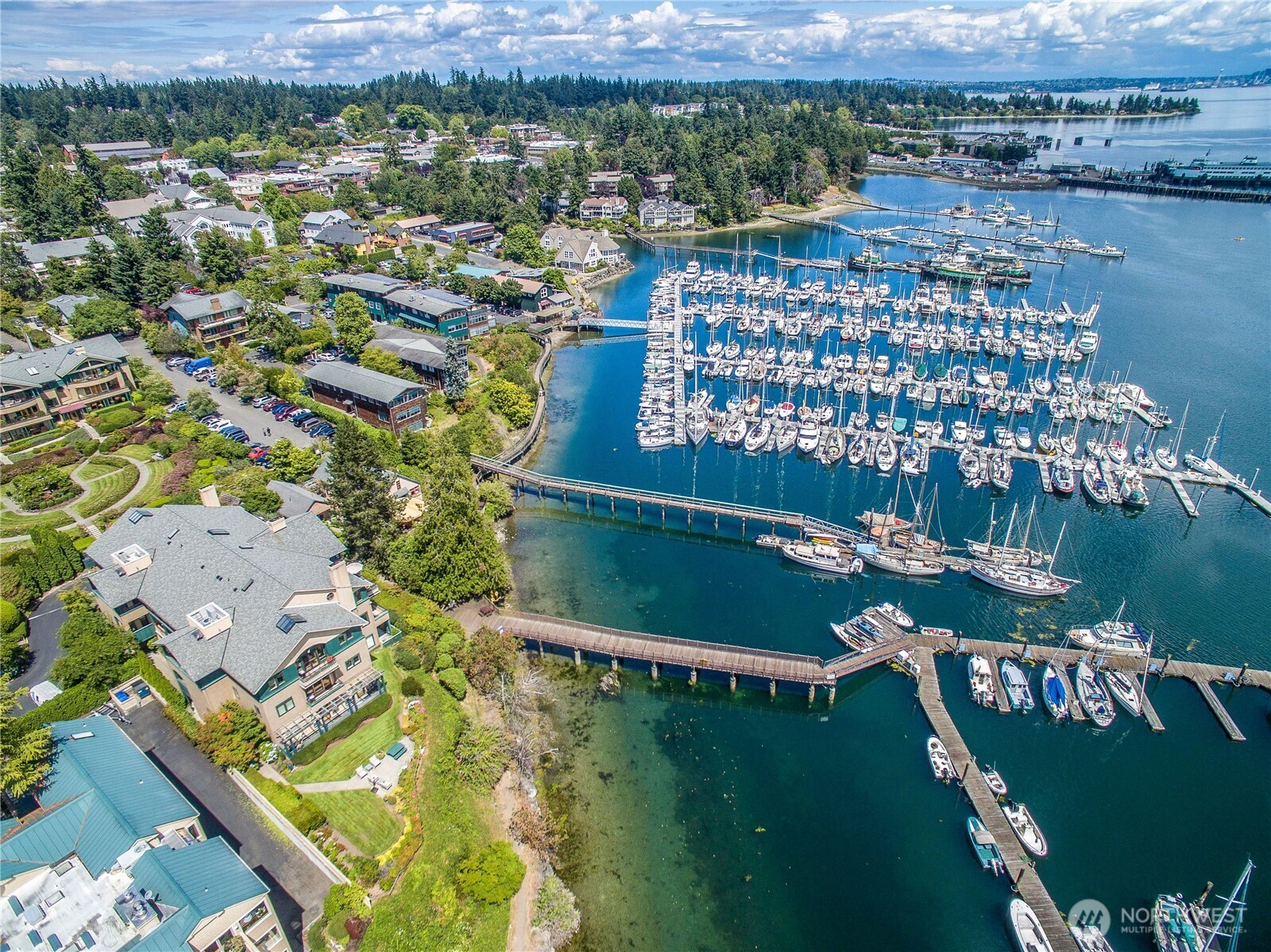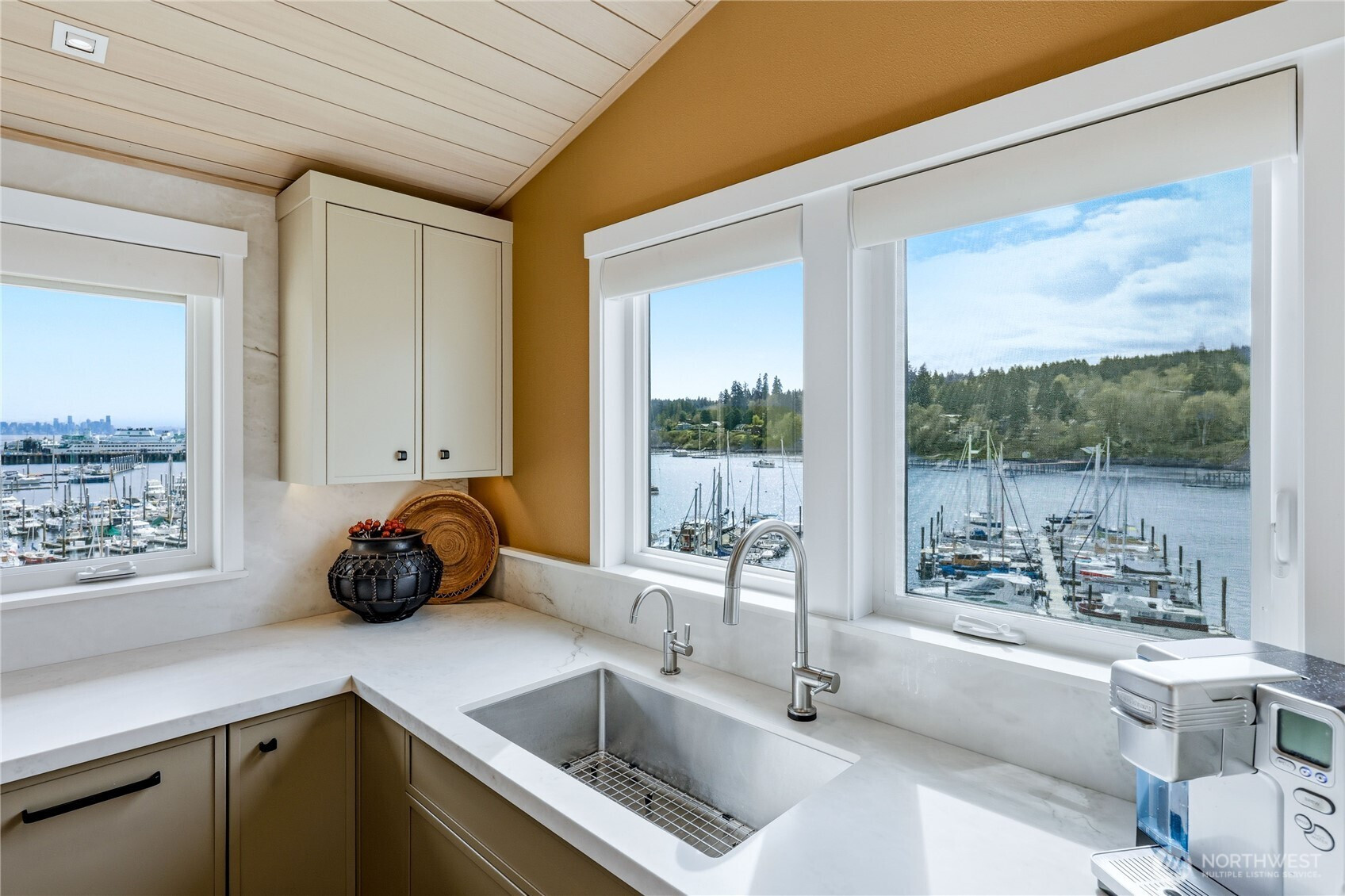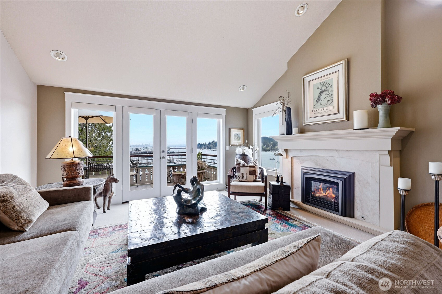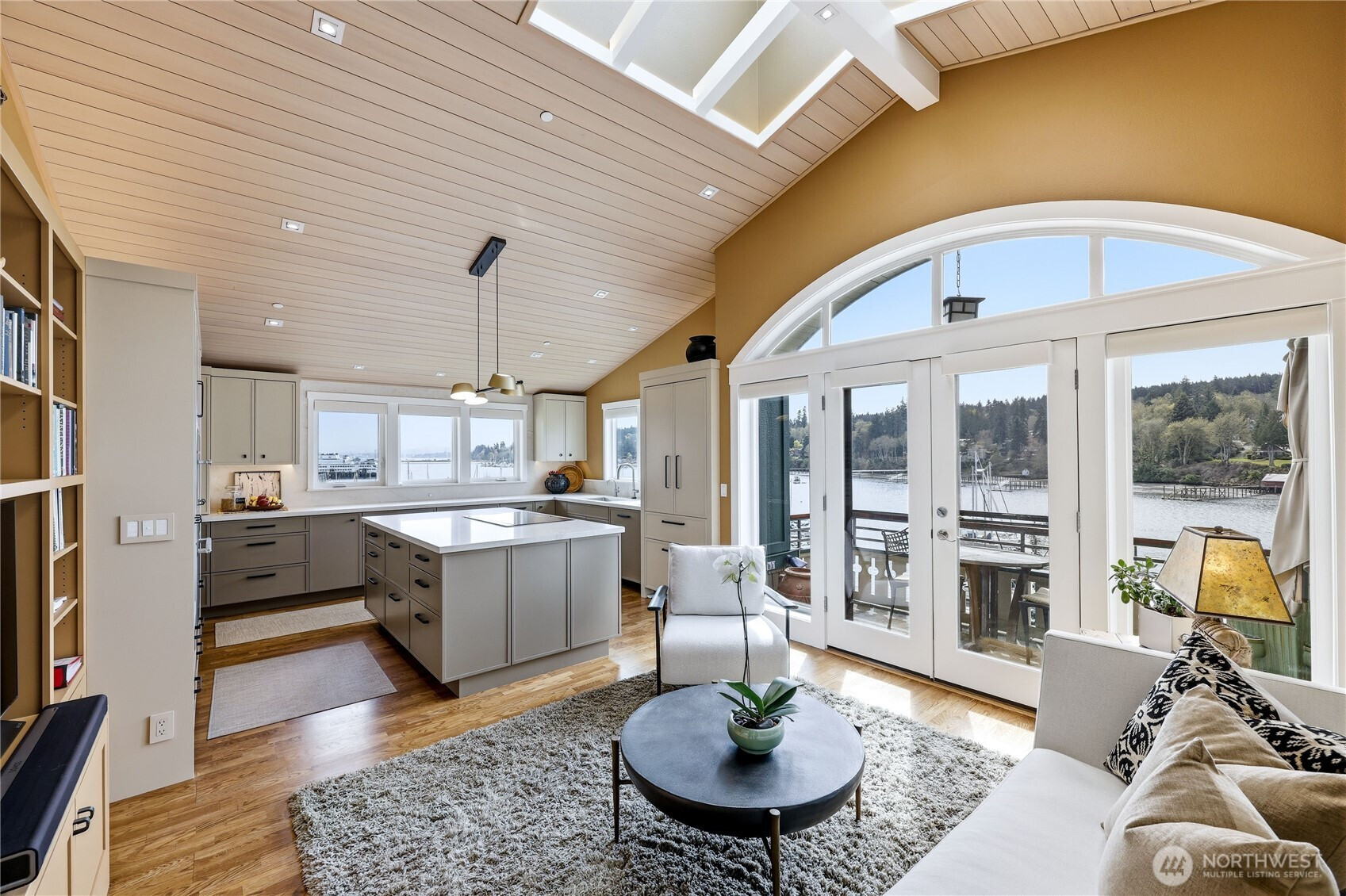 Wake each morning to shimmering water, sailboats drifting across Eagle Harbor, and the Seattle skyline rising in front of the Cascades. Close to Winslow for coffee, dinner out, or the Seattle ferry. This rare waterfront penthouse condominium offers a front-row seat to the rhythms of the marina and the quiet beauty of Bainbridge Island living. Sunlight pours through expansive windows and vaulted ceilings, while French doors invite you to step out on one of the balconies and take it all in. Thoughtfully reimagined, this home blends warmth and sophistication with a fully remodeled kitchen featuring Thermador appliances, custom cabinetry, sintered stone countertops from Spain, and a striking hemlock ceiling with a beamed skylight. The serene primary suite includes a spa-like bath with heated floors, handmade mosaic tile and a Kohler walk-in tub. Every detail supports comfort and ease- from an elevator that opens right into your front entry, custom built-ins and California closets to upgraded systems such as a heat pump, HEPA filtration and solar back-up power. A home that feels both elevated and grounded - where every day begins and ends with the water, the best of Winslow is just outside your door.