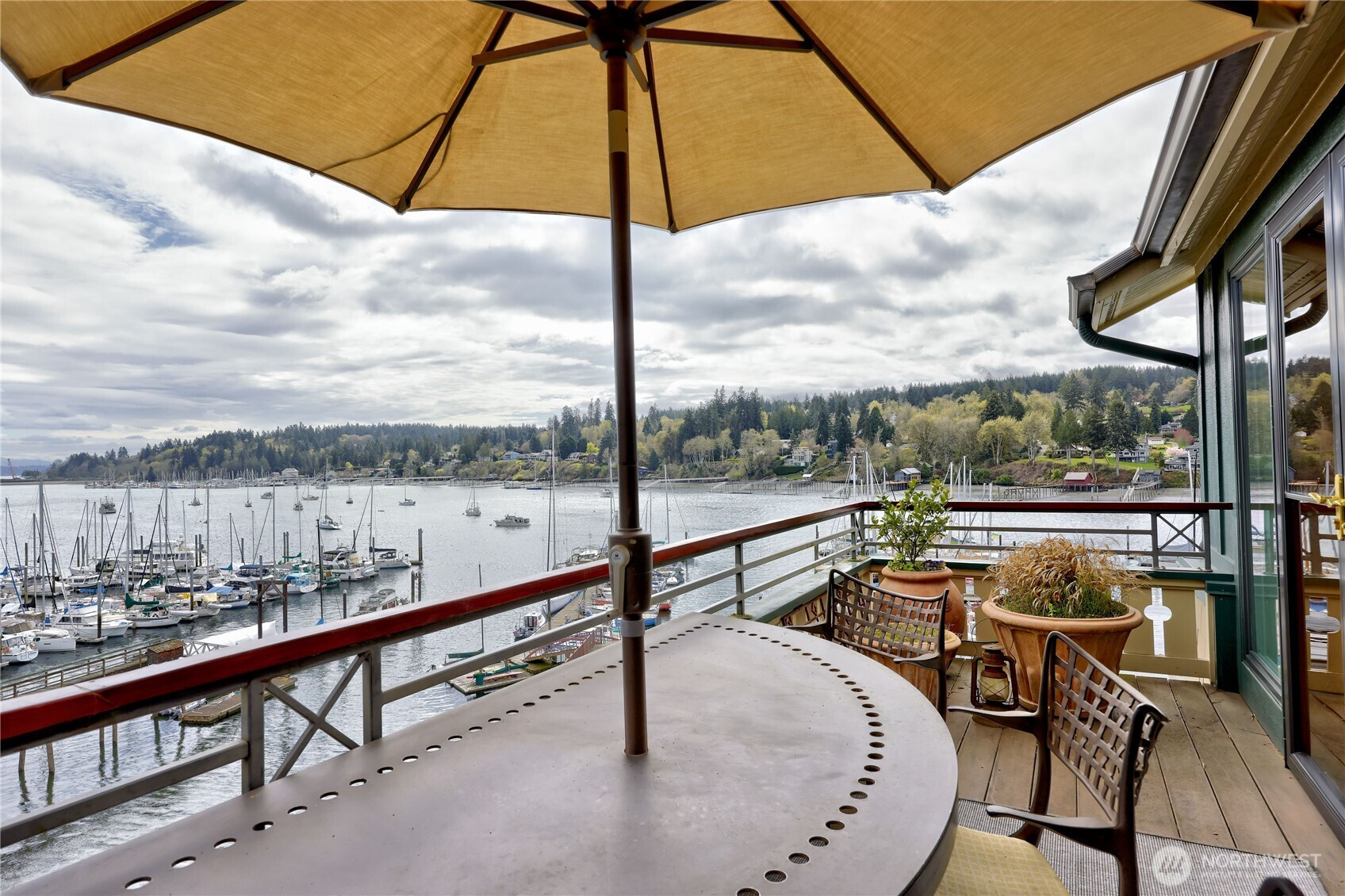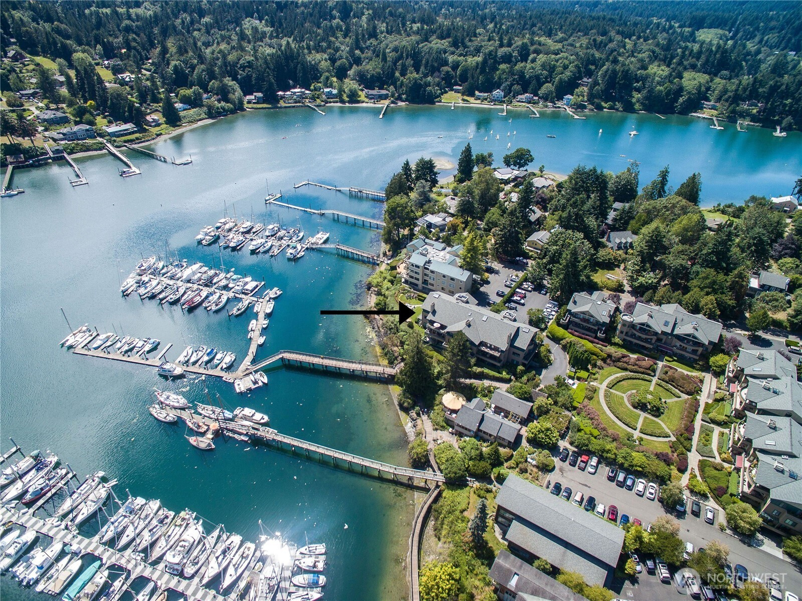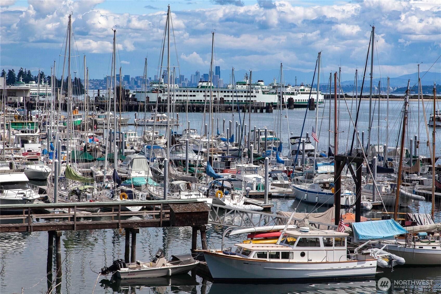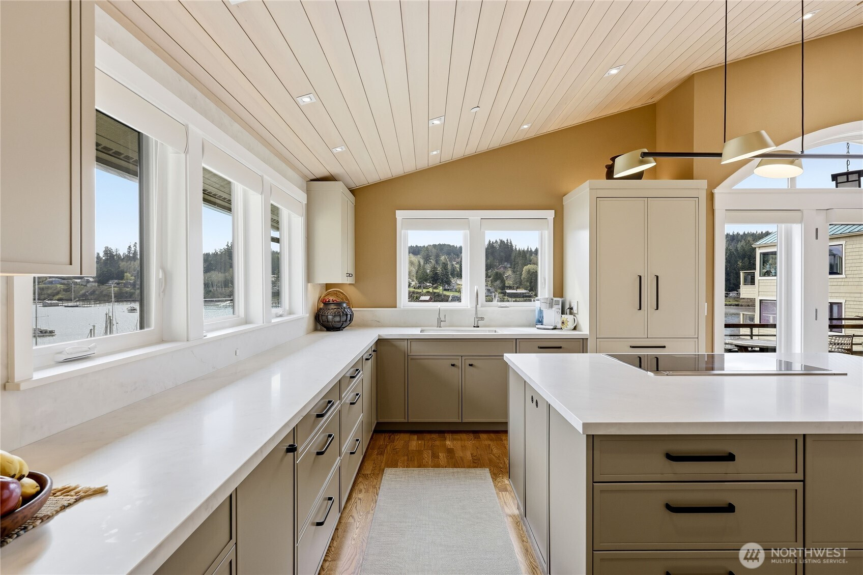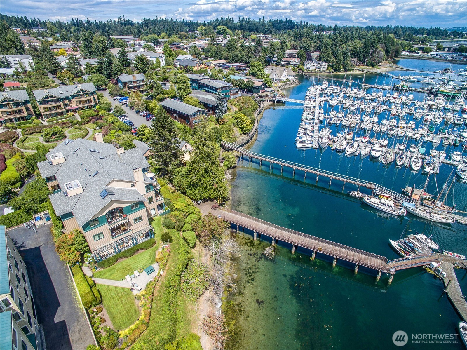 Wake each morning to shimmering water, sailboats drifting across Eagle Harbor, and the Seattle skyline rising in front of the Cascades. Close to Winslow for coffee, dinner out, or the Seattle ferry. This rare waterfront penthouse condominium offers a front-row seat to the rhythms of the marina and the quiet beauty of Bainbridge Island living. Sunlight pours through expansive windows and vaulted ceilings, while French doors invite you to step out on one of the balconies and take it all in. Thoughtfully reimagined, this home blends warmth and sophistication with a fully remodeled kitchen featuring Thermador appliances, custom cabinetry, sintered stone countertops from Spain, and a striking hemlock ceiling with a beamed skylight. The serene primary suite includes a spa-like bath with heated floors, handmade mosaic tile and a Kohler walk-in tub. Every detail supports comfort and ease- from an elevator that opens right into your front entry, custom built-ins and California closets to upgraded systems such as a heat pump, HEPA filtration and solar back-up power. A home that feels both elevated and grounded - where every day begins and ends with the water, the best of Winslow is just outside your door.