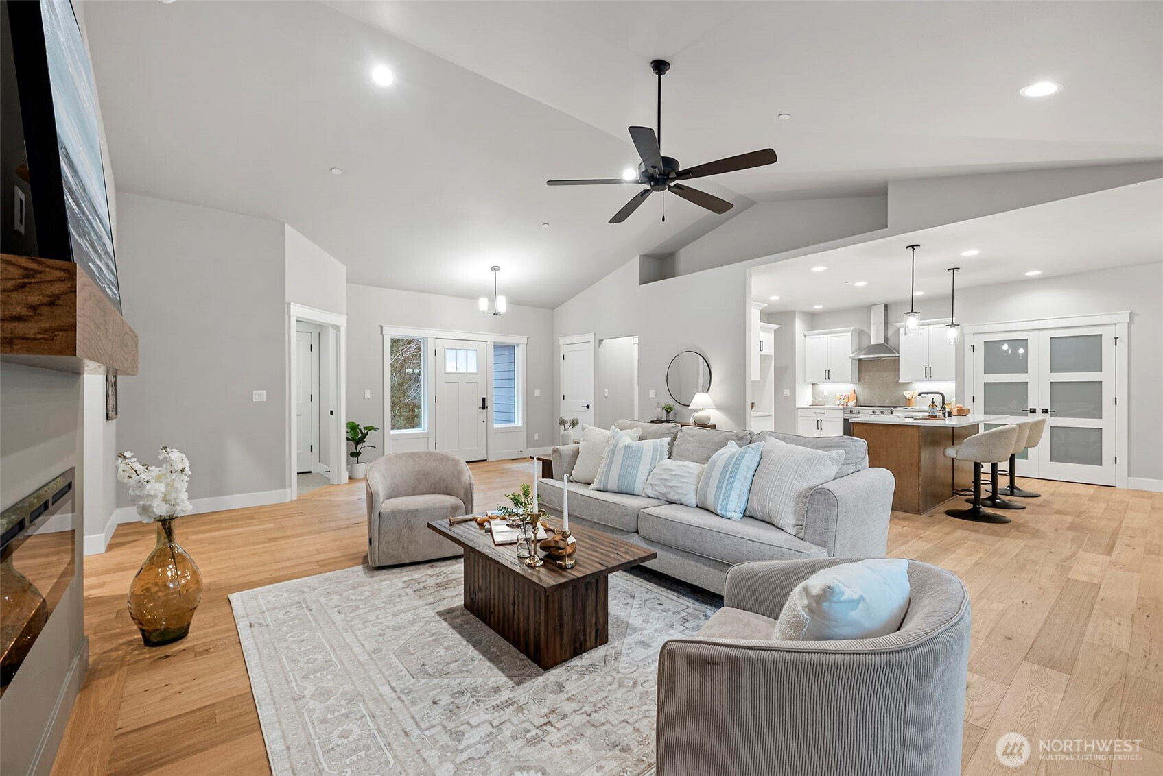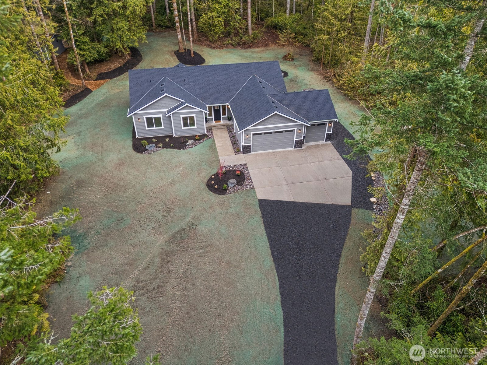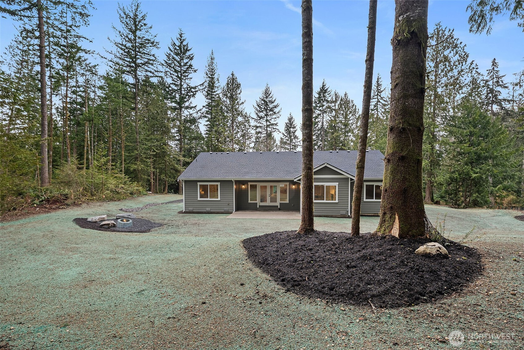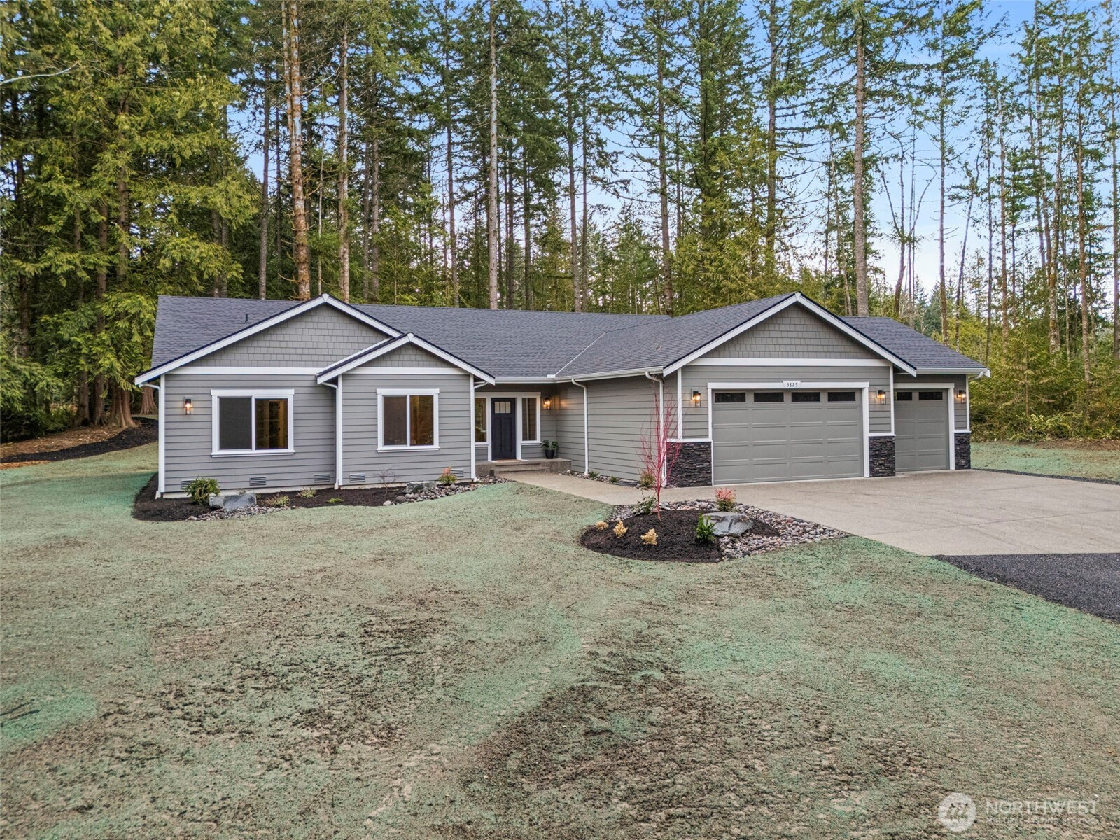 Stunning new construction rambler by Eagle Homes, ideally situated on 2.5 acres in a peaceful rural setting with convenient access to town. This thoughtfully designed 3-bedroom, 2-bath home with den blends modern luxury with timeless Northwest charm. Rich hardwood floors, beautifully painted millwork and quality craftsmanship shine throughout. The spacious great room features an electric fireplace and flows seamlessly into the open-concept kitchen, complete with quartz countertops, under cabinet lighting, and stainless steel Whirlpool appliances. The private primary suite is a true retreat, offering a spa inspired bath with a freestanding soaking tub, walk-in shower, and oversized walk-in closet. A forced air heat pump with A/C ensures year-round comfort, and 3 car garage provides generous storage. Outside, enjoy the tranquil setting, complete with backyard patio & a beloved NW fire pit area. With ample space for your RV parking, boat, or other toys, this property offers flexibility and room to breathe. This home is truly a gem!