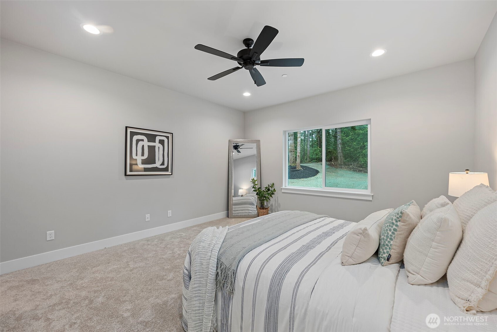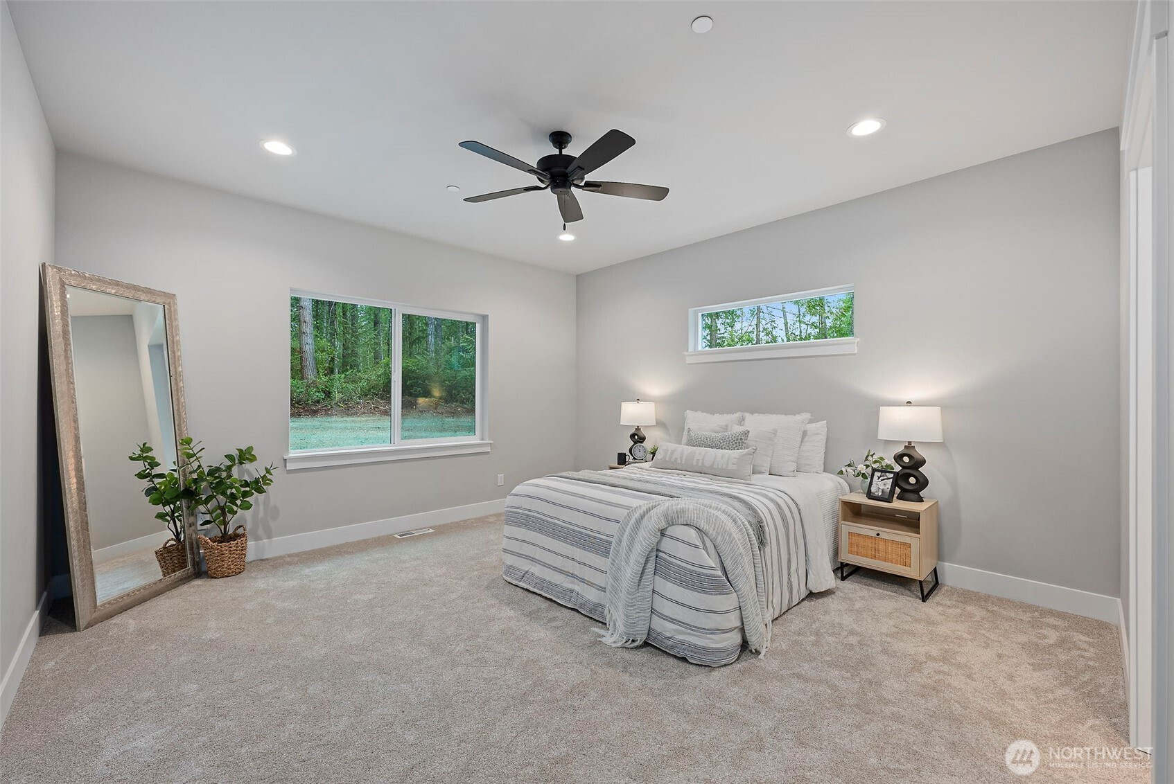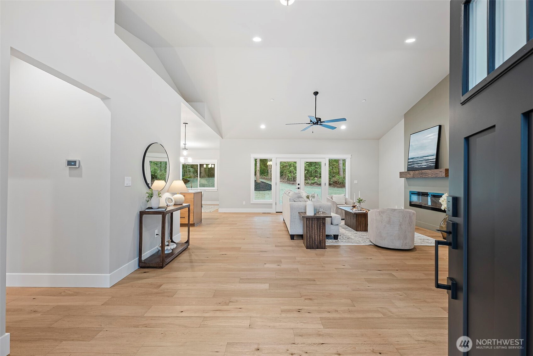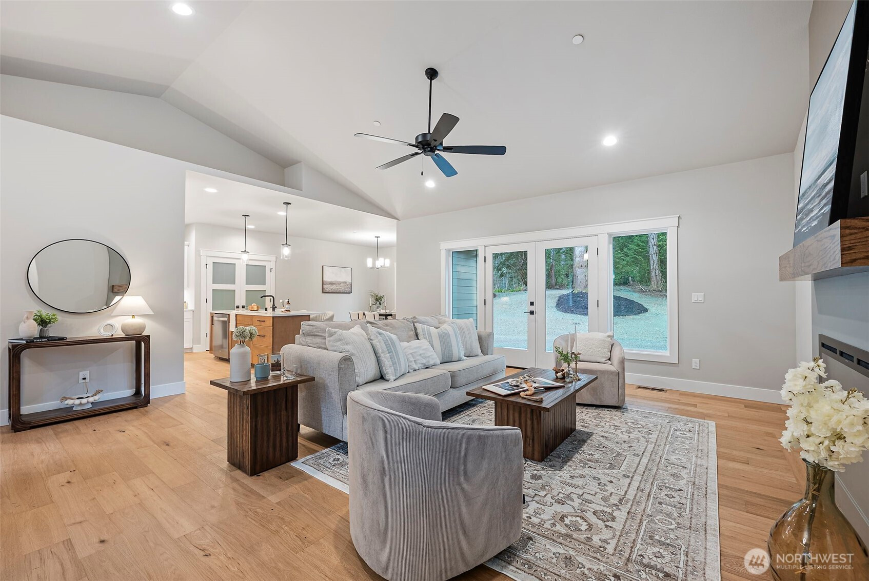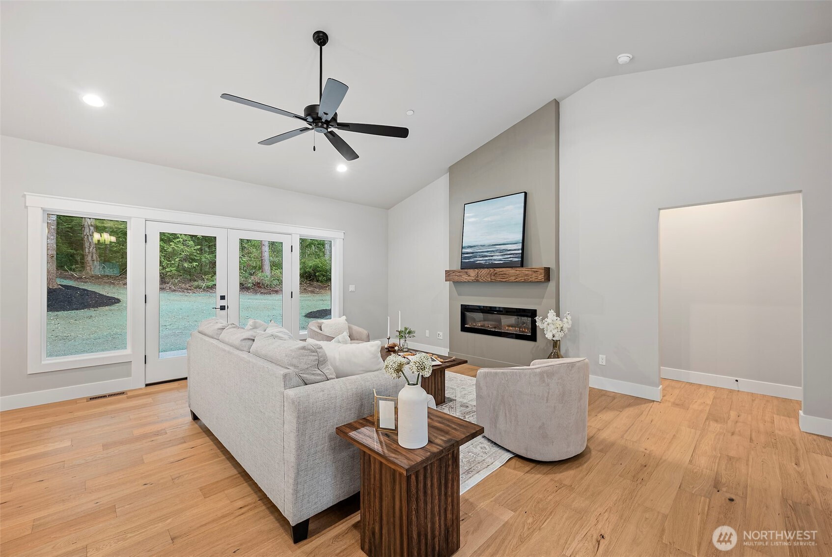 Stunning new construction rambler by Eagle Homes, ideally situated on 2.5 acres in a peaceful rural setting with convenient access to town. This thoughtfully designed 3-bedroom, 2-bath home with den blends modern luxury with timeless Northwest charm. Rich hardwood floors, beautifully painted millwork and quality craftsmanship shine throughout. The spacious great room features an electric fireplace and flows seamlessly into the open-concept kitchen, complete with quartz countertops, under cabinet lighting, and stainless steel Whirlpool appliances. The private primary suite is a true retreat, offering a spa inspired bath with a freestanding soaking tub, walk-in shower, and oversized walk-in closet. A forced air heat pump with A/C ensures year-round comfort, and 3 car garage provides generous storage. Outside, enjoy the tranquil setting, complete with backyard patio & a beloved NW fire pit area. With ample space for your RV parking, boat, or other toys, this property offers flexibility and room to breathe. This home is truly a gem!