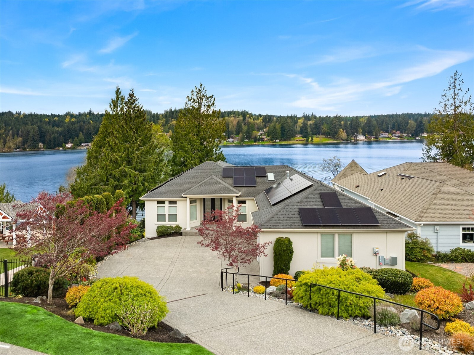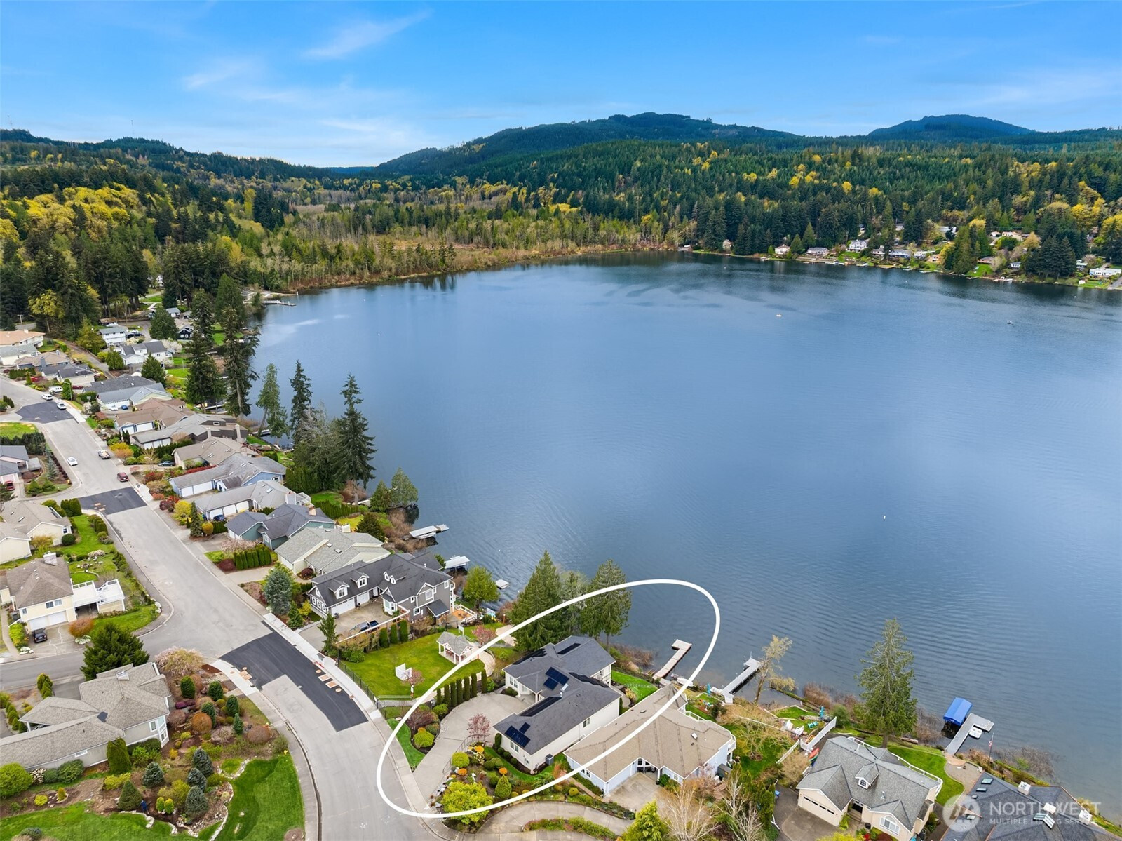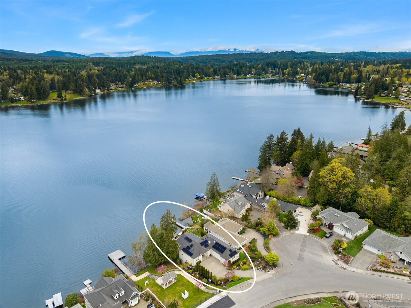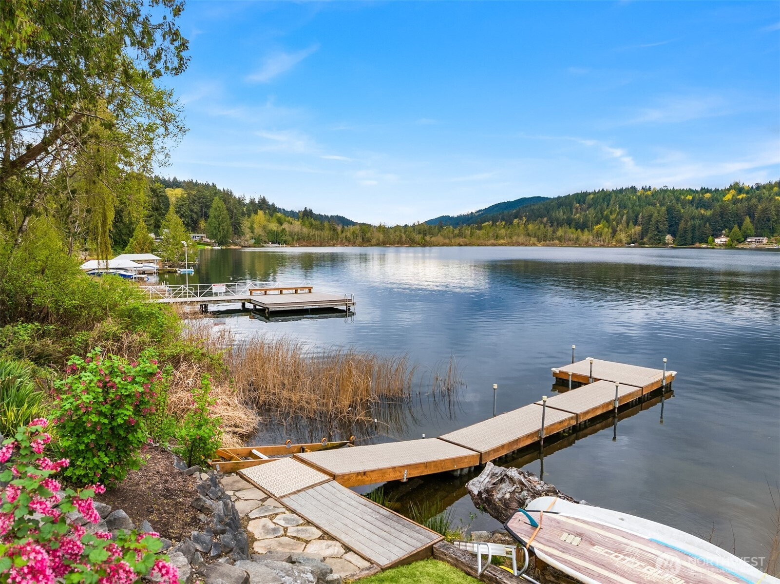 An exceptional gem, this striking west-facing home lives like a rambler while also featuring a spacious lower floor. Beautifully appointed, this 3,808 sq ft Kitsap Lake home offers 5 bedrooms and 4 baths, including two generous ensuite bedrooms. Tasteful finishes inside and out create a warm, inviting feeling, while stunning lake and Olympic Mountain views take center stage. The main level features a large, covered deck—your front-row seat to ever-changing scenery—complete with overhead heaters and a gas fireplace for year-round enjoyment. Downstairs, a large family room and expansive waterside patio lead directly to the lake and private dock. Experience true four-season waterfront living: springtime birdlife, summer days spent swimming, paddleboarding and boating, crisp autumn mornings fishing on the lake, and snow-capped Olympics in winter. Beautiful landscaping surrounds the home, and the fully fenced yard adds privacy and function. Solar panels and natural gas help keep energy costs low, even with whole-house A/C and an EV charger. Ideally located just 15 minutes from two ferry options, this is Pacific Northwest living at its finest.