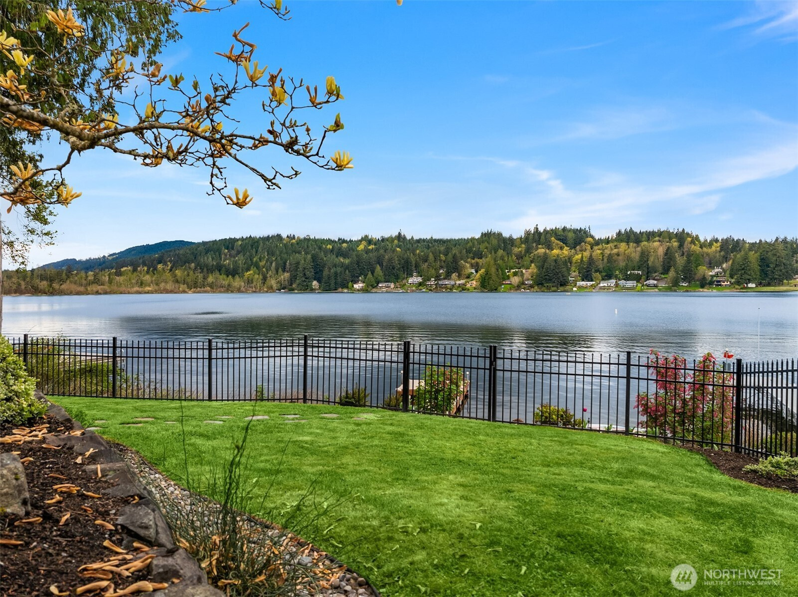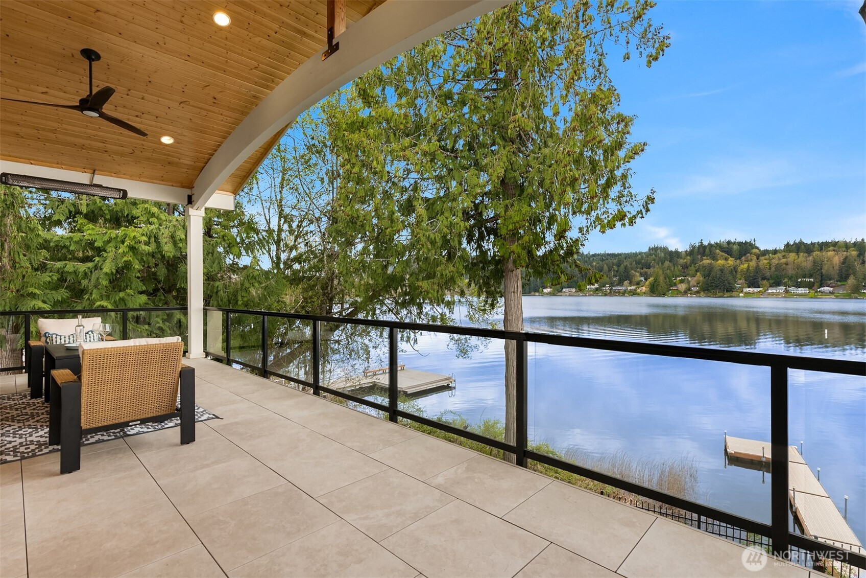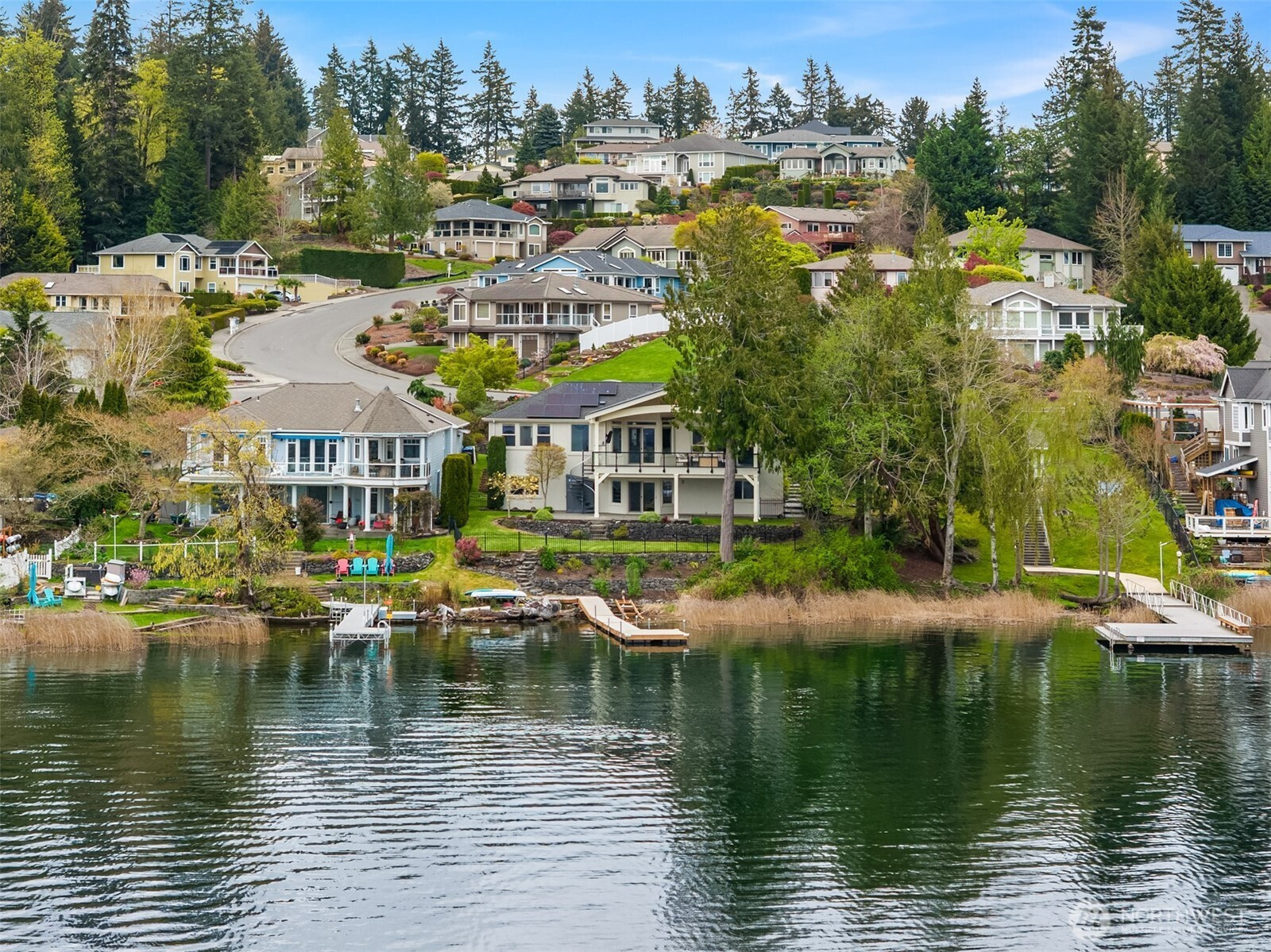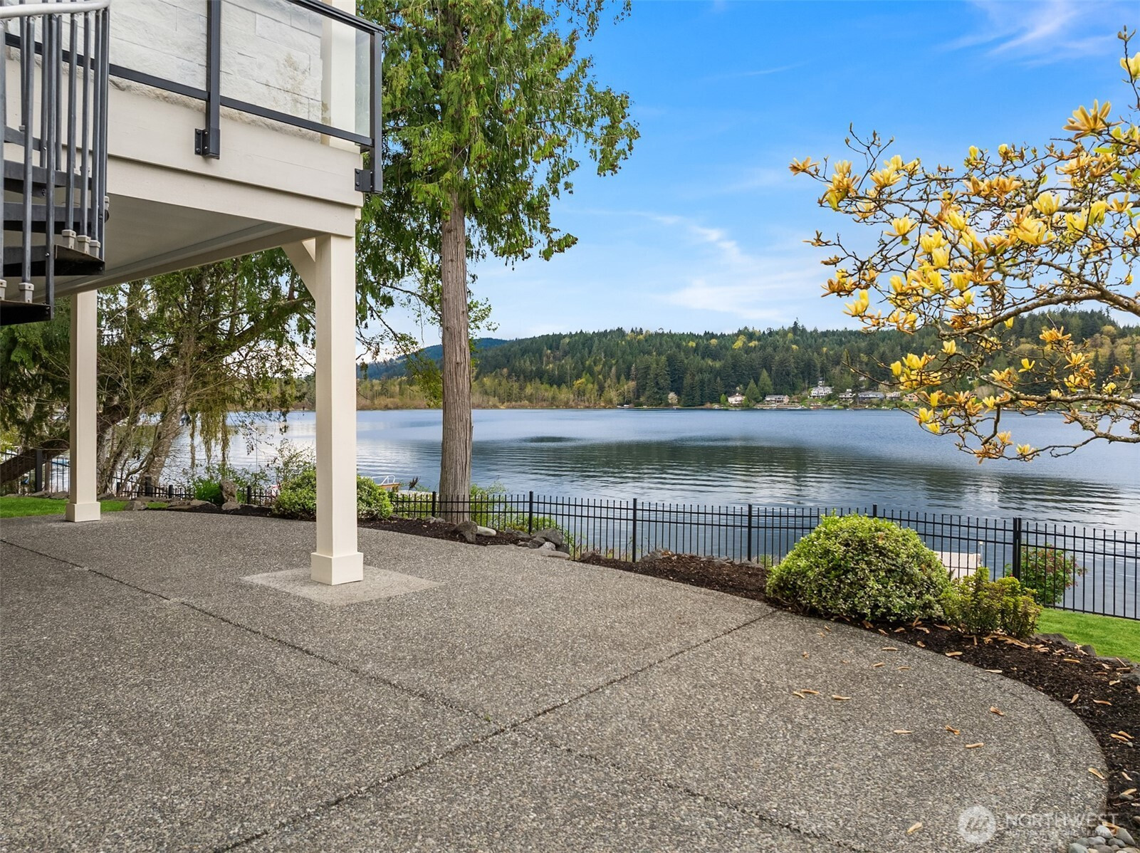 An exceptional gem, this striking west-facing home lives like a rambler while also featuring a spacious lower floor. Beautifully appointed, this 3,808 sq ft Kitsap Lake home offers 5 bedrooms and 4 baths, including two generous ensuite bedrooms. Tasteful finishes inside and out create a warm, inviting feeling, while stunning lake and Olympic Mountain views take center stage. The main level features a large, covered deck—your front-row seat to ever-changing scenery—complete with overhead heaters and a gas fireplace for year-round enjoyment. Downstairs, a large family room and expansive waterside patio lead directly to the lake and private dock. Experience true four-season waterfront living: springtime birdlife, summer days spent swimming, paddleboarding and boating, crisp autumn mornings fishing on the lake, and snow-capped Olympics in winter. Beautiful landscaping surrounds the home, and the fully fenced yard adds privacy and function. Solar panels and natural gas help keep energy costs low, even with whole-house A/C and an EV charger. Ideally located just 15 minutes from two ferry options, this is Pacific Northwest living at its finest.