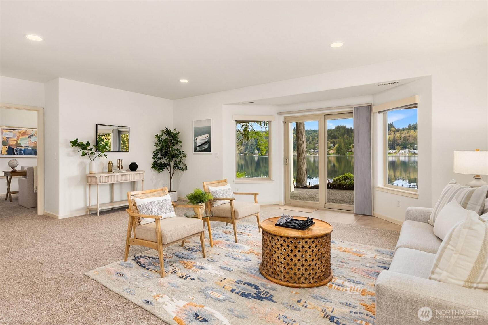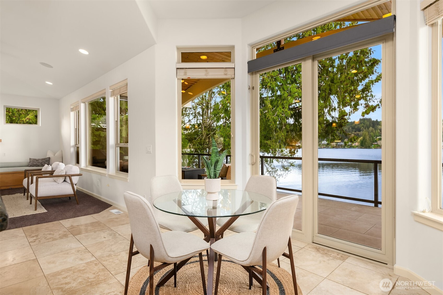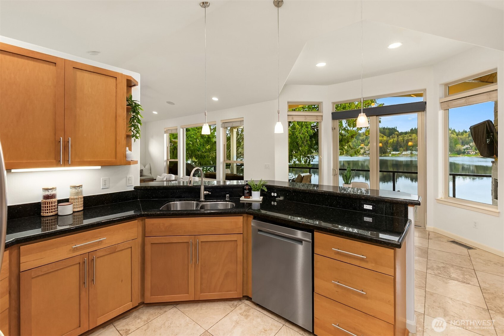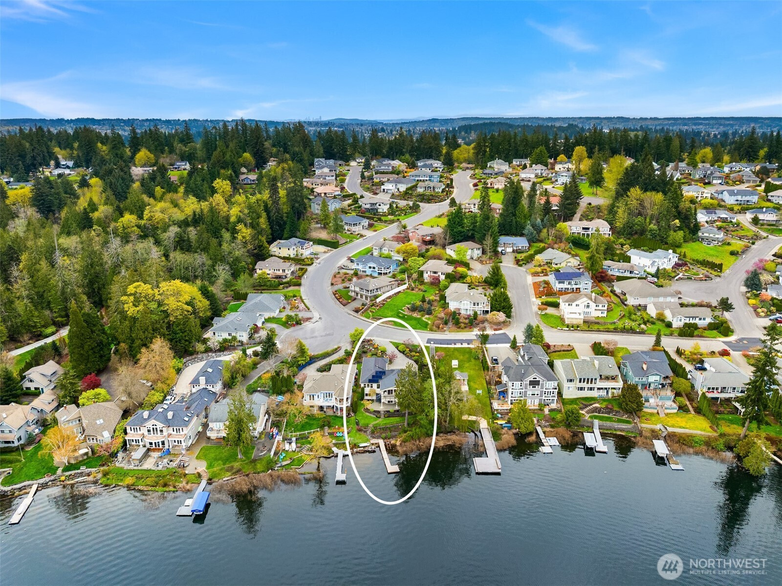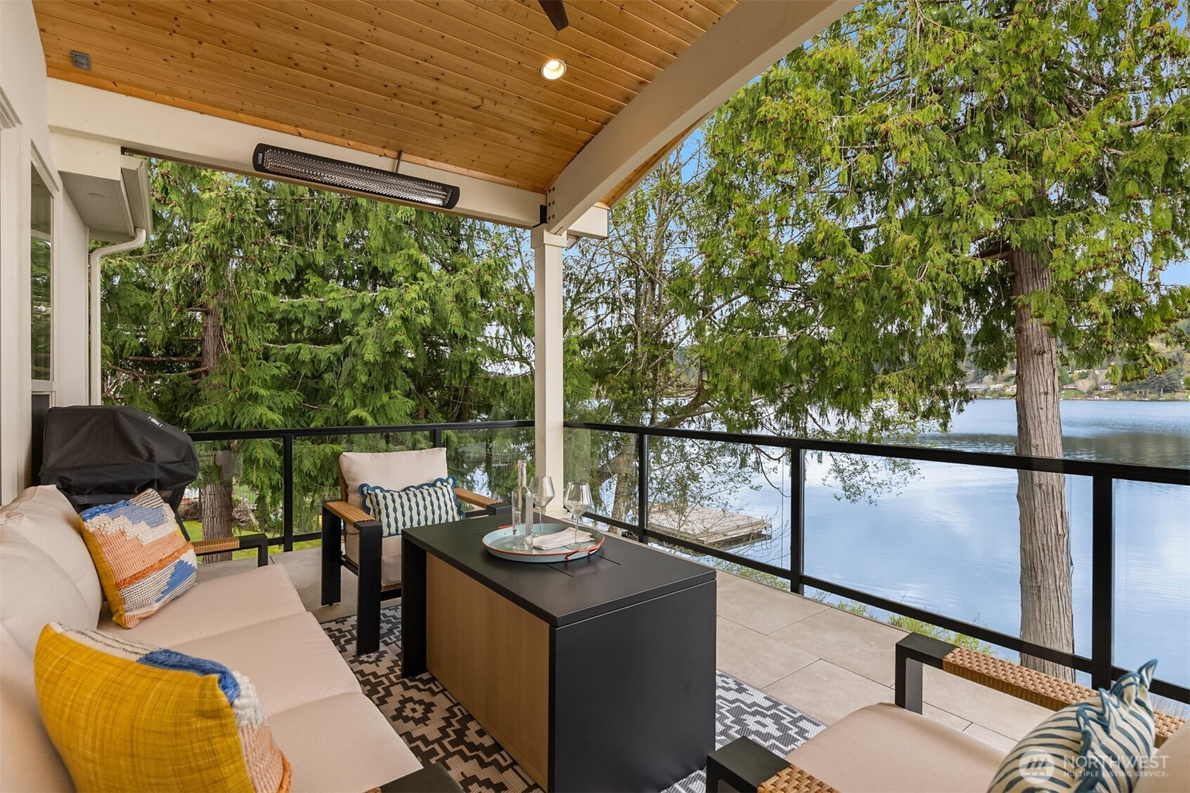 An exceptional gem, this striking west-facing home lives like a rambler while also featuring a spacious lower floor. Beautifully appointed, this 3,808 sq ft Kitsap Lake home offers 5 bedrooms and 4 baths, including two generous ensuite bedrooms. Tasteful finishes inside and out create a warm, inviting feeling, while stunning lake and Olympic Mountain views take center stage. The main level features a large, covered deck—your front-row seat to ever-changing scenery—complete with overhead heaters and a gas fireplace for year-round enjoyment. Downstairs, a large family room and expansive waterside patio lead directly to the lake and private dock. Experience true four-season waterfront living: springtime birdlife, summer days spent swimming, paddleboarding and boating, crisp autumn mornings fishing on the lake, and snow-capped Olympics in winter. Beautiful landscaping surrounds the home, and the fully fenced yard adds privacy and function. Solar panels and natural gas help keep energy costs low, even with whole-house A/C and an EV charger. Ideally located just 15 minutes from two ferry options, this is Pacific Northwest living at its finest.