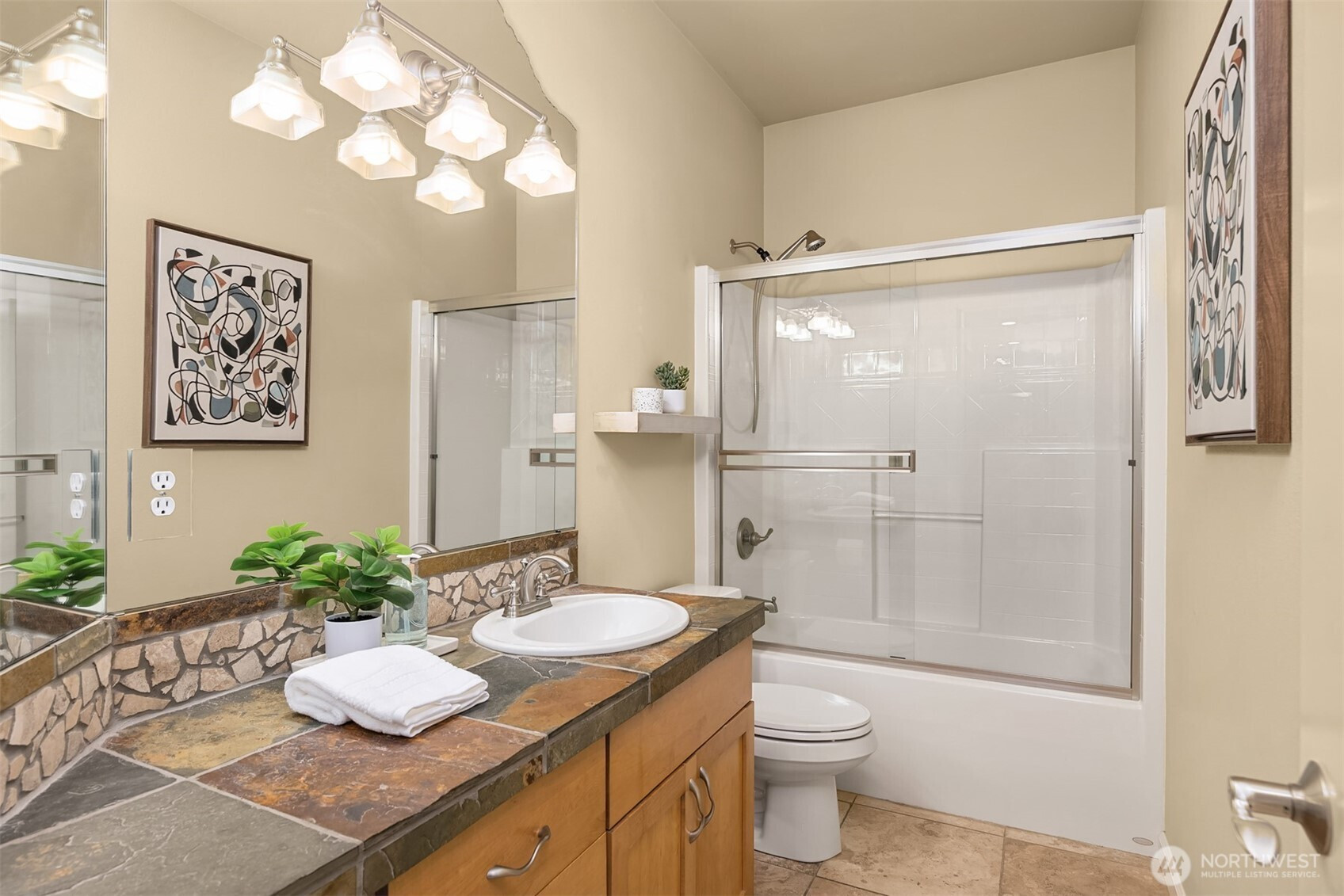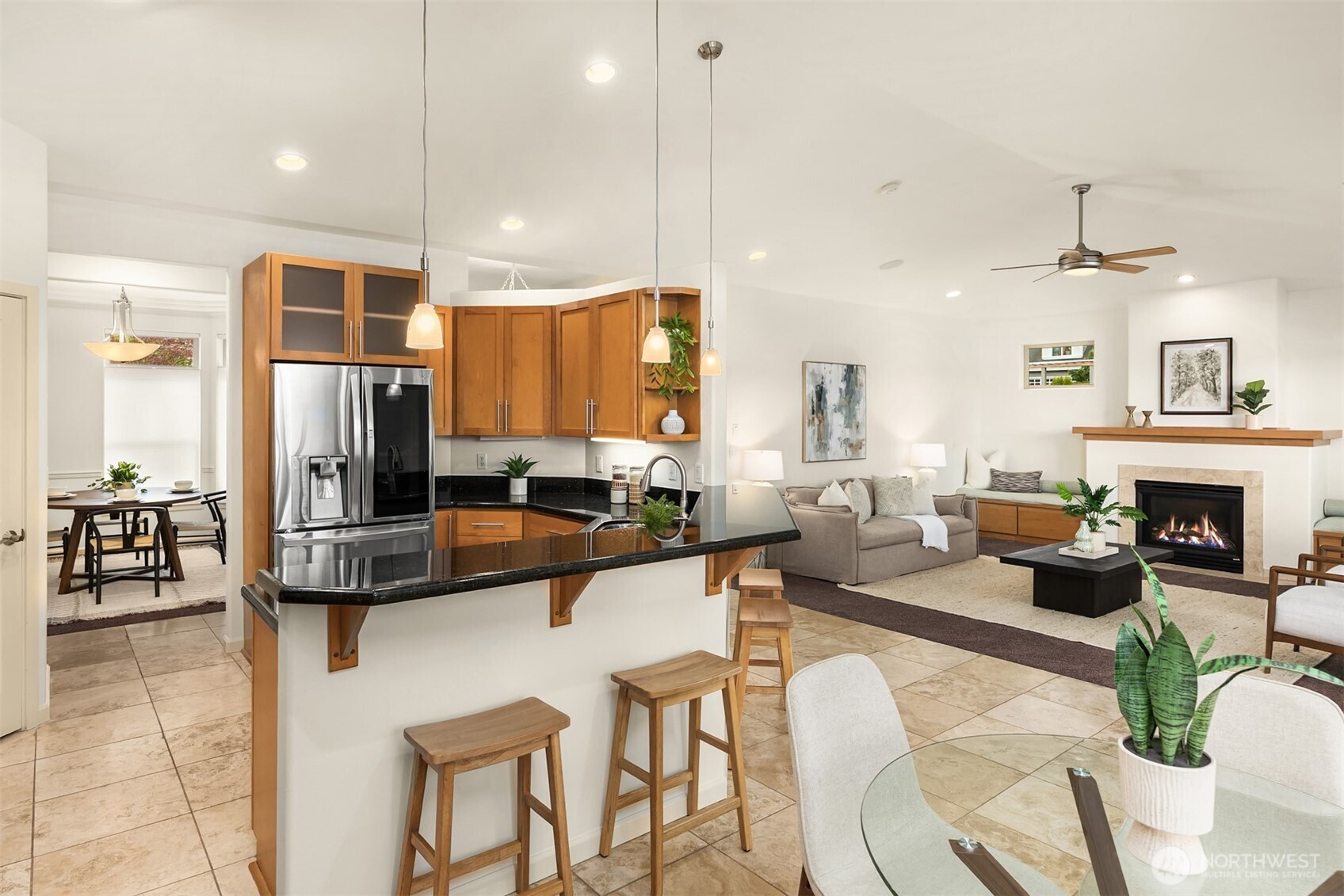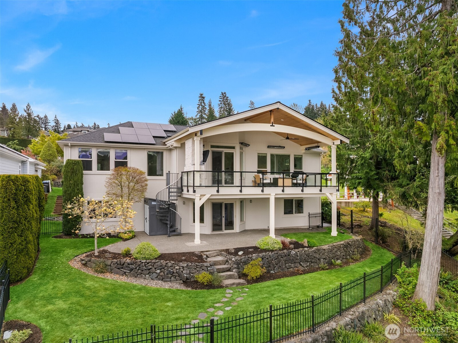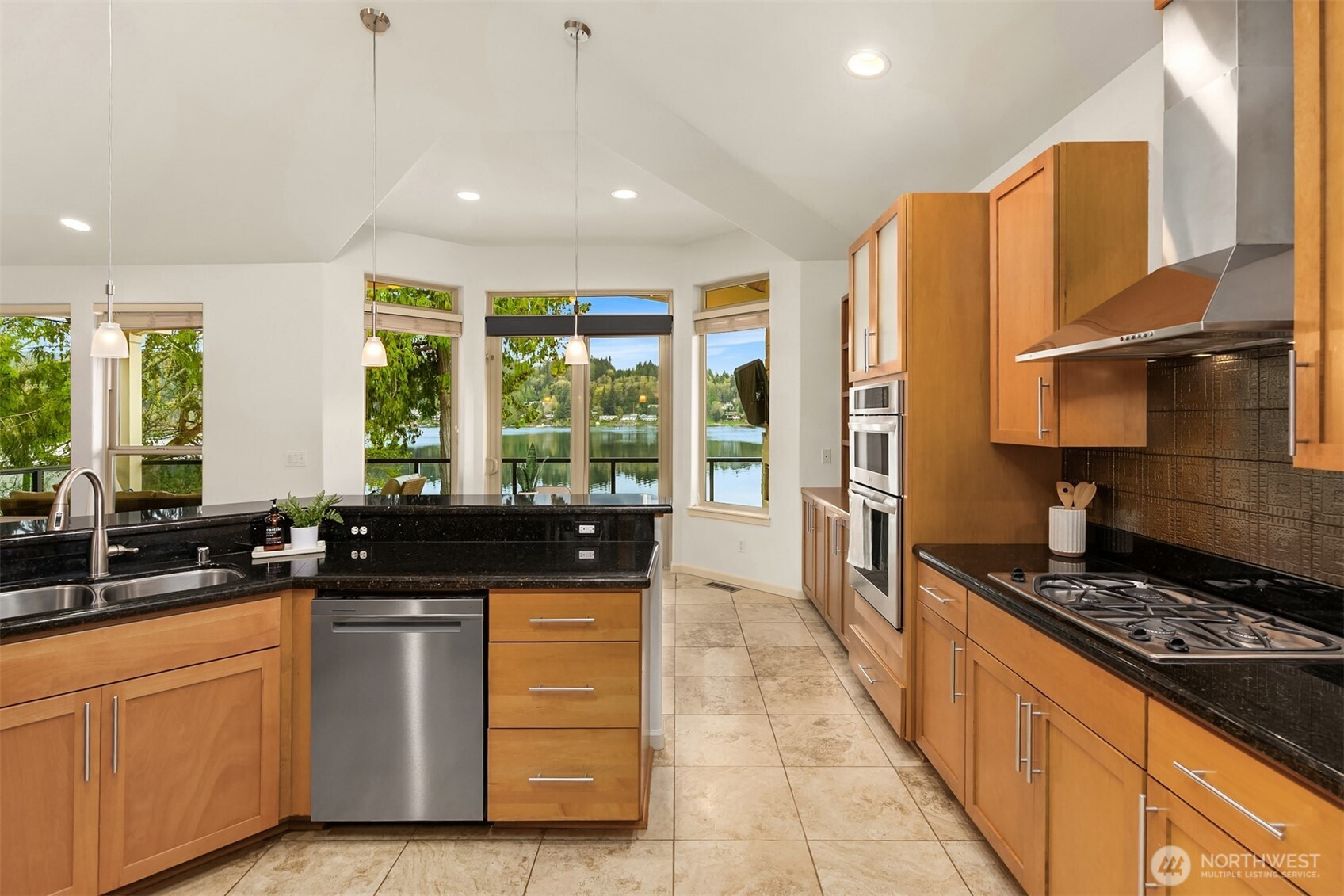 An exceptional gem, this striking west-facing home lives like a rambler while also featuring a spacious lower floor. Beautifully appointed, this 3,808 sq ft Kitsap Lake home offers 5 bedrooms and 4 baths, including two generous ensuite bedrooms. Tasteful finishes inside and out create a warm, inviting feeling, while stunning lake and Olympic Mountain views take center stage. The main level features a large, covered deck—your front-row seat to ever-changing scenery—complete with overhead heaters and a gas fireplace for year-round enjoyment. Downstairs, a large family room and expansive waterside patio lead directly to the lake and private dock. Experience true four-season waterfront living: springtime birdlife, summer days spent swimming, paddleboarding and boating, crisp autumn mornings fishing on the lake, and snow-capped Olympics in winter. Beautiful landscaping surrounds the home, and the fully fenced yard adds privacy and function. Solar panels and natural gas help keep energy costs low, even with whole-house A/C and an EV charger. Ideally located just 15 minutes from two ferry options, this is Pacific Northwest living at its finest.