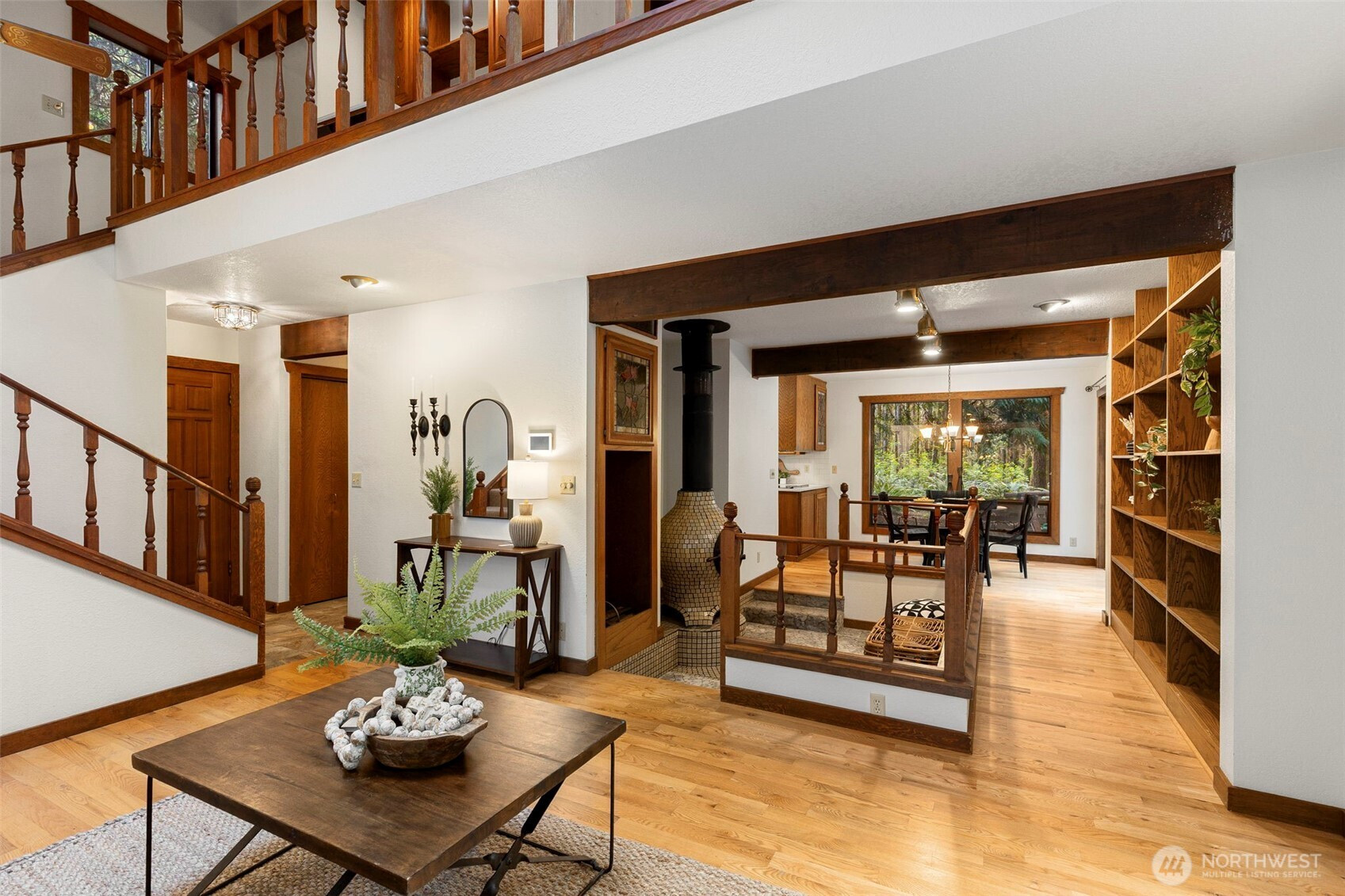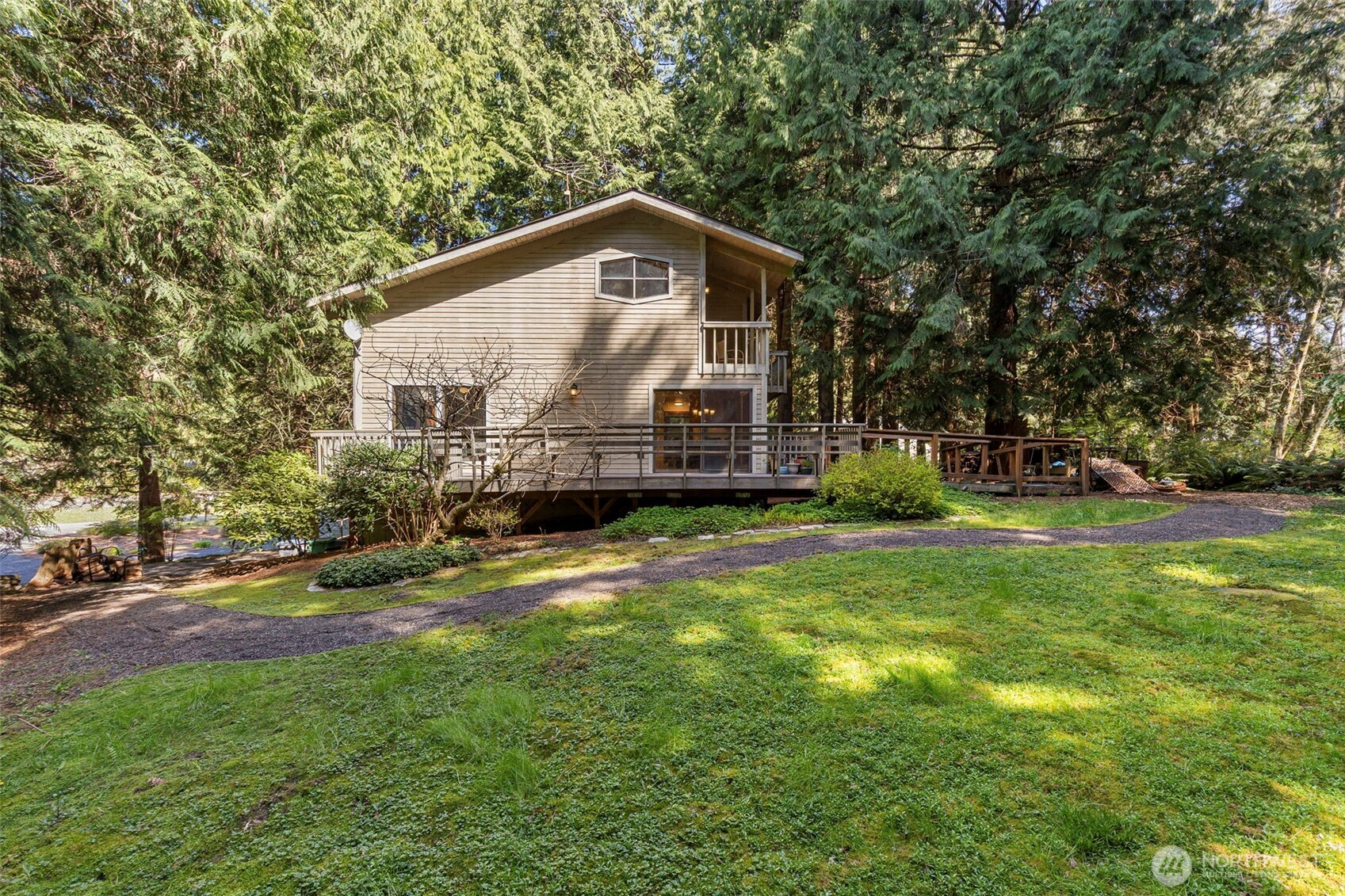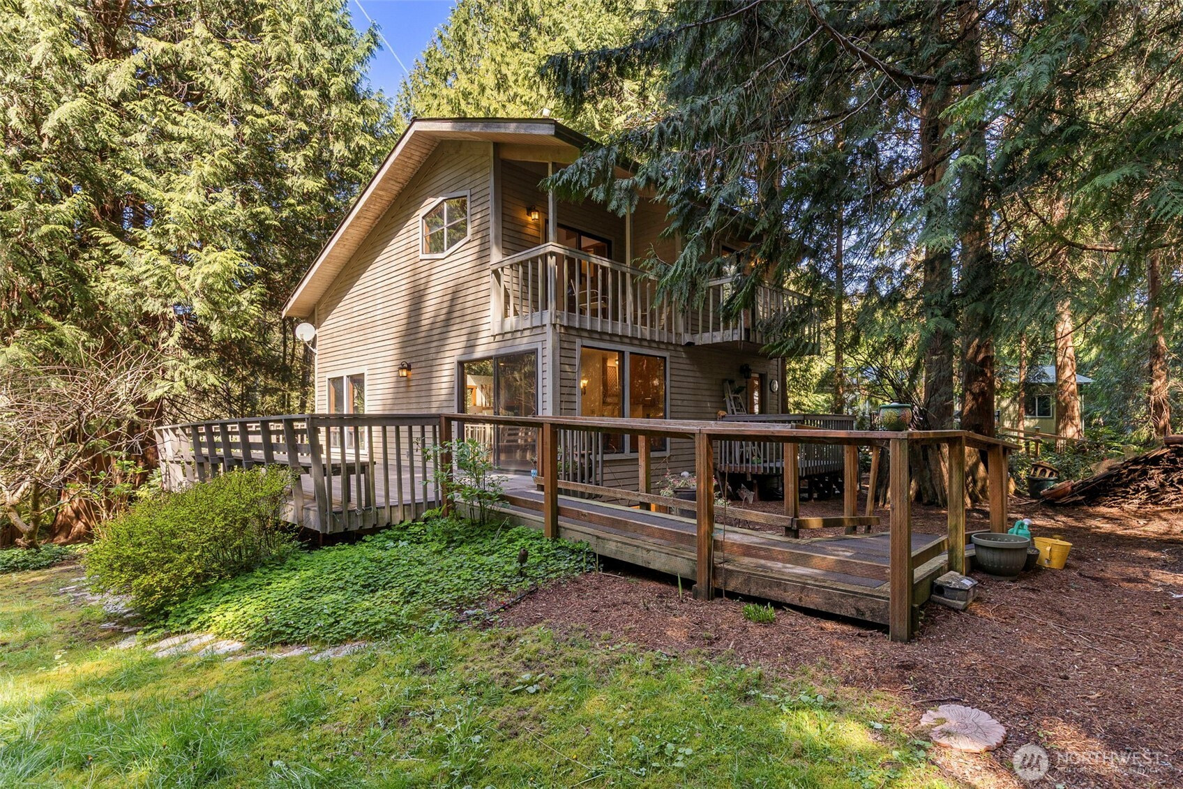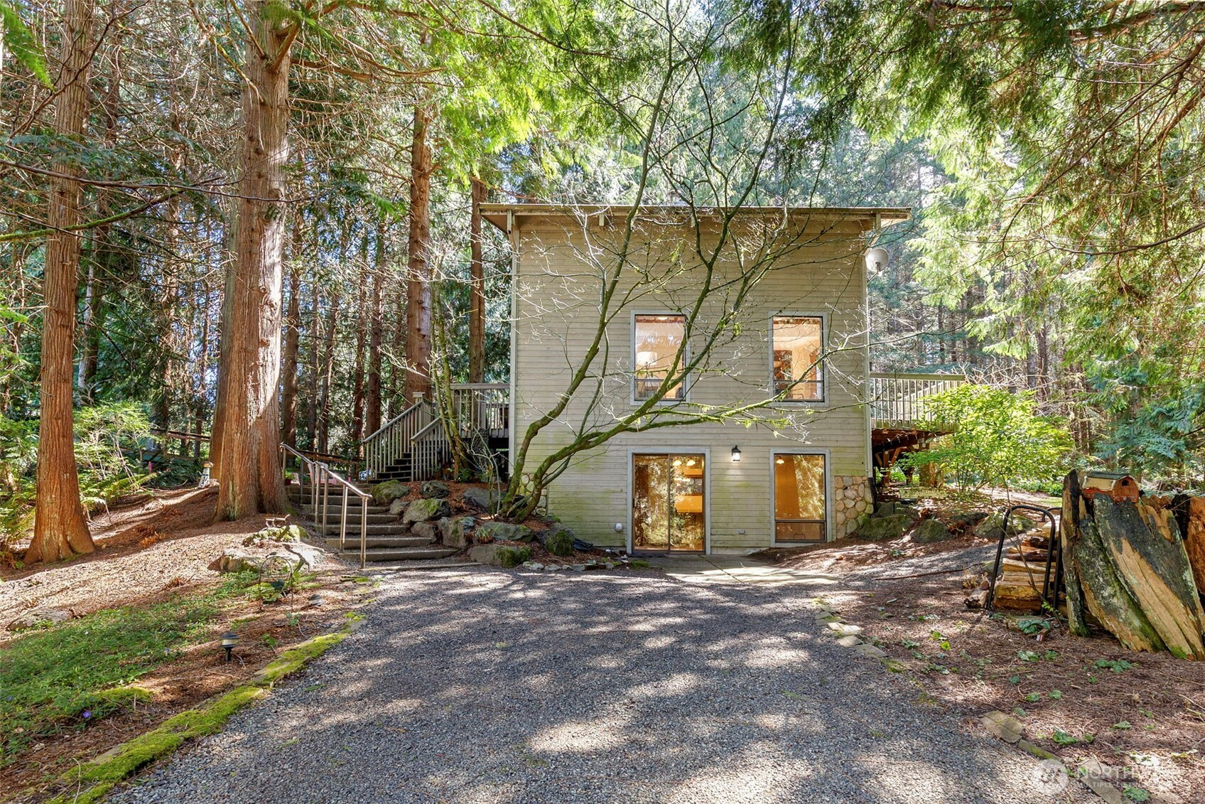 Looking to live in a cherished community along the Hood Canal? This lovingly maintained 3-bedroom, 1.75-bath home spans 2,057 sq ft in the Shore Woods community of Hansville. Built in 1981 and cared for by its original owners, this home showcases natural charm with cedar vaulted ceilings, exposed Doug Fir beams, and original hardwood flooring. The kitchen has been updated with quartz counters, subway tile backsplash, and ceramic tile flooring. A sunken portion of the living room features a Meridian Ceramic tile wood stove, creating a cozy and artsy space to enjoy conversation or get lost in a novel. Sliding doors open to the back deck and a peaceful wooded backdrop. Furnace, Heat Pump, and 30-year roof, just two years old. Enjoy the Hansville Greenway hiking trails in the area, trailheads are very close. Shore Woods amenities include a community pool, sports courts, a community center, and beach access, with impressive views of Hood Canal and the Olympic Mountains. The vacant lot next door is being sold as well, by the same owners. Purchase both to preserve more space, or build it out to fit your lifestyle. This Hansville home is a true gem.