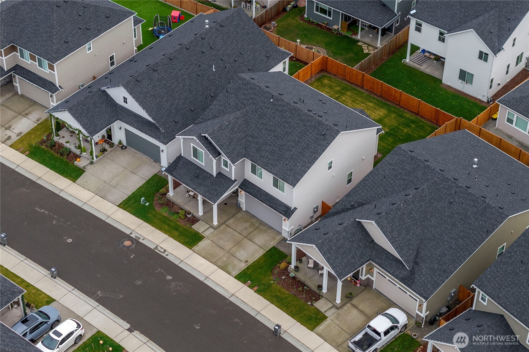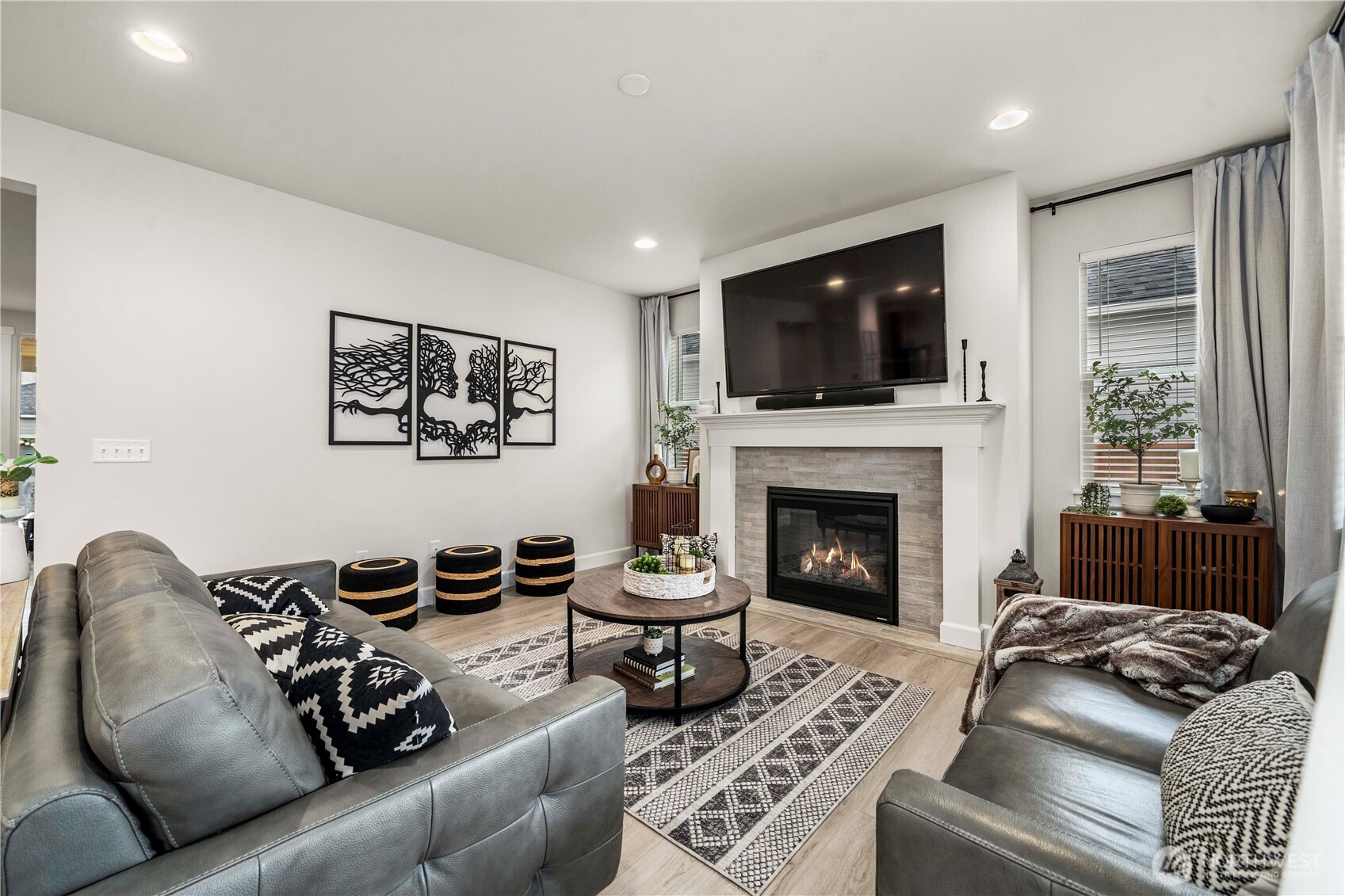 Barely lived in and better than new! This stunning Andrea plan offers a bright great room with fireplace, gourmet kitchen with gas range, walk-in pantry, and sitting nook for the chef to catch a break! Including a spacious dining area, main floor bedroom and ¾ bath with a walk-in shower this home is perfect for multigenerational living. Upstairs, a custom theater room awaits-complete with built-ins, furnishings and equipment if desired. Retreat to the luxurious primary suite with an oversized closet and tiled spa bath, plus 2 additional bedrooms and laundry with added cabinetry. EV charger, new appliances, and covered patio included-fully fenced and ready for move-in!