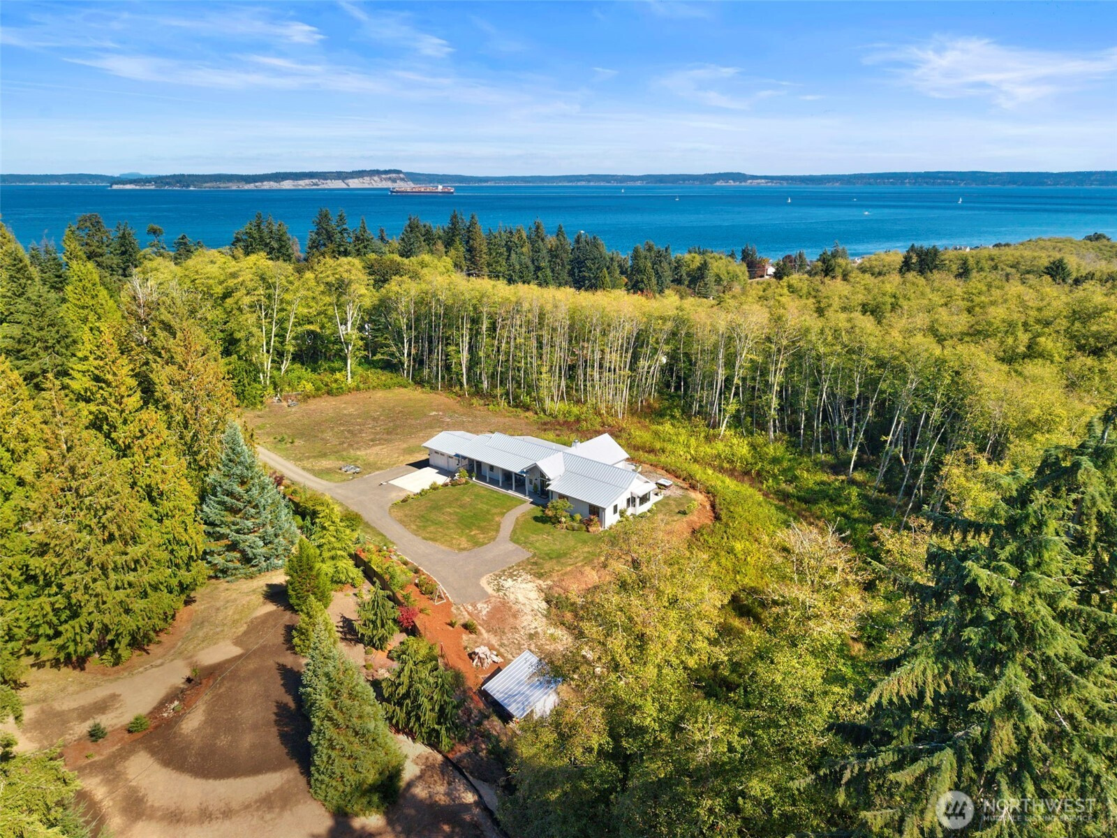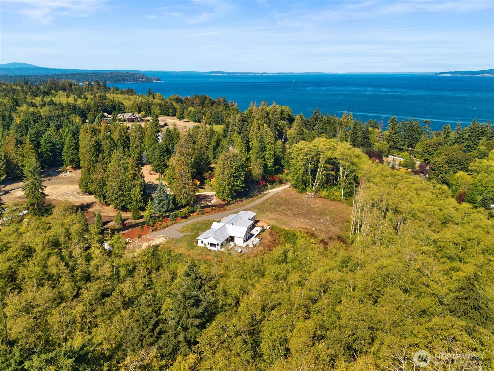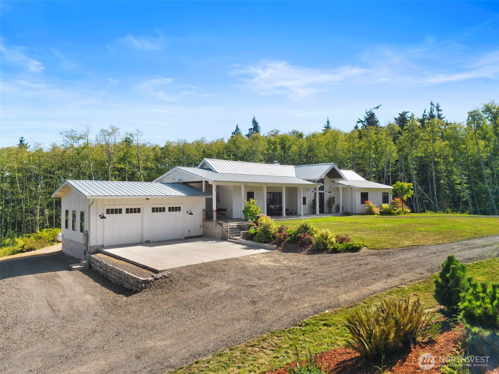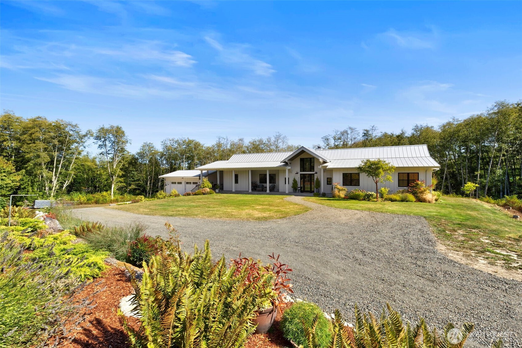 Experience modern farmhouse luxury on 4.73 private acres with breathtaking sunrises & sunsets. Stylish 3,168 sq ft custom home features board & batten siding, metal roof, Anderson windows, soaring 10’ ceilings, & concrete floors with radiant heat. Chef’s kitchen boasts Viking, Bosch, & Thermador appliances with large butler’s pantry. Retreat to the primary suite with deck access & spa-inspired 5 piece bath. Entertain on the 2,600 sq ft concrete deck with sweeping territorial & filtered water views. Family room, flexible office or bedroom, & oversized laundry enhance functionality. Detached garage, RV pad, & ADU-ready site complete this serene Hansville oasis near scenic beaches & trails, & Buck Lake. Under half an hour to town & ferries!