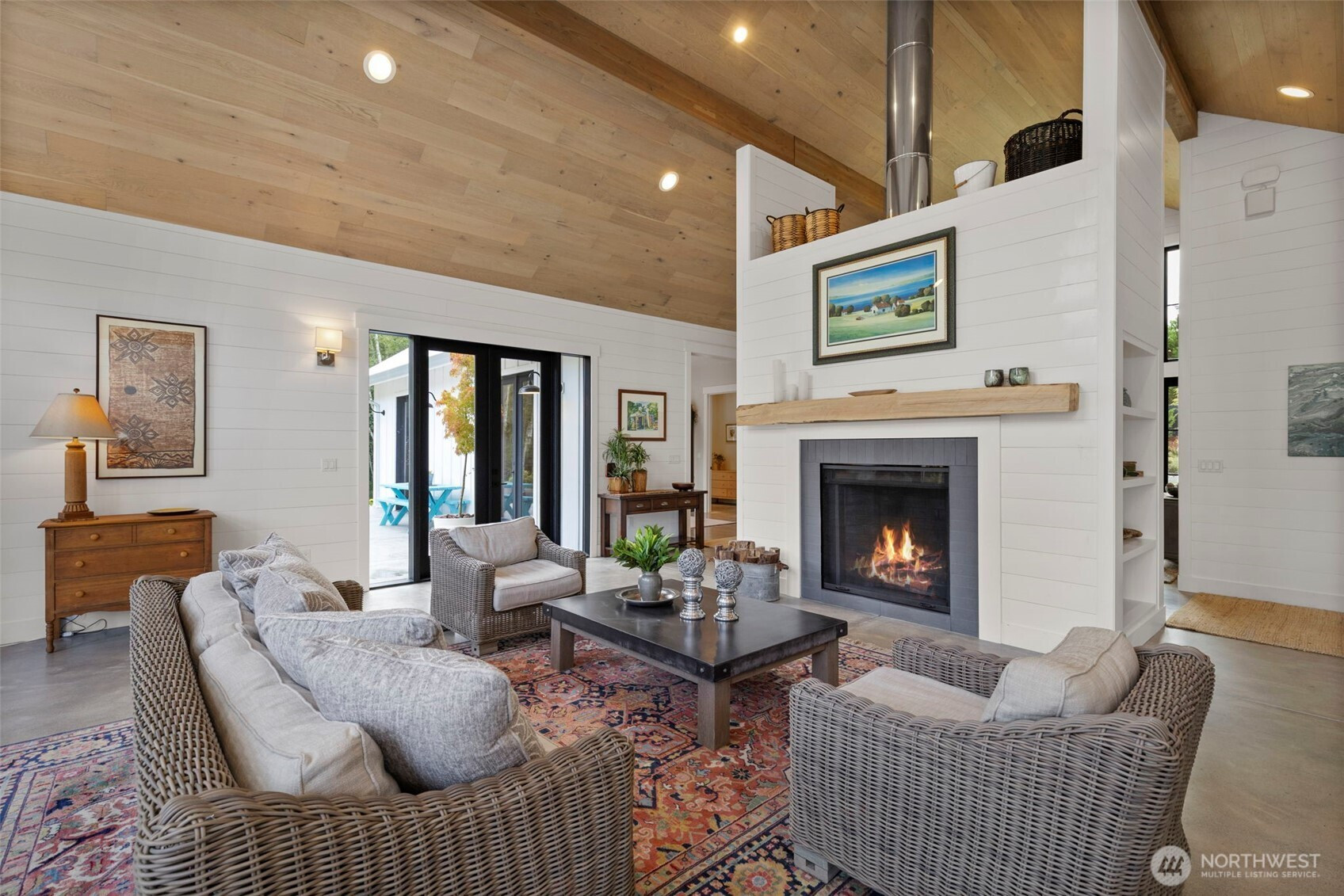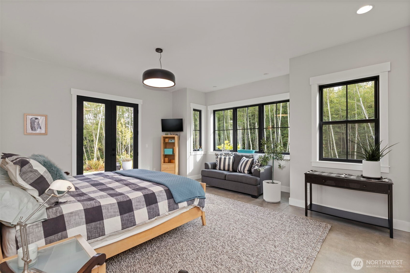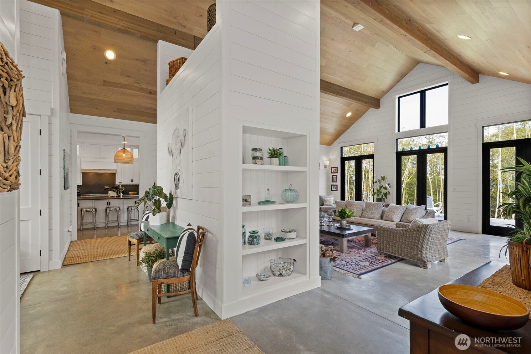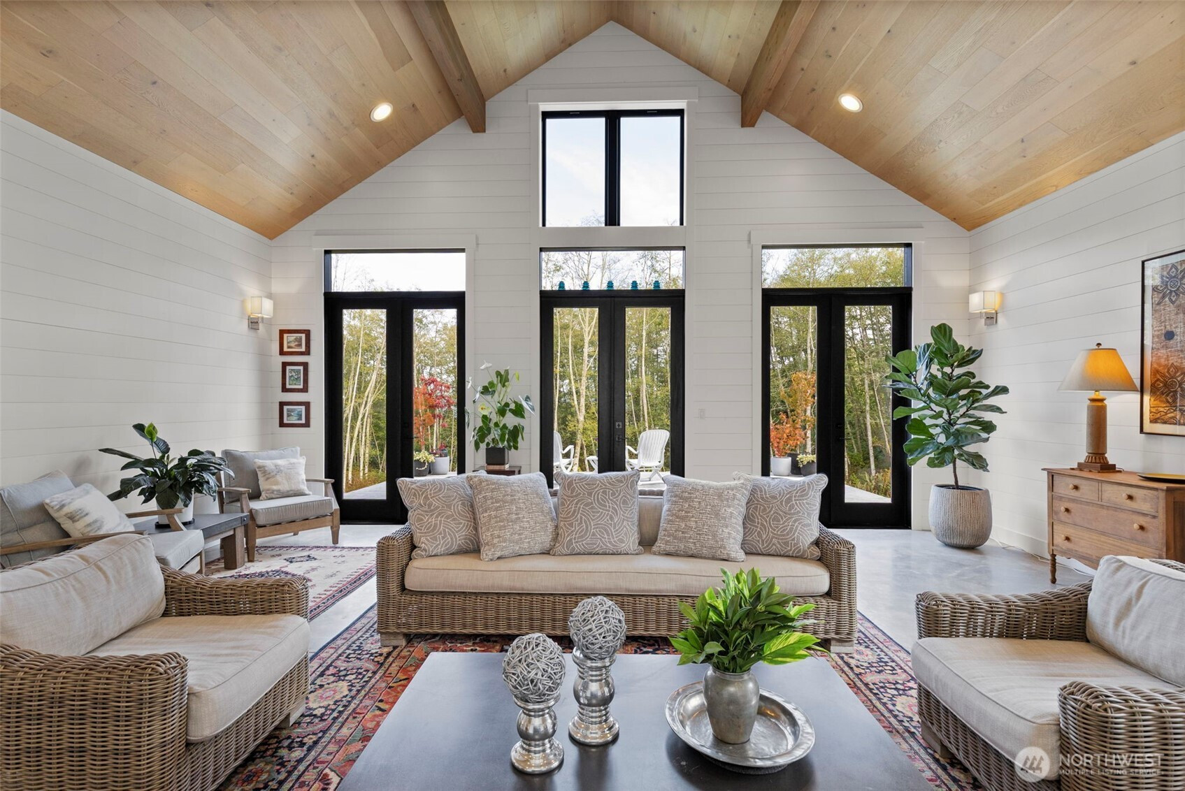 Experience modern farmhouse luxury on 4.73 private acres with breathtaking sunrises & sunsets. Stylish 3,168 sq ft custom home features board & batten siding, metal roof, Anderson windows, soaring 10’ ceilings, & concrete floors with radiant heat. Chef’s kitchen boasts Viking, Bosch, & Thermador appliances with large butler’s pantry. Retreat to the primary suite with deck access & spa-inspired 5 piece bath. Entertain on the 2,600 sq ft concrete deck with sweeping territorial & filtered water views. Family room, flexible office or bedroom, & oversized laundry enhance functionality. Detached garage, RV pad, & ADU-ready site complete this serene Hansville oasis near scenic beaches & trails, & Buck Lake. Under half an hour to town & ferries!