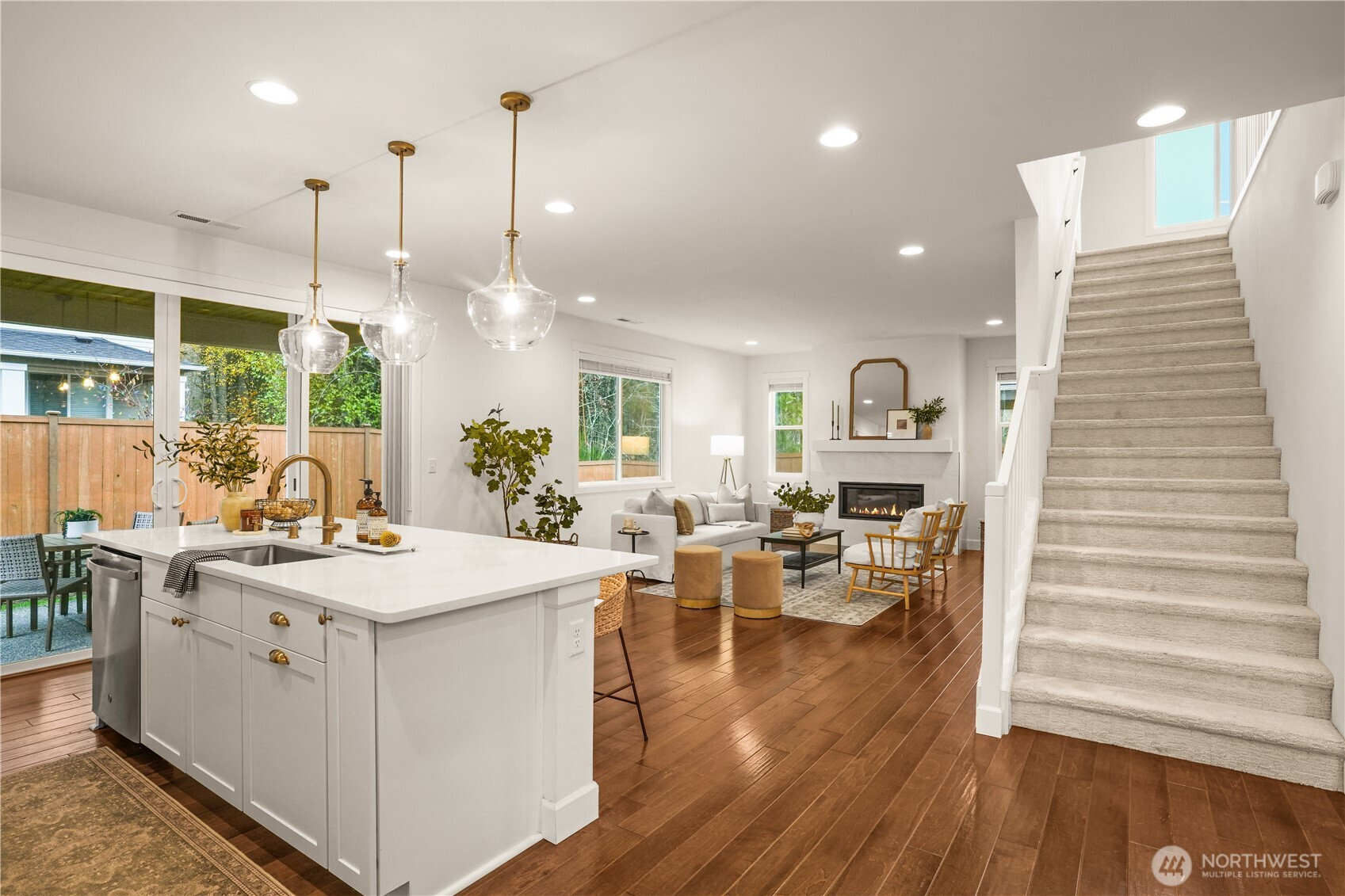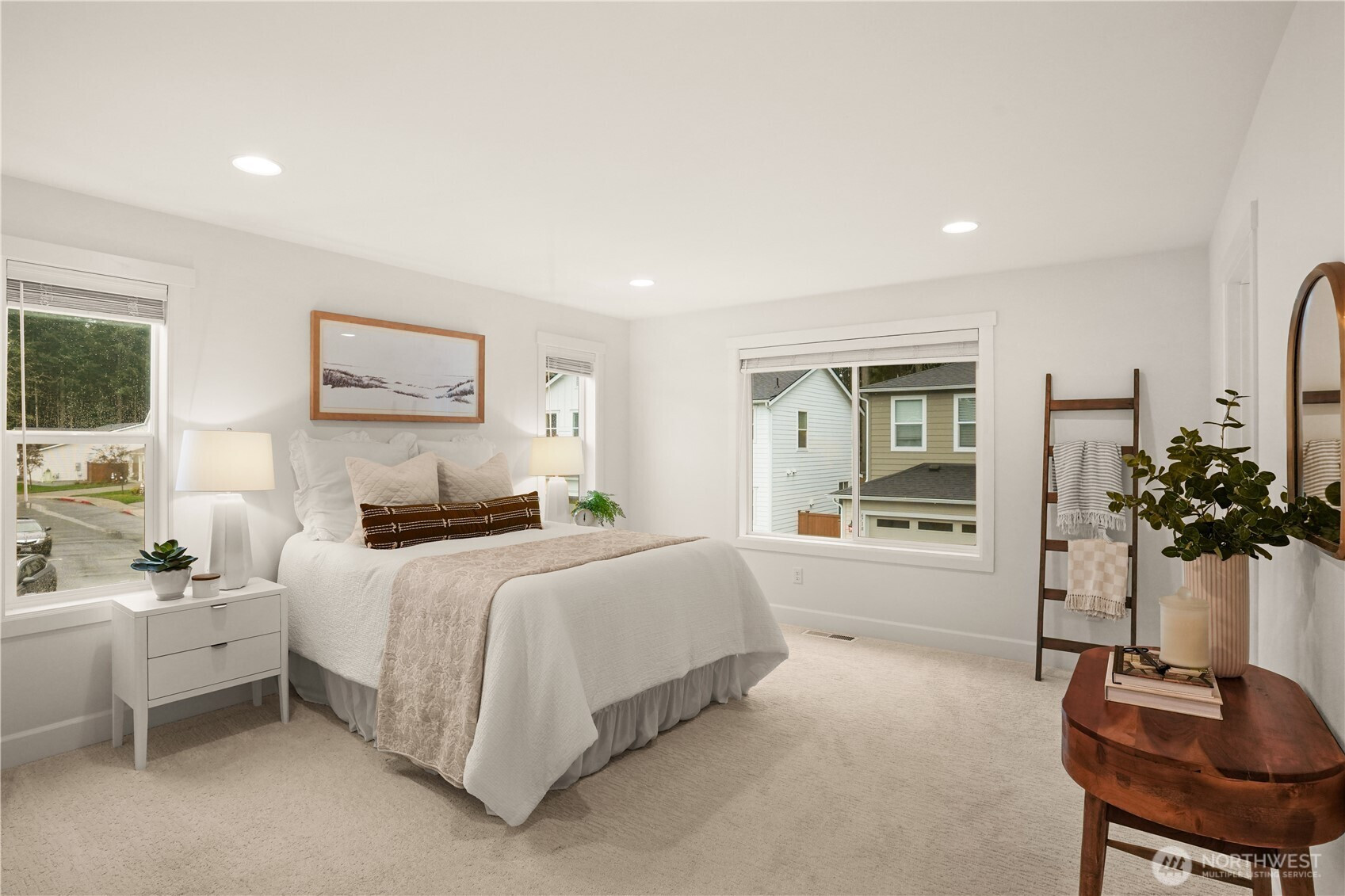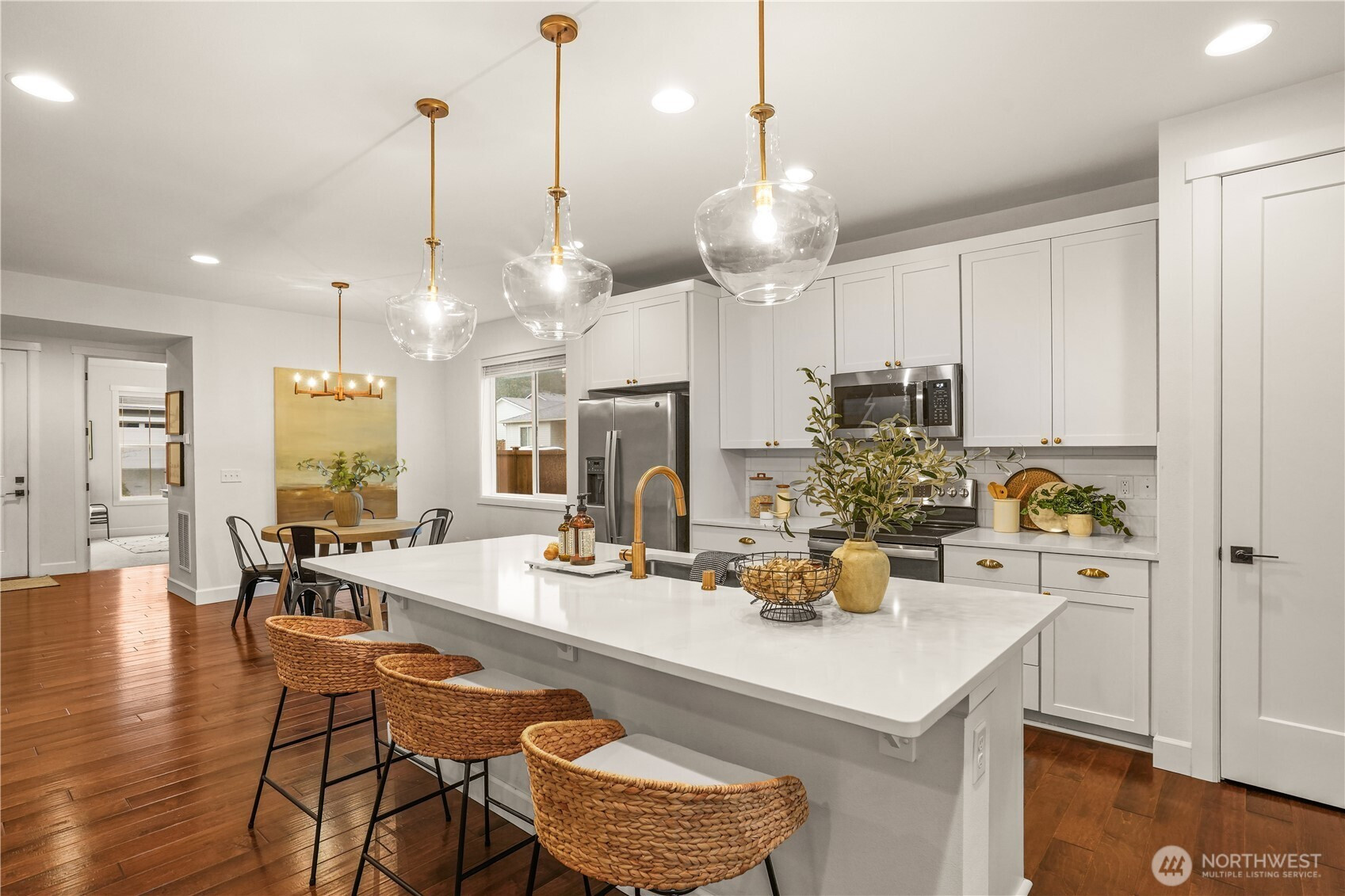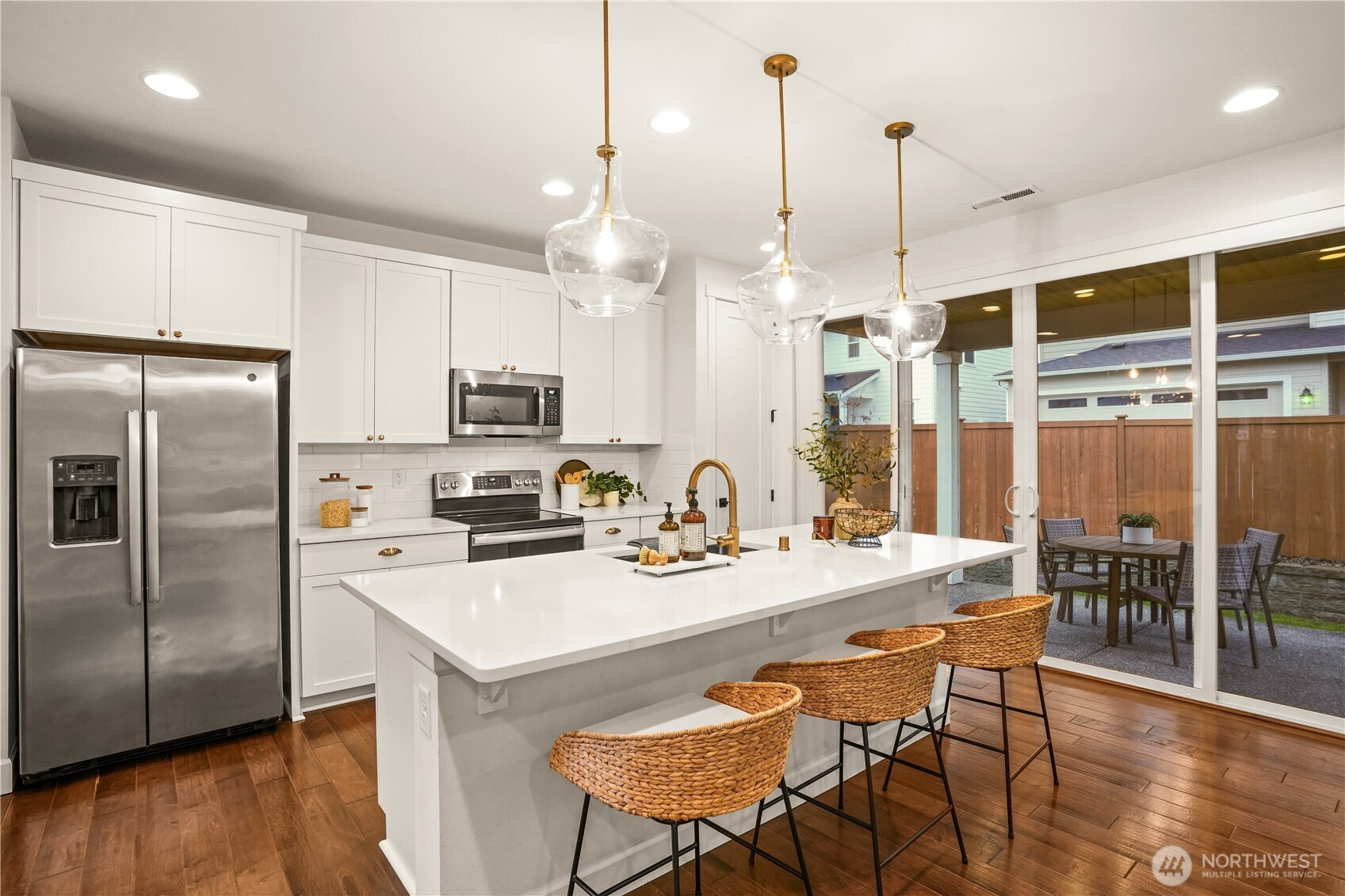 This masterfully built, nearly new home on an oversized corner lot is sure to impress. Enjoy spacious living with modern design and high-end finishes. The main floor offers a versatile bedroom for guests or office use, a full bath with a walk-in shower, and a well-appointed kitchen with SS appliances, quartz countertops, a large island, and double sliders to the covered patio. The open layout seamlessly connects the dining area, kitchen, and living room—ideal for entertaining. Upstairs features two additional bedrooms with a shared bath, a primary suite with luxe ensuite and large walk-in closet, a spacious tiled laundry room, and a generous family room or flex space. Don’t miss the 3-car garage with ample space for vehicles and storage.