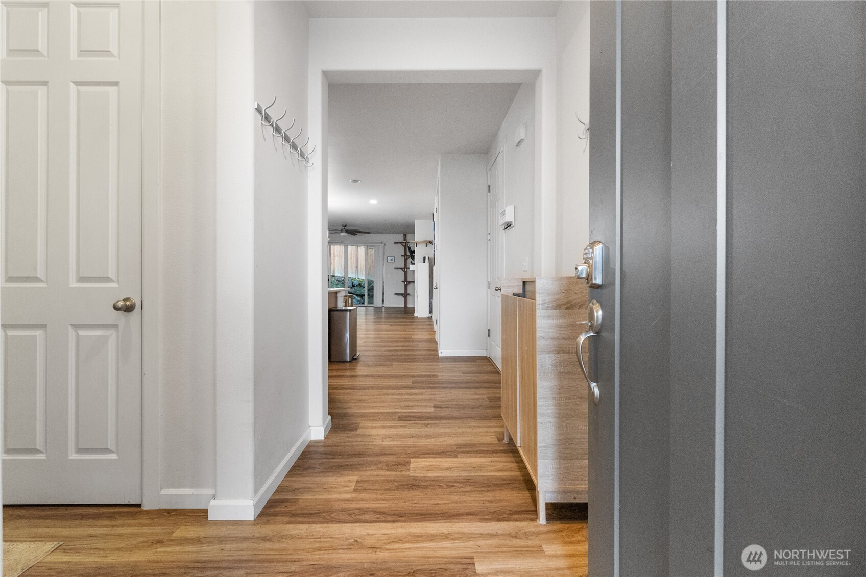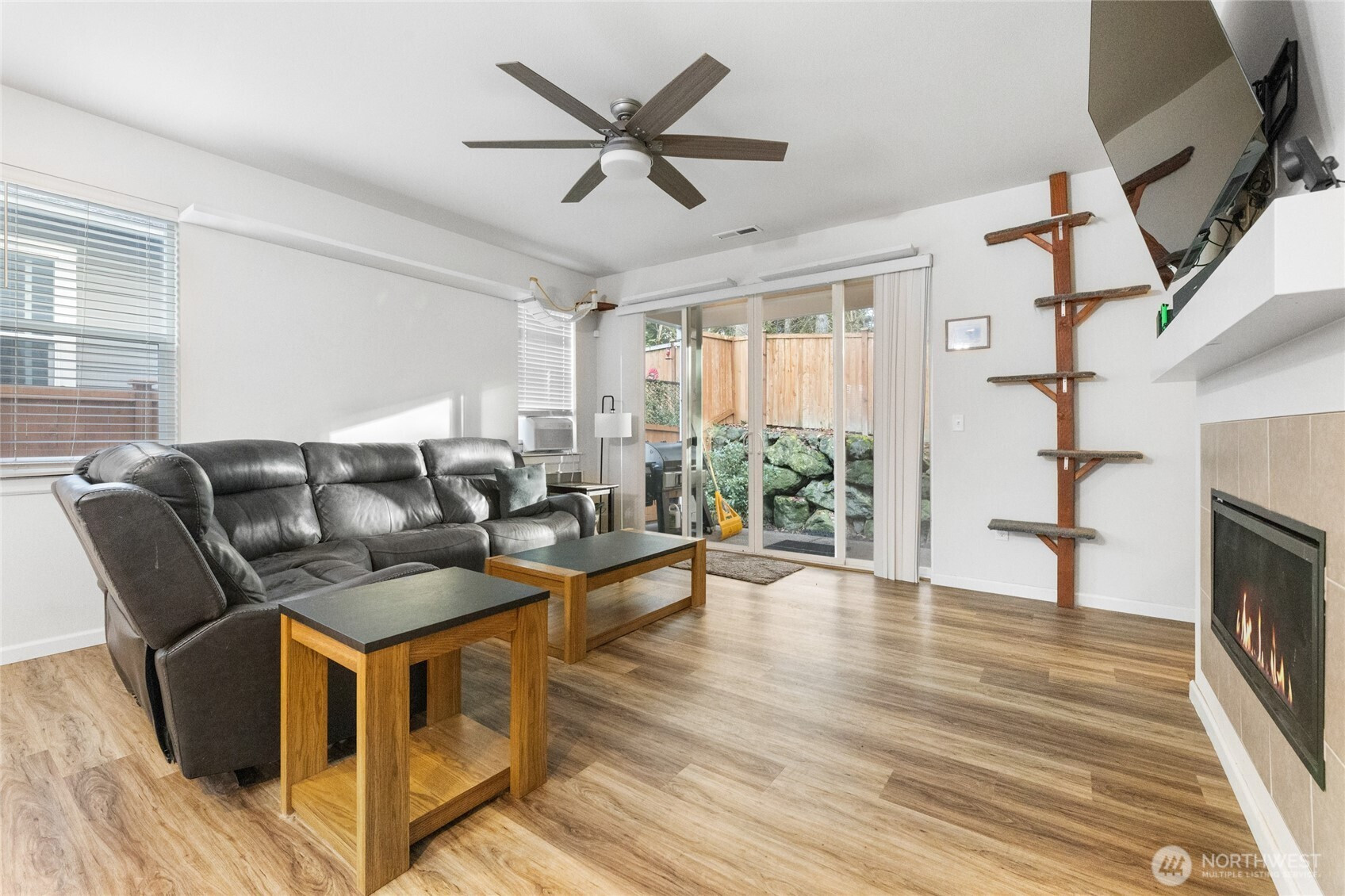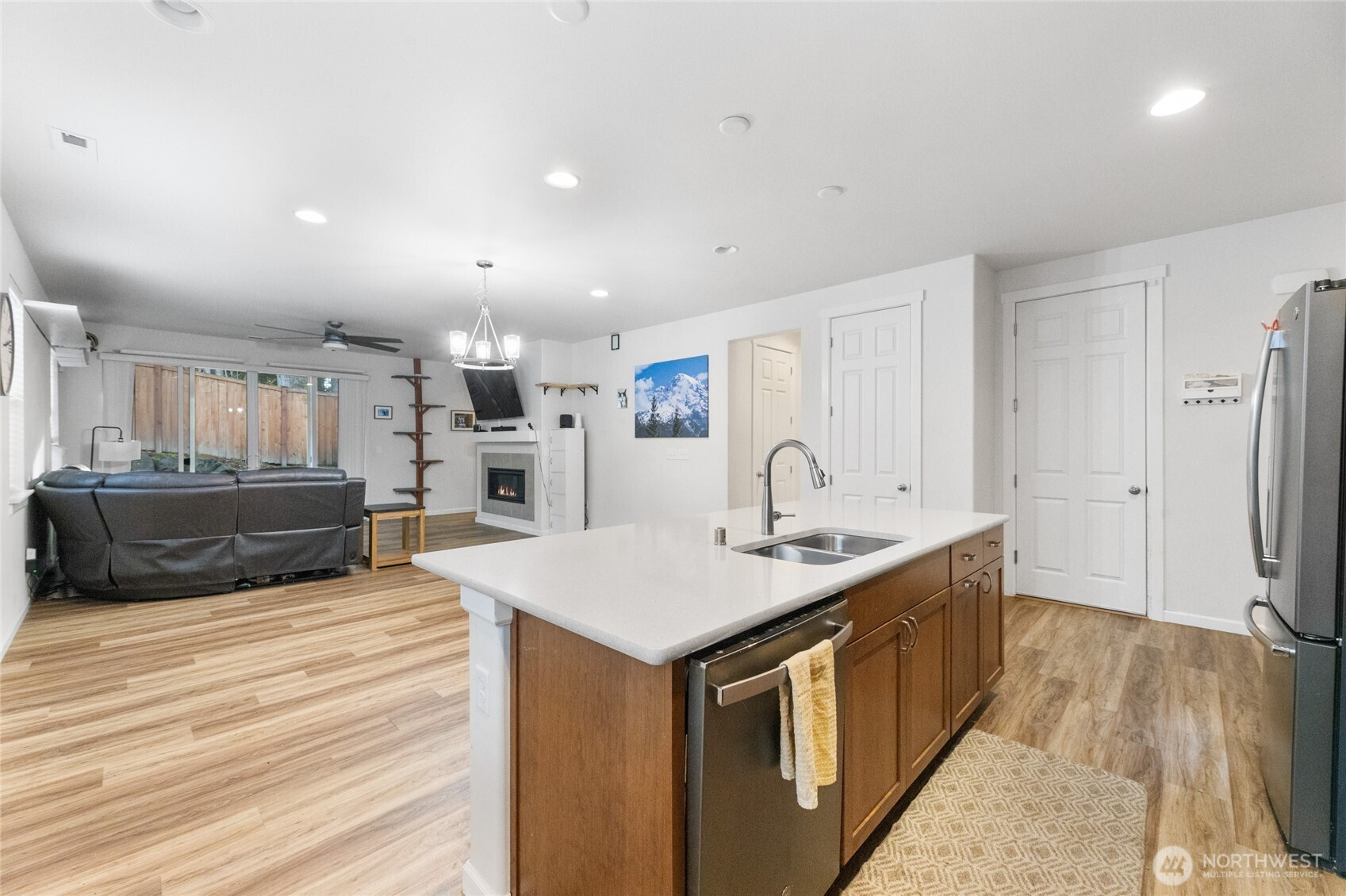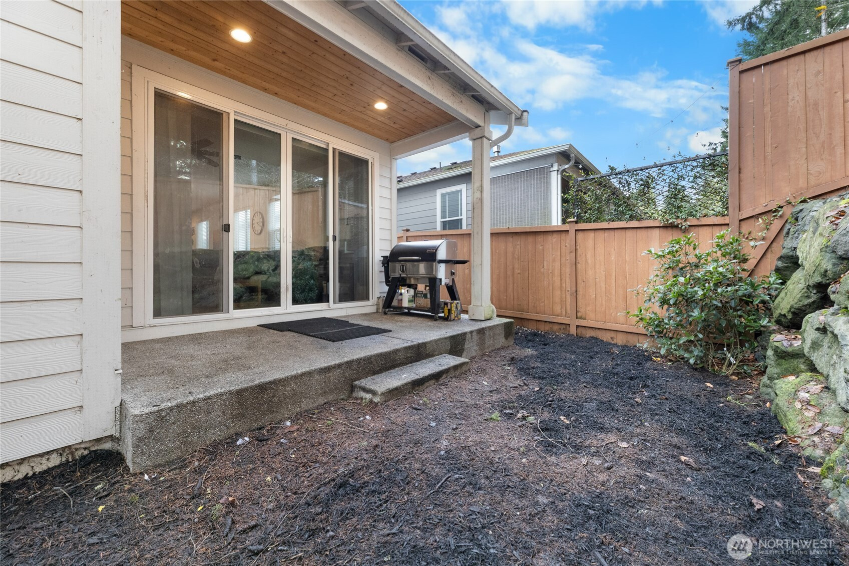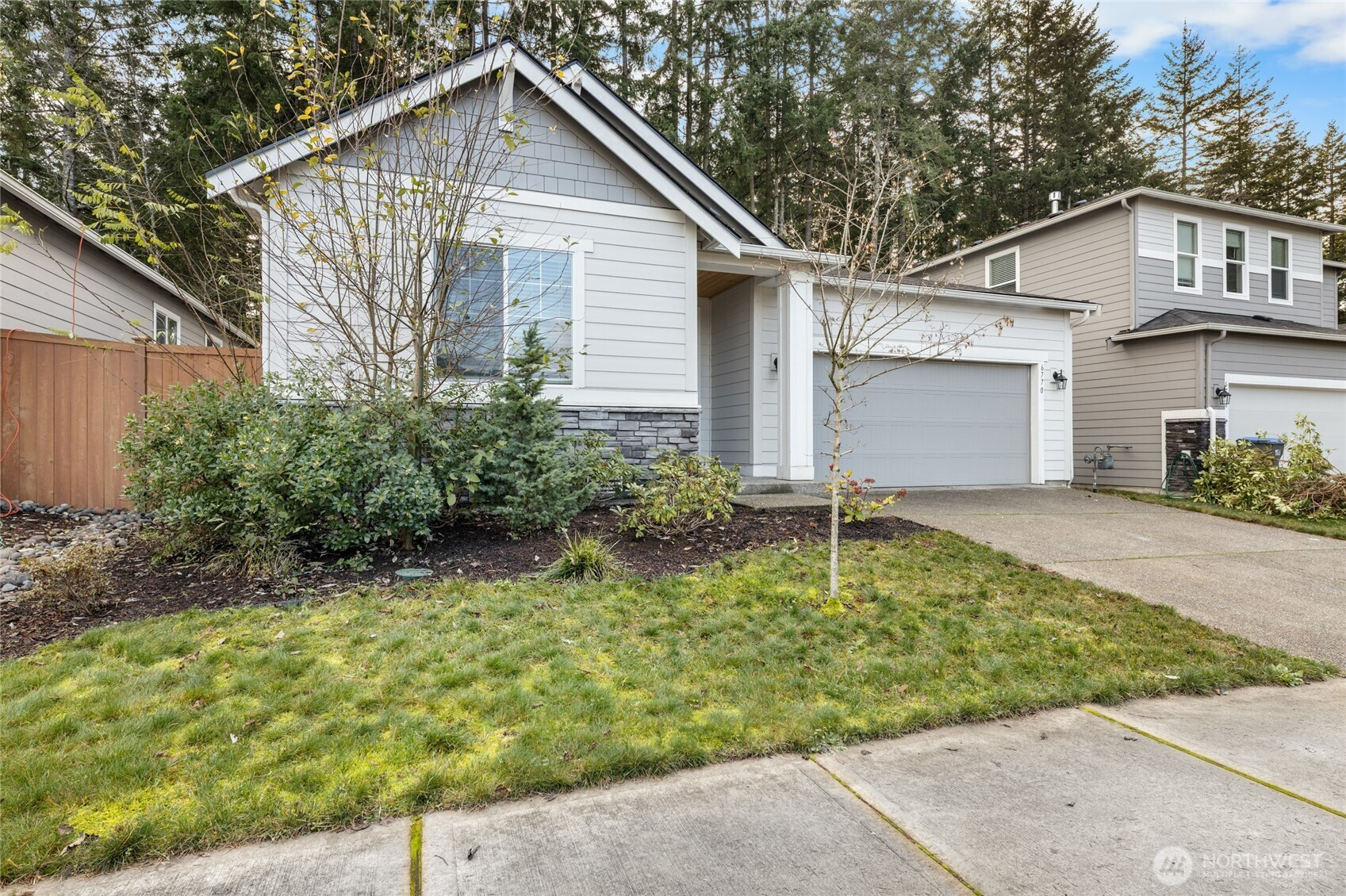 Welcome home to easy, single-level living on a beautifully maintained corner lot that backs up to a peaceful greenbelt, offering rare privacy and a serene outdoor setting. This 3-bedroom, 1.75-bath home plus office features laminate flooring, 9' ceilings, a cozy gas fireplace, and a chef’s kitchen with upgraded cabinetry and standard countertops. The spacious primary suite is thoughtfully separated from the guest bedrooms and includes a walk-in closet and private bath. Enjoy solar panels, a covered back patio, a separate laundry room, and a large garage. Ideally located close to town, the freeway, and the ferry, yet comfortably removed from the bustle.