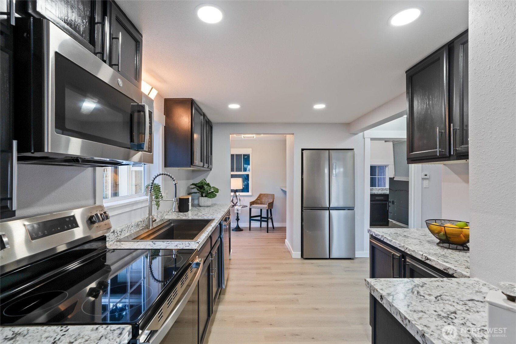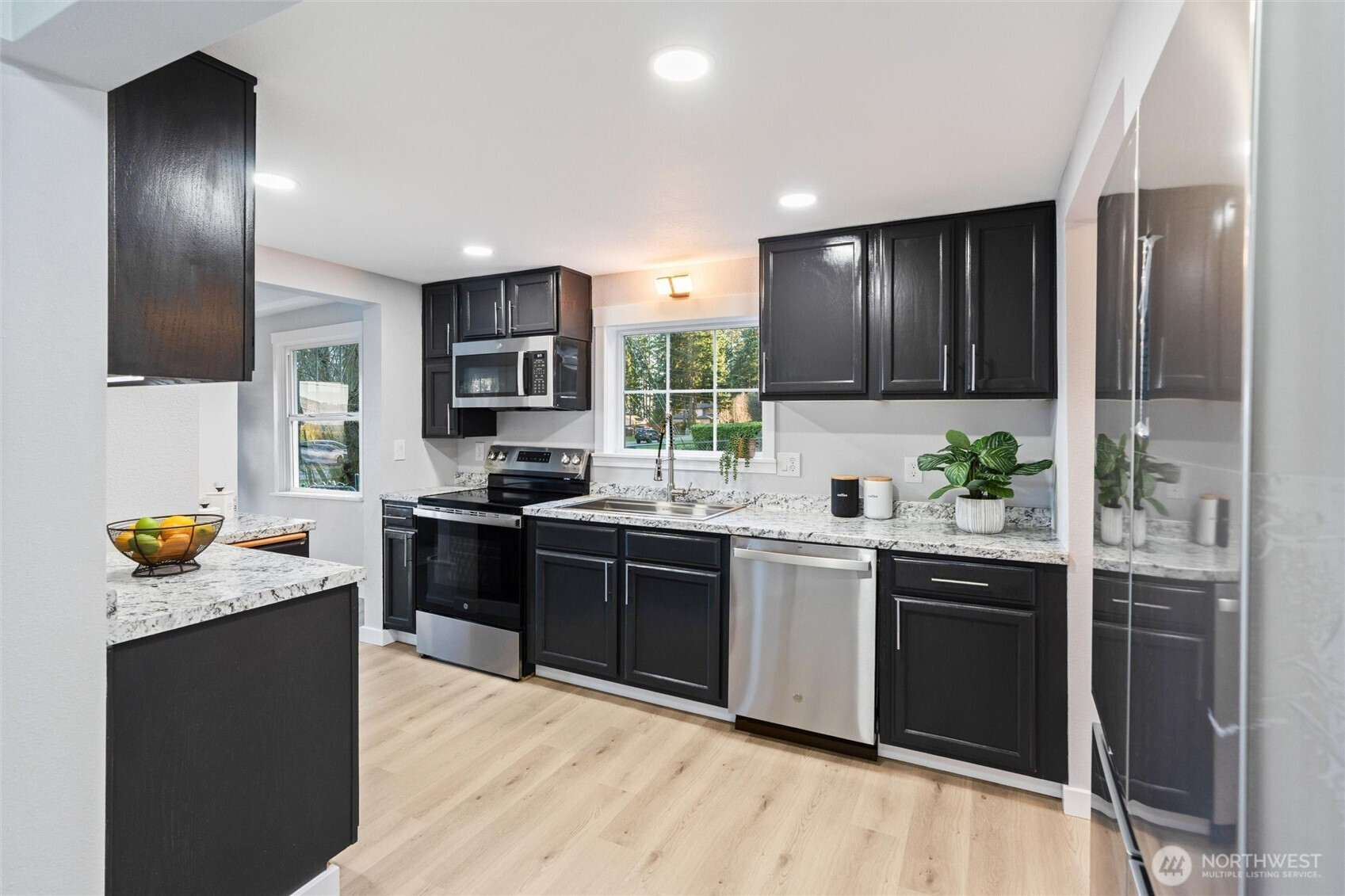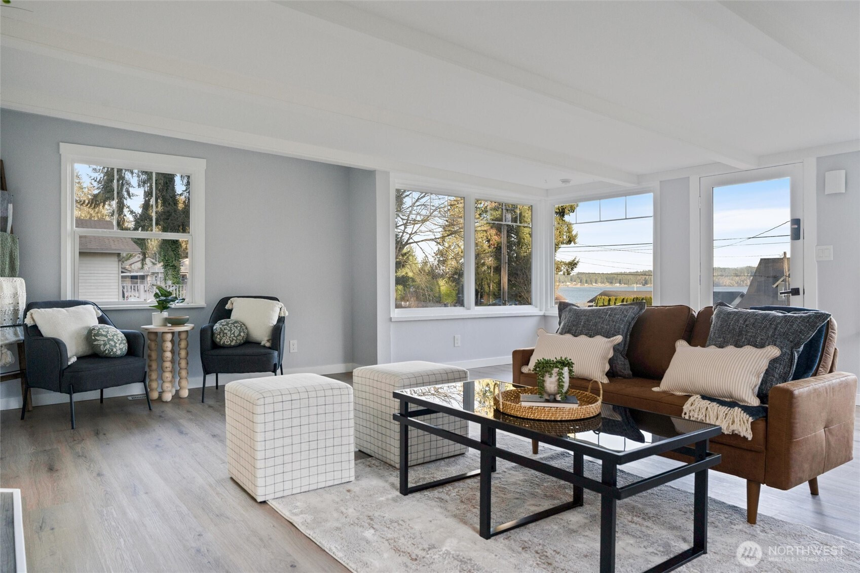 Pure perfection inside and out, this beautifully renovated home offers stunning Puget Sound views and a bright, thoughtful layout designed for comfort and style. Every detail has been refreshed, beginning with brand-new, never-used kitchen appliances, new countertops, and updated finishes that make the heart of the home feel modern and inviting. The upper level features three comfortable bedrooms, a versatile bonus room, and a fully renovated bath, while the main level offers an expansive, light-filled living room anchored by a brand-new built-in electric fireplace. Extensive upgrades provide true peace of mind: new flooring, fresh interior and exterior paint, all new light fixtures, updated insulation, and approximately 90% new drywall. Major system improvements include a new furnace, fully updated electrical with a new exterior panel, and redone plumbing. Both decks are completely rebuilt— with built-in benches perfect for enjoying the Dyes Inlet scenery. The foundation has been reinforced for added stability, and all interior doors have been replaced, including a new French door for the office or dining area. A convenient mudroom leads to the fully fenced backyard, ideal for pets and outdoor living. The large detached garage offers excellent storage and workspace. Located close to freeway access, this move-in-ready home blends beauty, function, and quality craftsmanship at every turn.
