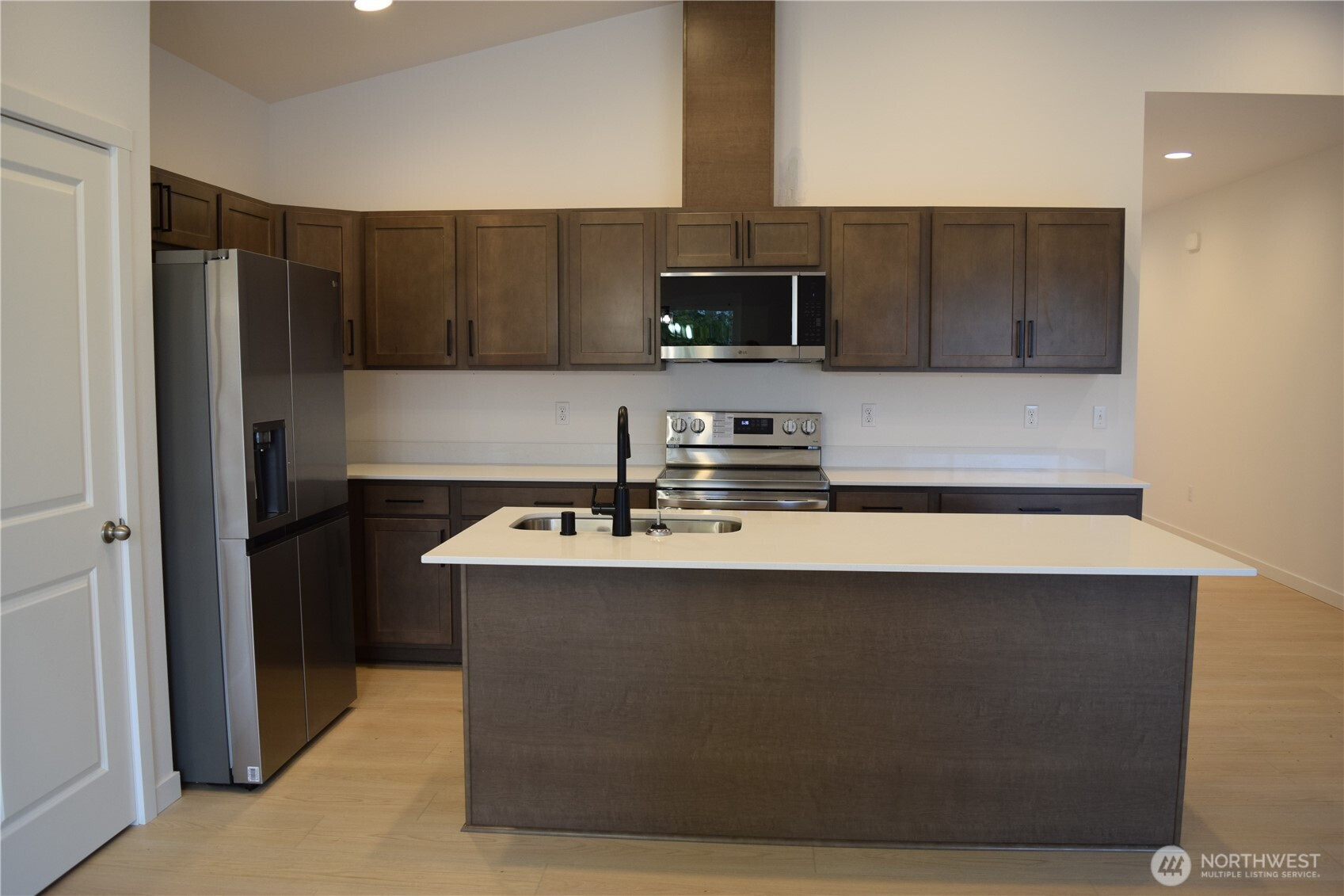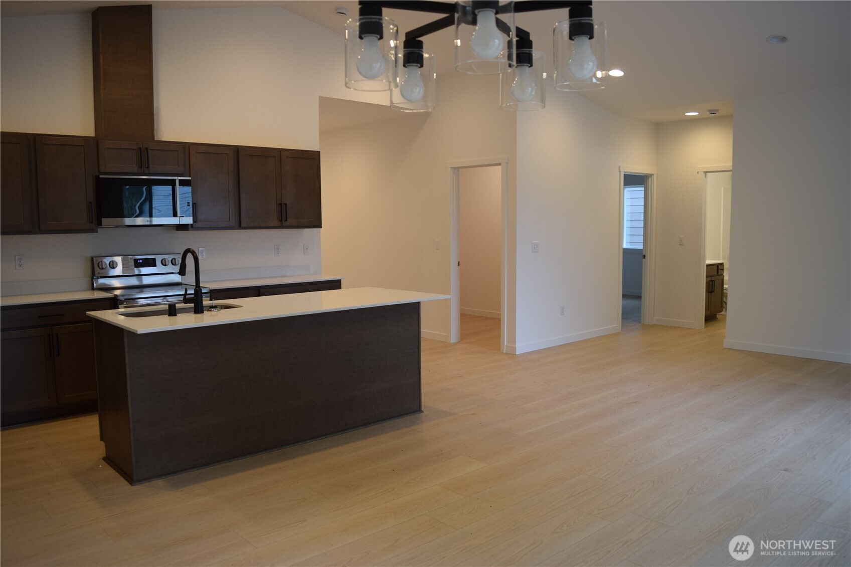 New 3 Bedroom One Story Home with an Open Floor Plan and Vaulted Ceilings in the Great Room and Primary Bedroom. Primary Bedroom in one side of the home away from other 2 Bedroom and it has a Walk in Closet and 3/4 Bath. Kitchen has an Extended Breakfast Bar off of the Island Countertop. Countertops in Kitchen and Bathrooms are quartz. All kitchen appliances are black/stainless steel. Home is completed. There is a completed 2 car garage with insulation, drywall, tape, texture and paint. Also included is an automatic garage door opener. Large Exterior deck.