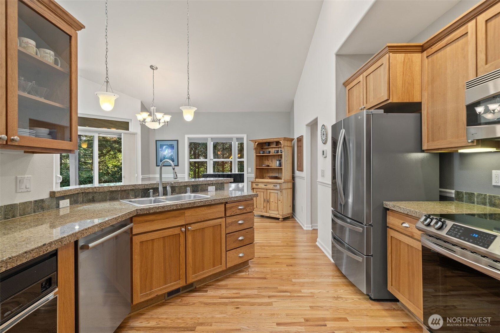 Tucked away on a quiet cul-de-sac inside the gated Dunraven enclave of McCormick Woods-this beautifully maintained one-level home offers effortless living in a serene, nature-filled setting. Designed for easy living the open concept layout features warm wood flooring throughout, an inviting living room with vaulted ceilings, skylights, and ceiling fan. A gas fireplace provides the perfect ambience for relaxing evenings. The well-appointed kitchen has quality custom cabinetry and can accommodate either a gas or electric stove. The versatile bonus room would make an ideal home office, den, craft room. Expansive windows throughout the home frame peaceful views of the private greenbelt, filling the interior with natural light. Step outside to a covered patio perfect for relaxation and entertaining friends. Garage has premium attic storage space and built-in cabinets. Thoughtfully updated for comfort and peace of mind, including a new roof in 2025, a fully redone crawl space 2026, and the addition of A/C. A whole-house generator ensures uninterrupted living-no matter the weather- while a natural gas furnace, fireplace, and hot water heater provide efficient, cost-effective energy year-round. The HOA maintains all the landscaping around the home, making this a true lock-and-leave property. The McCormick Woods community features a golf course, club with restaurant, walking trails, pickle ball courts. Easy access to shopping, services, restaurants, and ferry routes to Seattle.