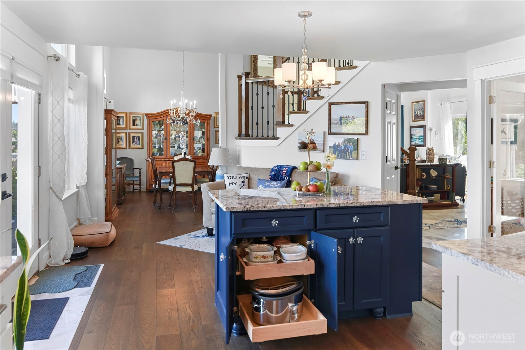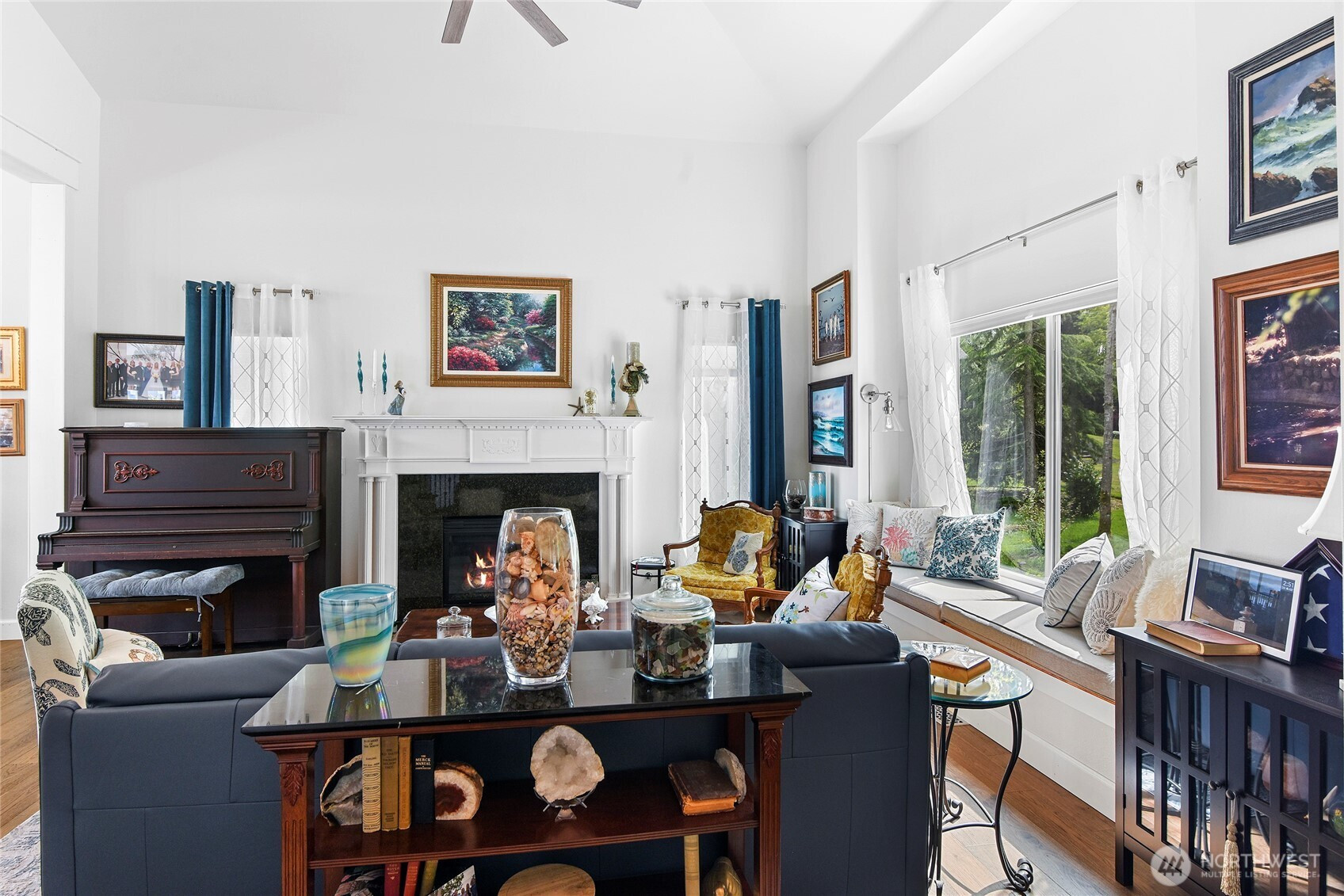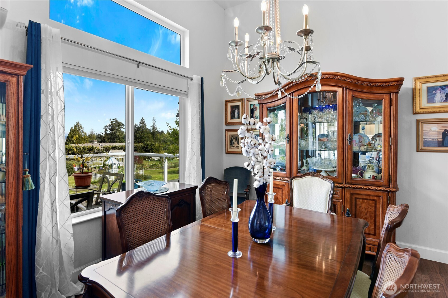 Set on nearly an acre in a gated community, This view-driven property captures sweeping vistas of the shipping lanes and Cascade Mountains. The 3-bedroom, 2.5 bath home is filled with natural light from expansive windows and features a marble foyer, rich hickory plank flooring, and a gas fireplace with custom mantel anchoring the main living space. A formal dining room with chandelier adds a refined touch. All The interior is recently updated -kitchen offers a custom breakfast bar, granite countertops, double ovens, and a professional 48-inch gas range—all positioned to take in the views. The main level also includes a den/office,.5 bath, separate laundry, and access to the 2-car garage with extra storage, a custom wood and wrought iron staircase leads to the primary suite with stunning views, a walk-in closet, and a spacious 5-piece bath Also tasteful use of marble and quartz throughout home. Two additional bedrooms and a full bath complete the upper level. Outdoors, enjoy a paved driveway, 40’ greenbelt buffer, nine fruit trees, raised garden beds, a 12x16 shed. Offering privacy & security-a great place to live.