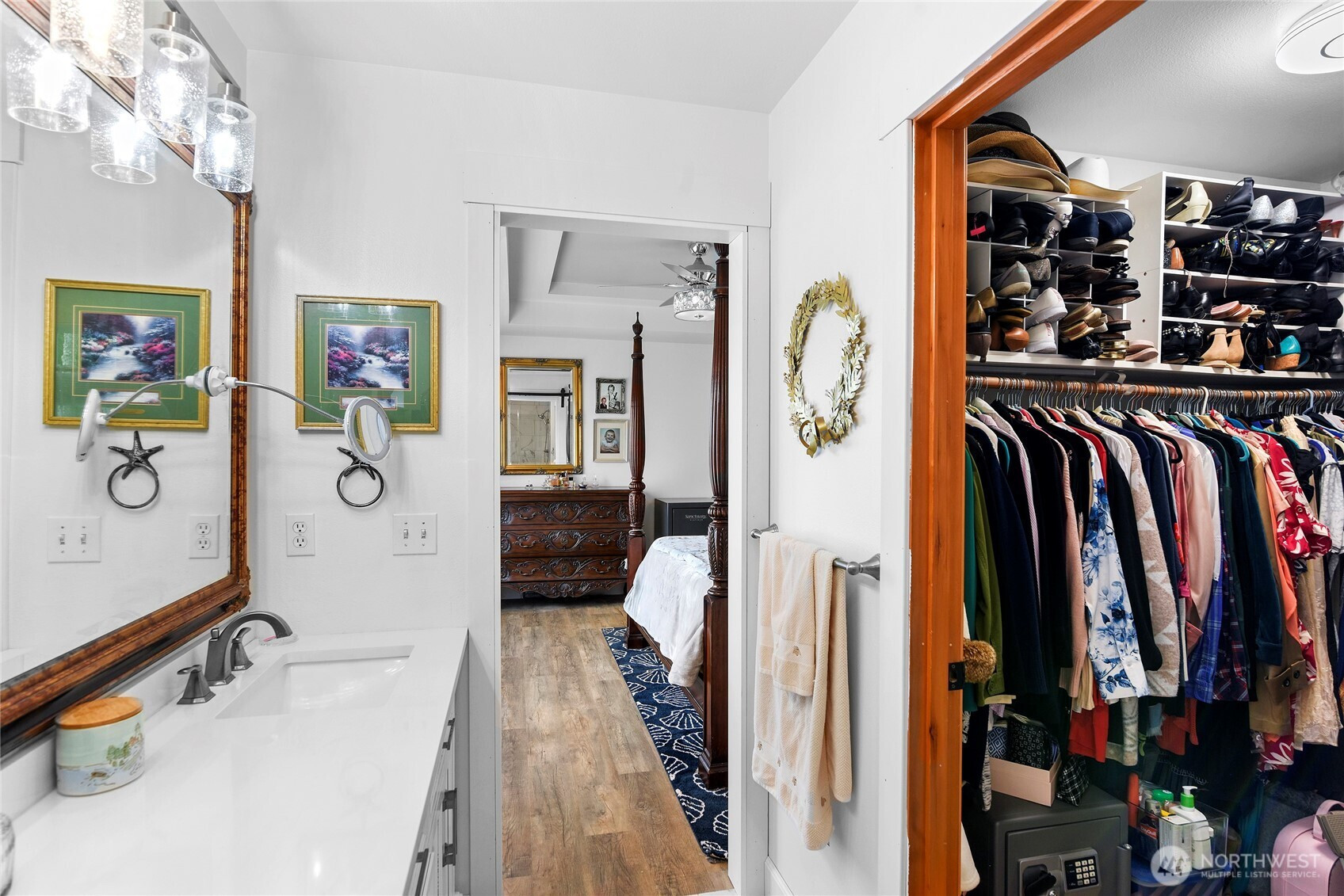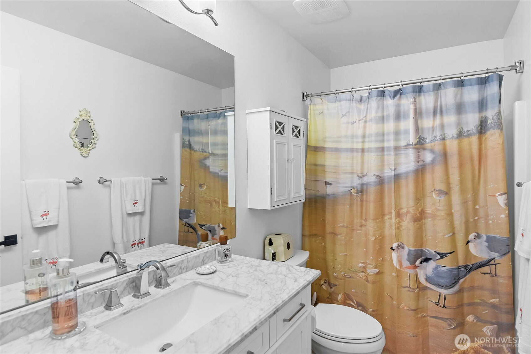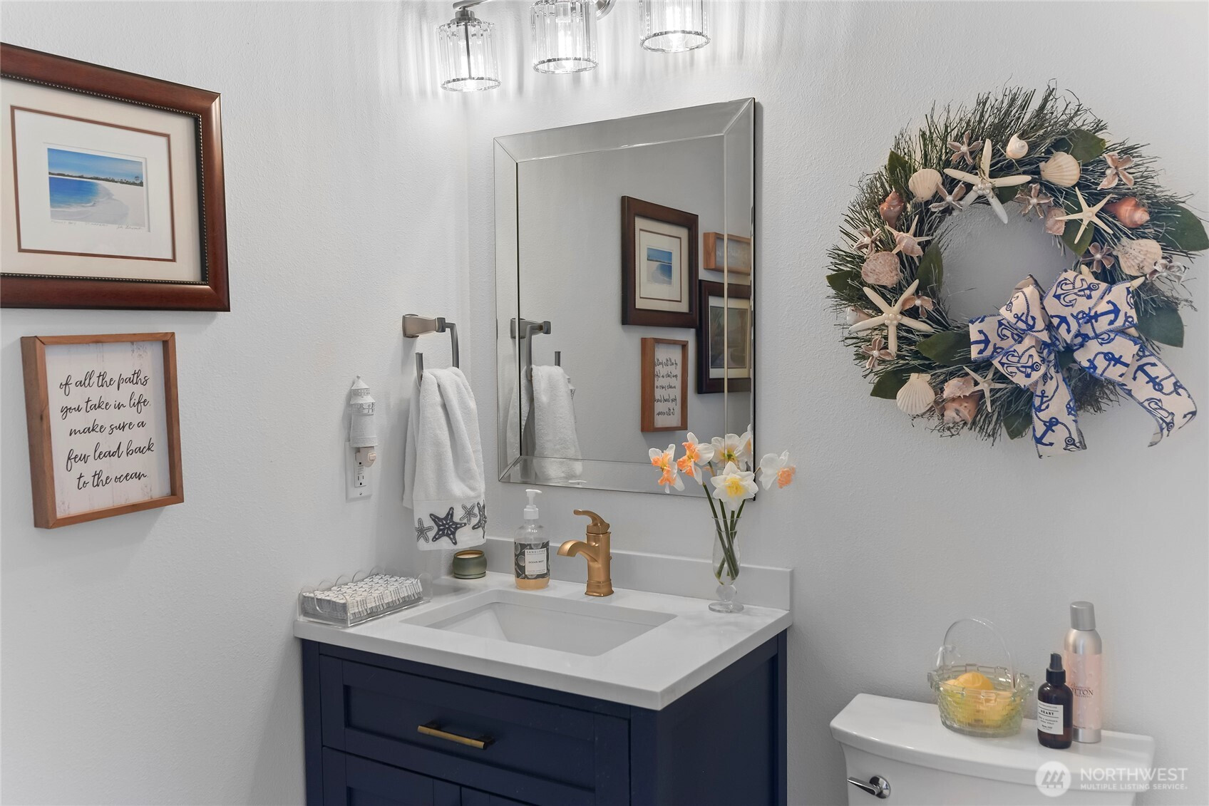 Set on nearly an acre in a gated community, This view-driven property captures sweeping vistas of the shipping lanes and Cascade Mountains. The 3-bedroom, 2.5 bath home is filled with natural light from expansive windows and features a marble foyer, rich hickory plank flooring, and a gas fireplace with custom mantel anchoring the main living space. A formal dining room with chandelier adds a refined touch. All The interior is recently updated -kitchen offers a custom breakfast bar, granite countertops, double ovens, and a professional 48-inch gas range—all positioned to take in the views. The main level also includes a den/office,.5 bath, separate laundry, and access to the 2-car garage with extra storage, a custom wood and wrought iron staircase leads to the primary suite with stunning views, a walk-in closet, and a spacious 5-piece bath Also tasteful use of marble and quartz throughout home. Two additional bedrooms and a full bath complete the upper level. Outdoors, enjoy a paved driveway, 40’ greenbelt buffer, nine fruit trees, raised garden beds, a 12x16 shed. Offering privacy & security-a great place to live.