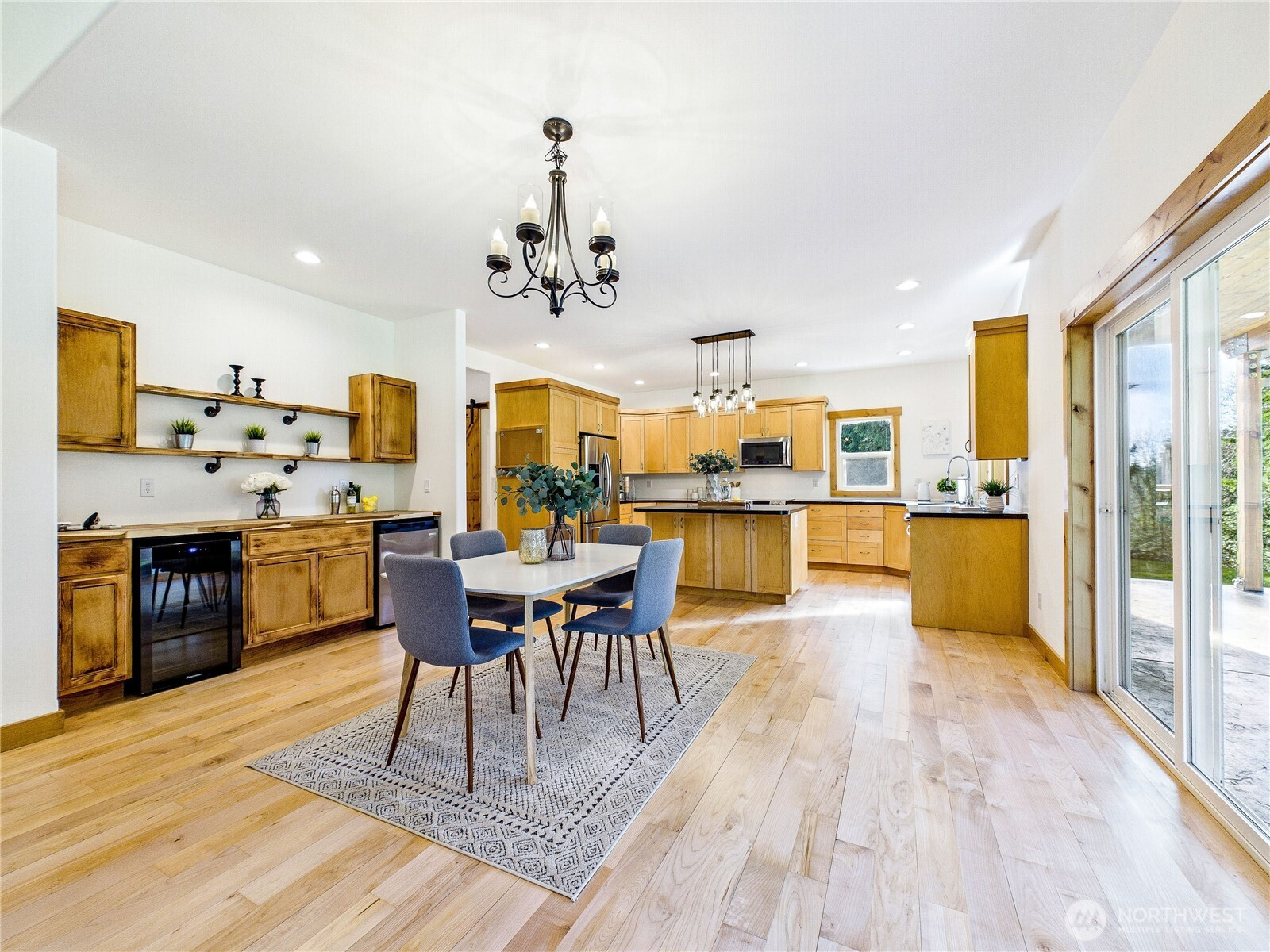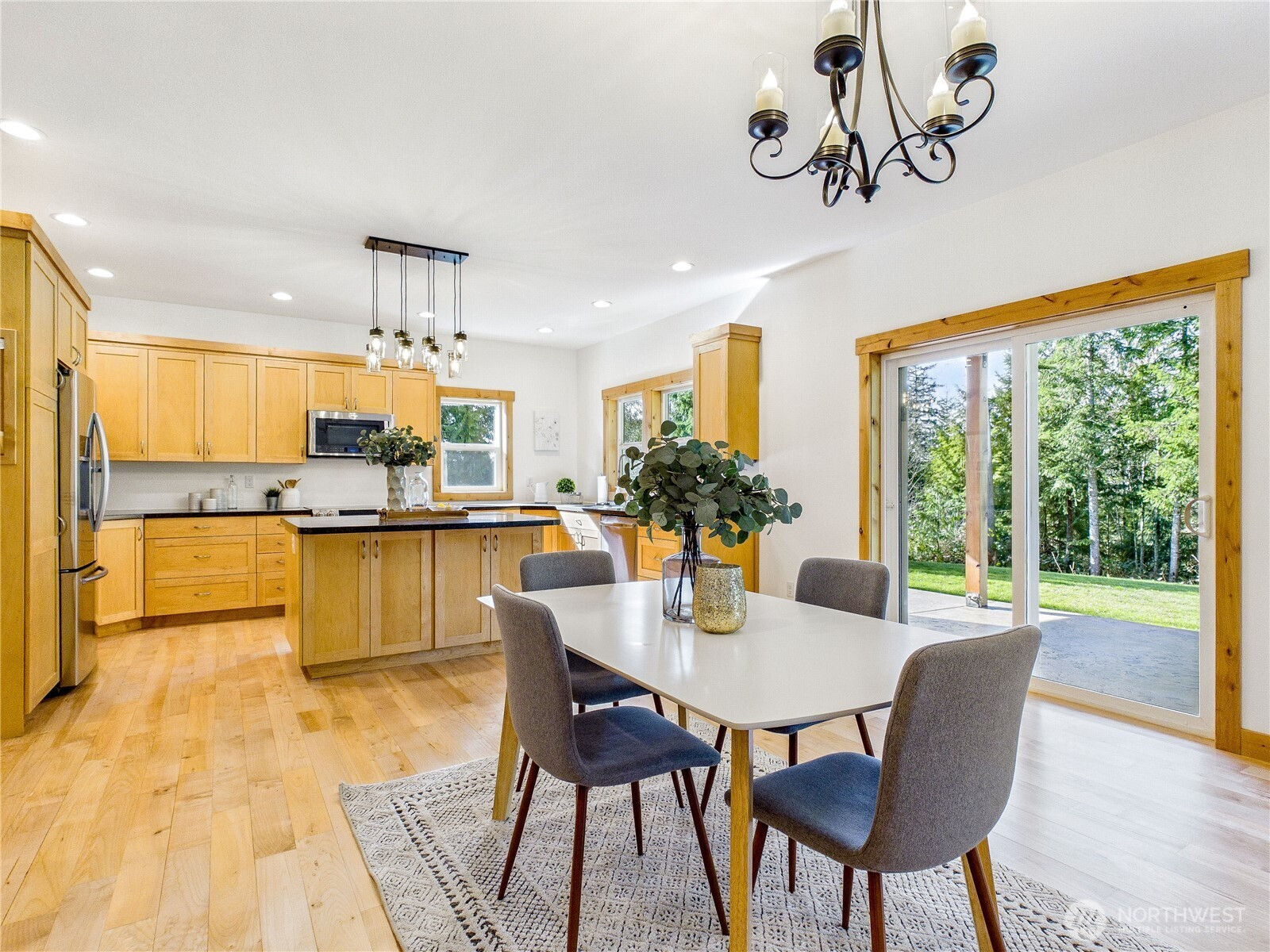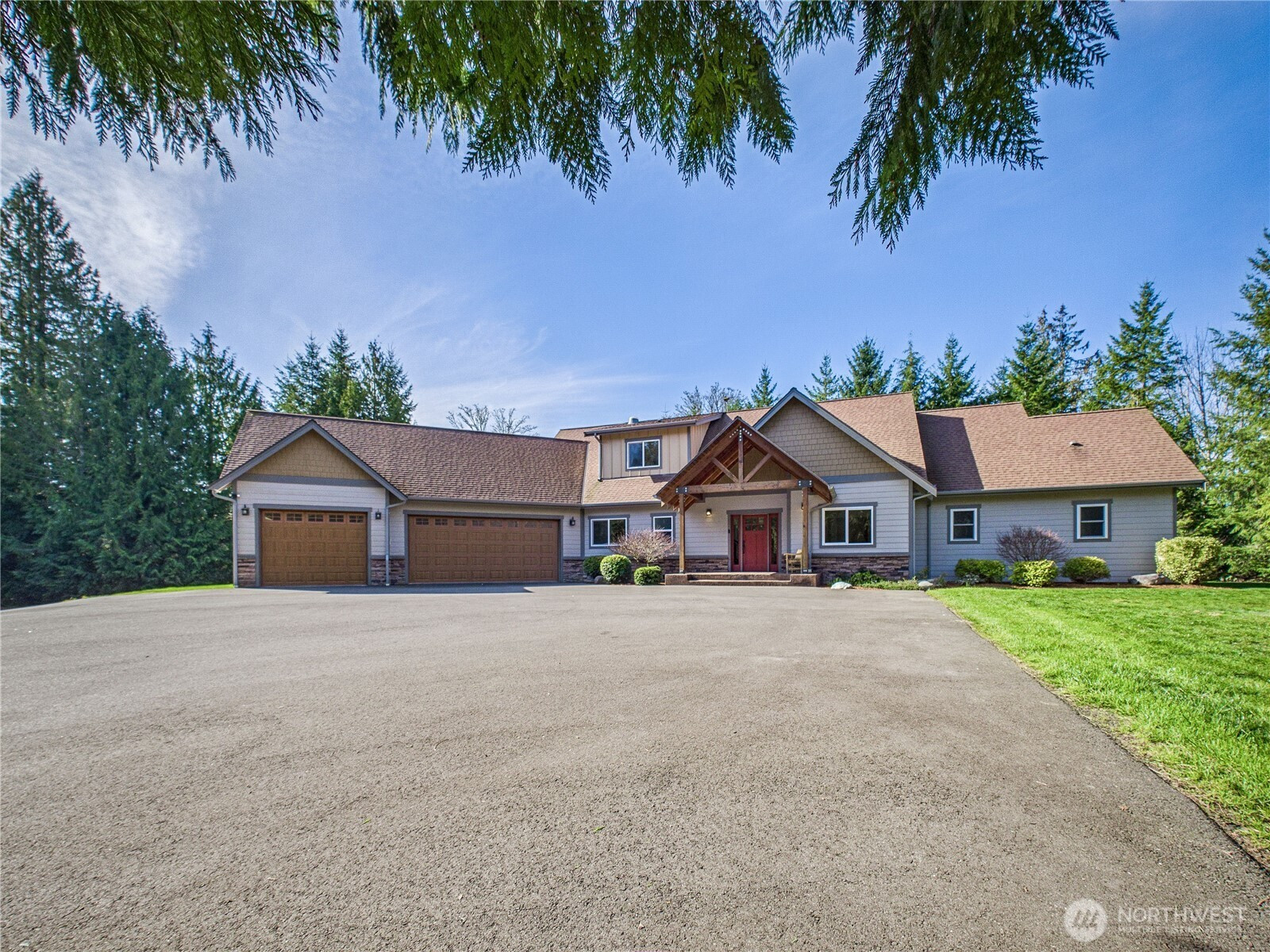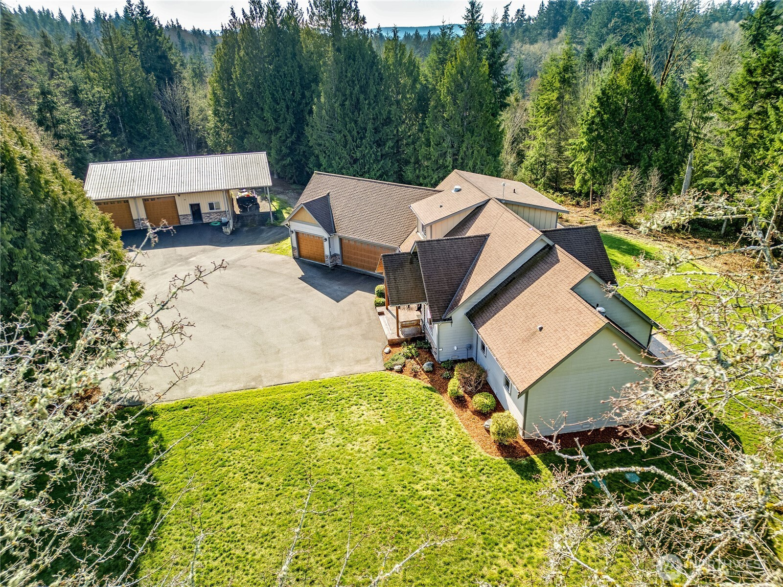 Private, peaceful, and beautifully crafted, this custom Kingston estate sits on more than 5 acres just minutes from the Kingston Ferry for an easy Seattle commute. Built with quality in mind, the home features solid-core doors, central vacuum, durable finishes, and craftsmanship rarely found in typical construction. Inside, soaring ceilings and expansive windows fill the open-concept living spaces with natural light, while hardwood floors, Corian counters, a spacious kitchen designed for gathering, and brand new carpet create a warm interior suited for everyday living and entertaining. The main-level primary suite offers comfortable main-floor living with a well-appointed bath and a large walk-in closet. The acreage provides a private natural setting with a mix of usable space and gentle terrain, including a drop in the backyard that adds separation and a wooded feel. A 3-car attached garage and an impressive 40' x 56' shop with covered RV parking provide exceptional space for vehicles, equipment, hobbies, and storage. A rare combination of privacy, quality construction, and convenience just minutes down a fully paved driveway and road to the ferry and downtown Kingston.