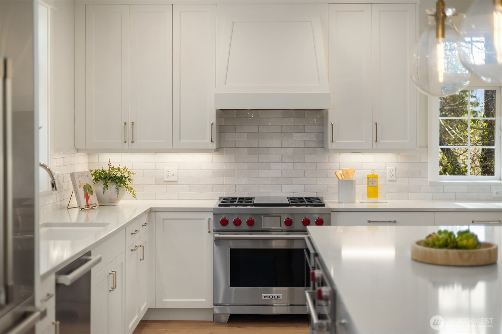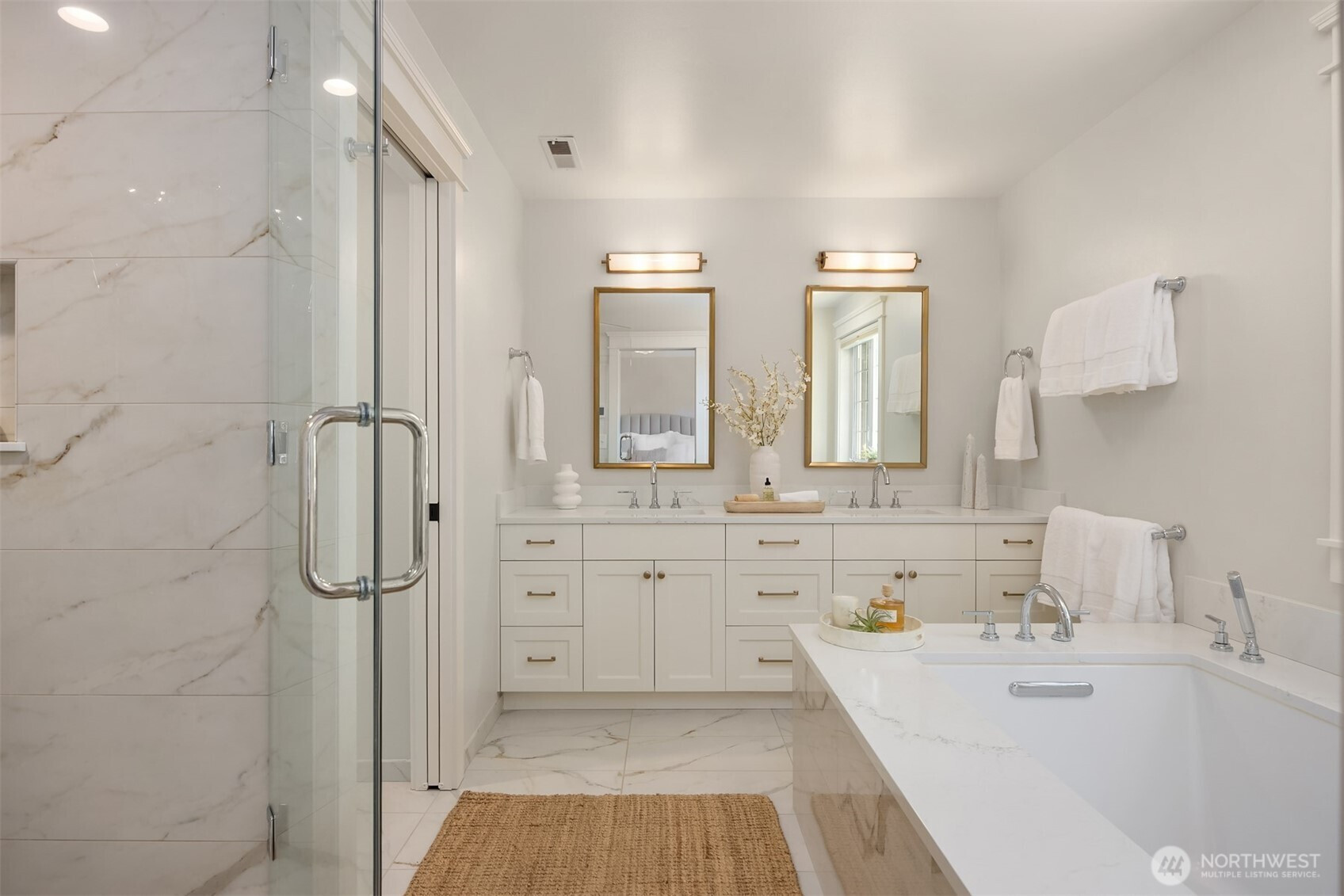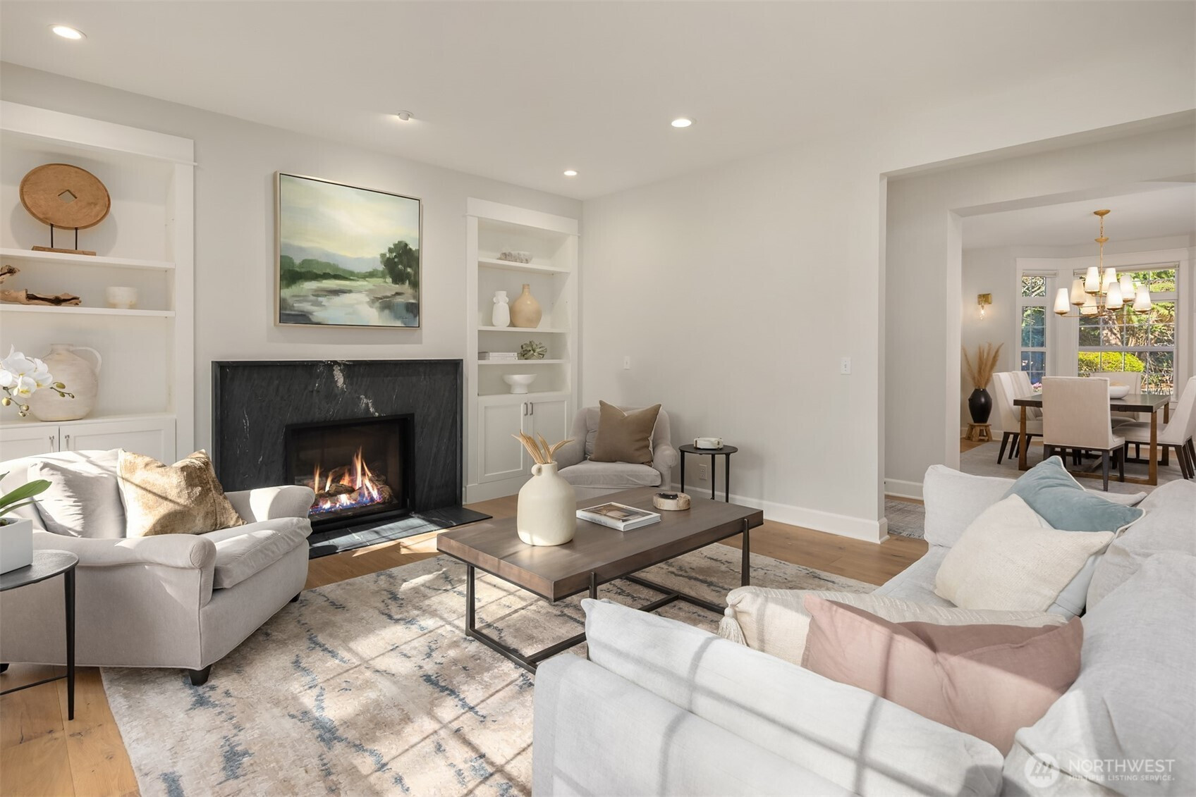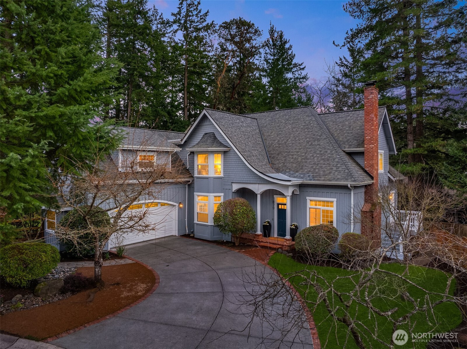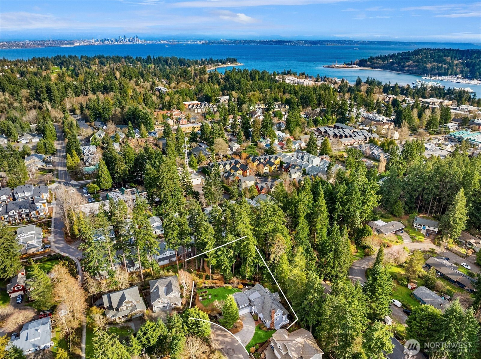 Winslow Haven Estate — a 5,349 sq ft designer-renovated custom residence on a rare two-parcel compound minutes to Winslow, waterfront, and the Seattle ferry. French white oak floors, custom cabinetry, fluted wood vanities, and curated lighting create a cohesive, elevated aesthetic throughout. Main-floor living and dining center on the chef’s kitchen with quartz counters, a Wolf range, and premium appliances. The living room features a fireplace with art niche and built-ins, while French doors off the kitchen open to a covered deck for year-round outdoor living. A main-floor bedroom offers a private entrance, and the reading room enjoys a wood-burning fireplace. Upstairs, the vaulted primary suite includes a spa-like bath with soaking tub, tiled shower, dual vanities, and heated floors. Additional bedrooms plus a flexible bonus room adapt for guests, fitness, or creative work. The 1,700+ sq ft lower level offers a private entrance, flexible second-kitchen area (wet bar / kitchenette—buyer to verify), bedroom, media room, infrared sauna, and designer bath—ideal for extended stays and flexible living arrangements. Enjoy the comfort of heating/cooling. Professionally landscaped grounds include a signature storybook garden cottage, raised vegetable beds, fruit trees, an evergreen grove trail, and a fire pit. The adjacent parcel at 885 Taurnic Pl NW offers future potential for a residence, guest house, or studio—buyer to verify feasibility and permitting. Welcome home!