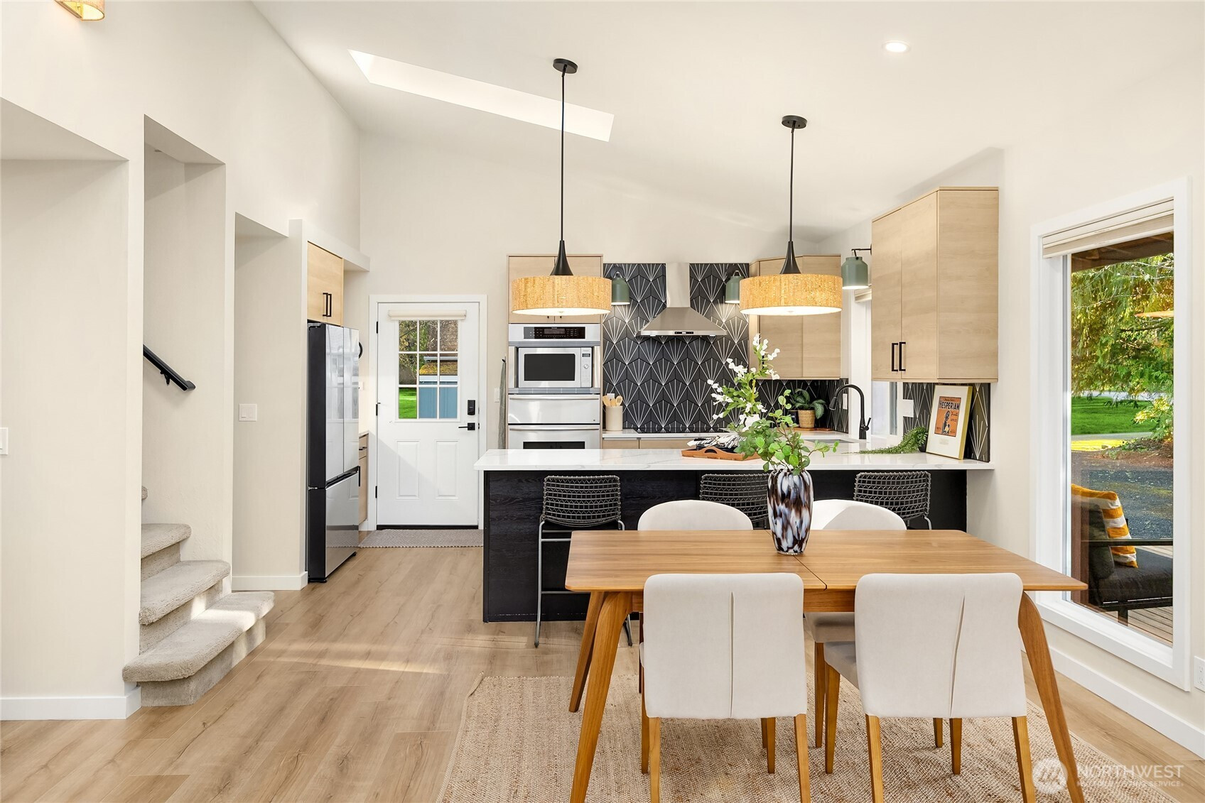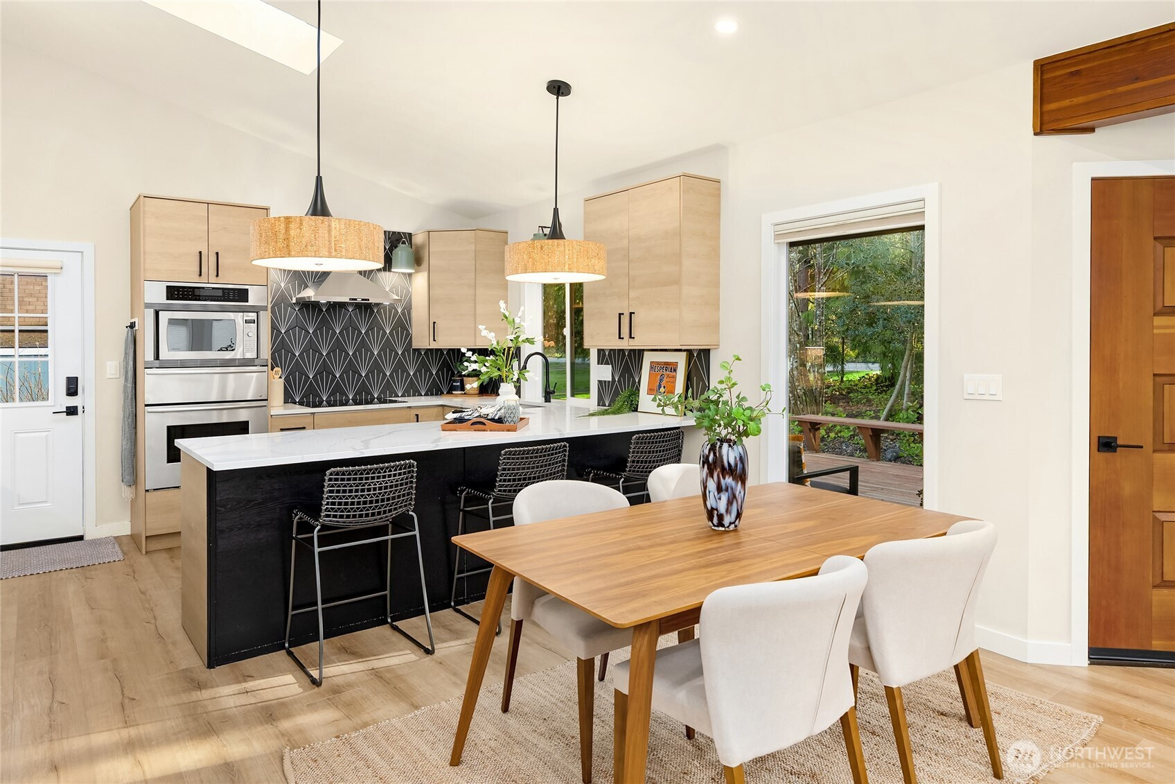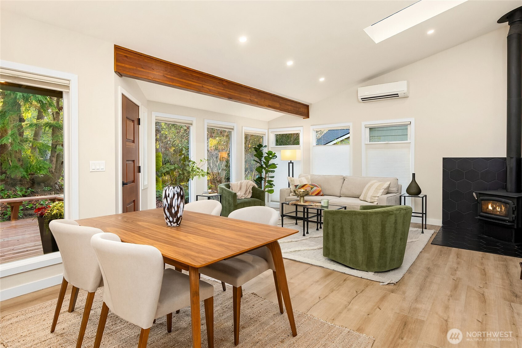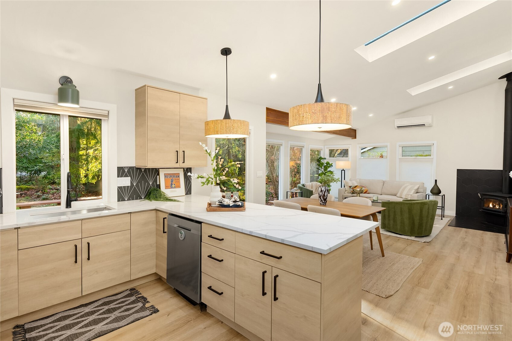 Experience the perfect blend of modern style and smart design in this fabulously updated home just minutes from the heart of Winslow and the ferry to Seattle. Thoughtfully designed for efficient living, the open-concept kitchen, dining, and living space is filled with natural light, highlighted by vaulted ceilings with exposed beams and a cozy woodstove that anchors the space. The stunning kitchen is perfect for both everyday living and entertaining featuring quartz countertops, designer tile and lighting, stainless Thermador and Samsung appliances, and a deep double stainless sink. Step outside to a partial wrap-around deck with easy access to the yard, ideal for relaxing or hosting gatherings. The main floor primary bedroom offers comfort and convenience with an adjacent 3/4 bath showcasing a tiled shower and sleek floating vanity, while a second main-level bedroom provides flexibility as a den or office. A laundry closet on the main floor adds ease, and upstairs you’ll find two additional bedrooms each vaulted with skylights plus a shared full bath. With beautiful finishes throughout and an unbeatable location, this home truly has it all.