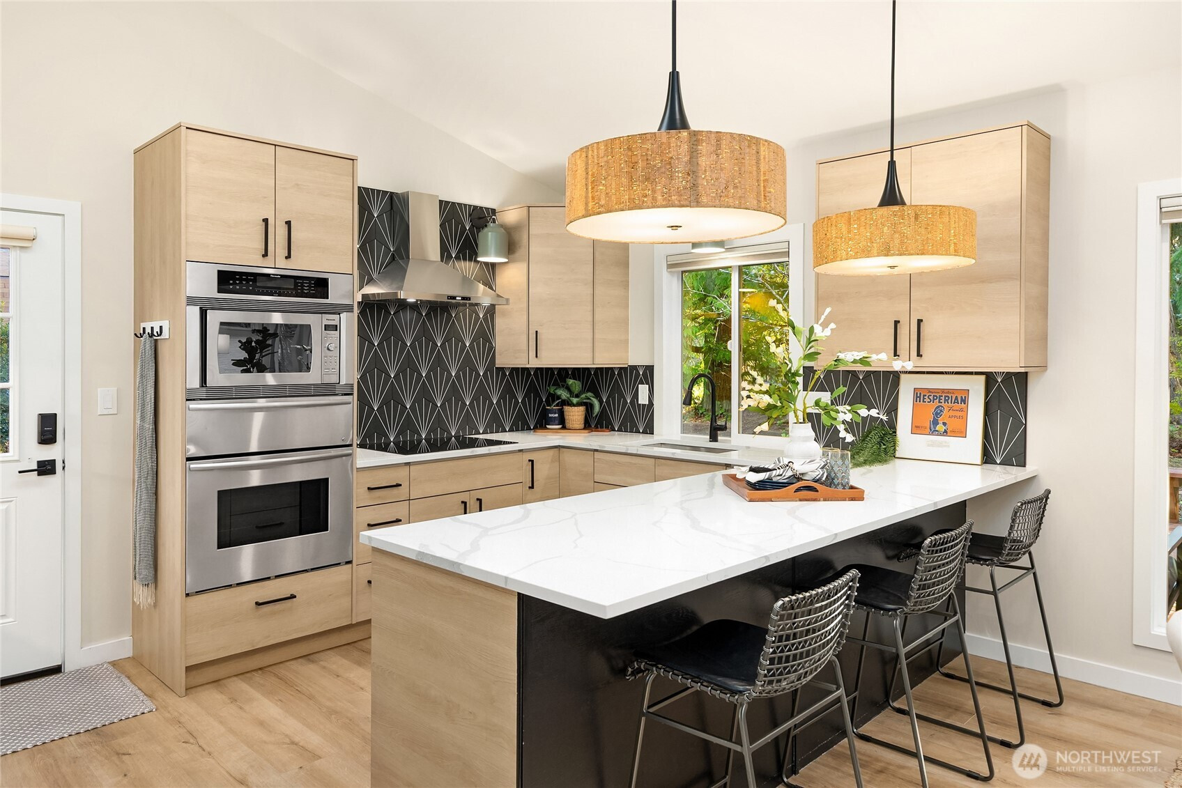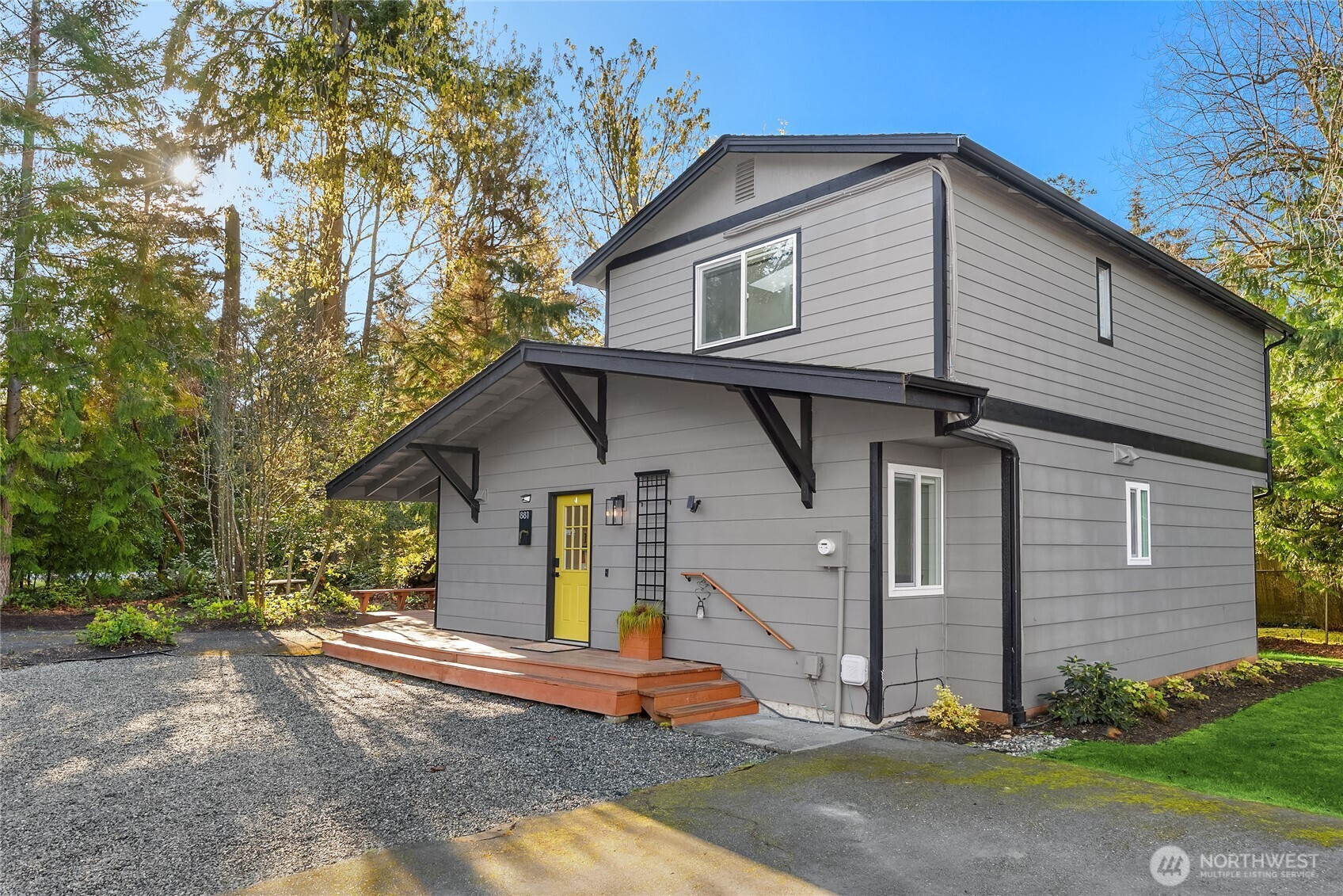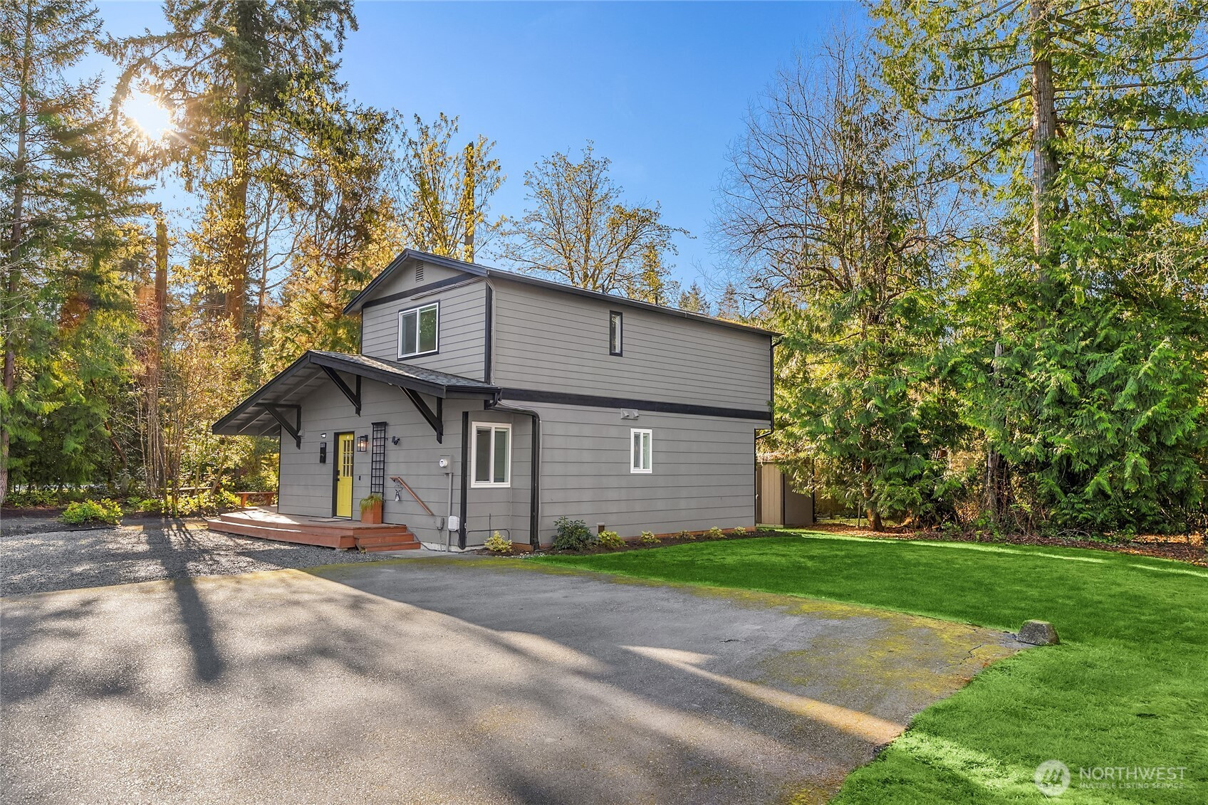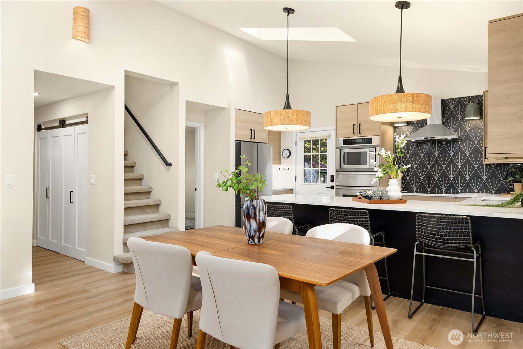 Experience the perfect blend of modern style and smart design in this fabulously updated home just minutes from the heart of Winslow and the ferry to Seattle. Thoughtfully designed for efficient living, the open-concept kitchen, dining, and living space is filled with natural light, highlighted by vaulted ceilings with exposed beams and a cozy woodstove that anchors the space. The stunning kitchen is perfect for both everyday living and entertaining featuring quartz countertops, designer tile and lighting, stainless Thermador and Samsung appliances, and a deep double stainless sink. Step outside to a partial wrap-around deck with easy access to the yard, ideal for relaxing or hosting gatherings. The main floor primary bedroom offers comfort and convenience with an adjacent 3/4 bath showcasing a tiled shower and sleek floating vanity, while a second main-level bedroom provides flexibility as a den or office. A laundry closet on the main floor adds ease, and upstairs you’ll find two additional bedrooms each vaulted with skylights plus a shared full bath. With beautiful finishes throughout and an unbeatable location, this home truly has it all.