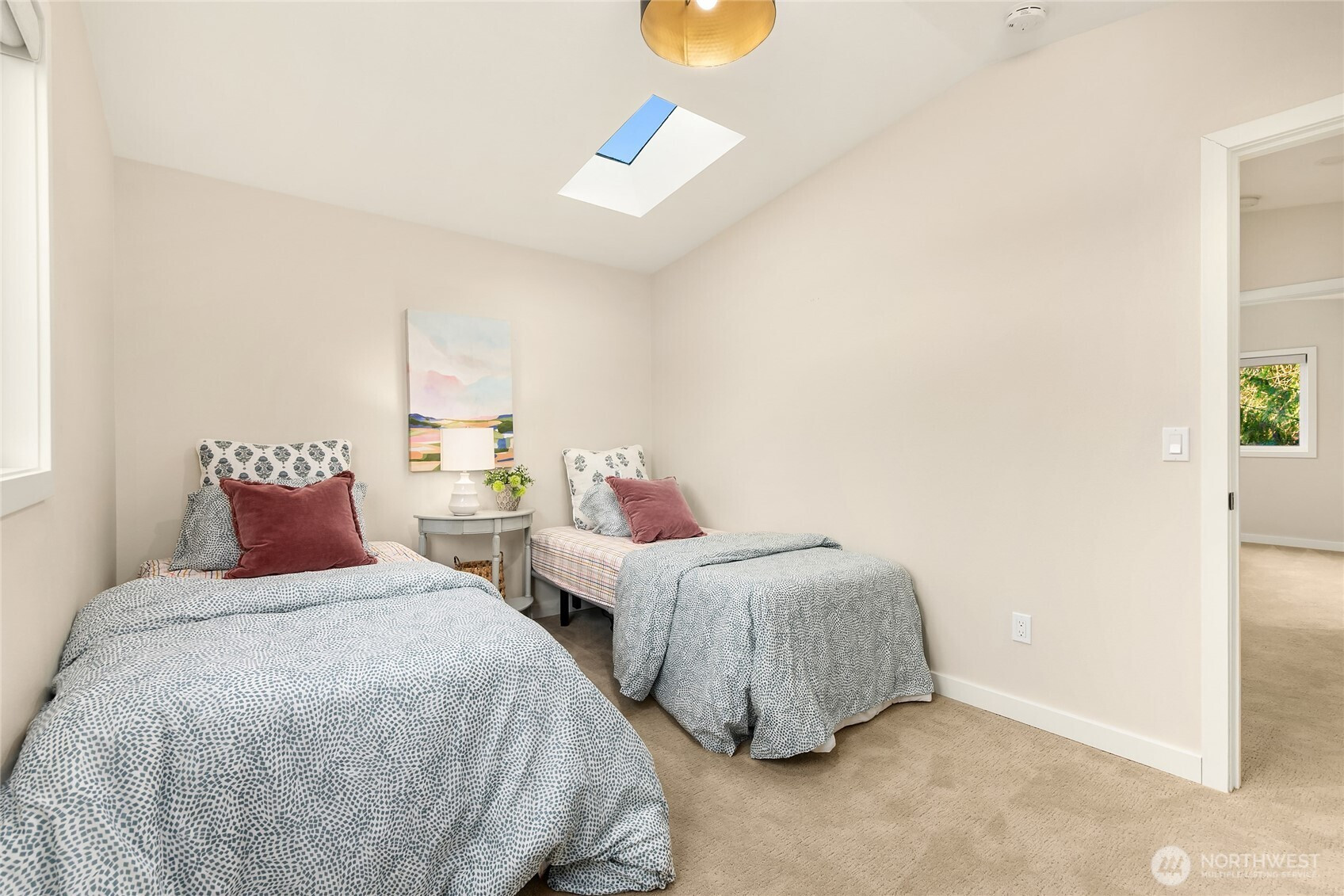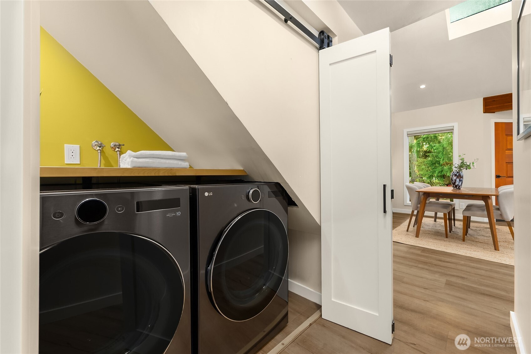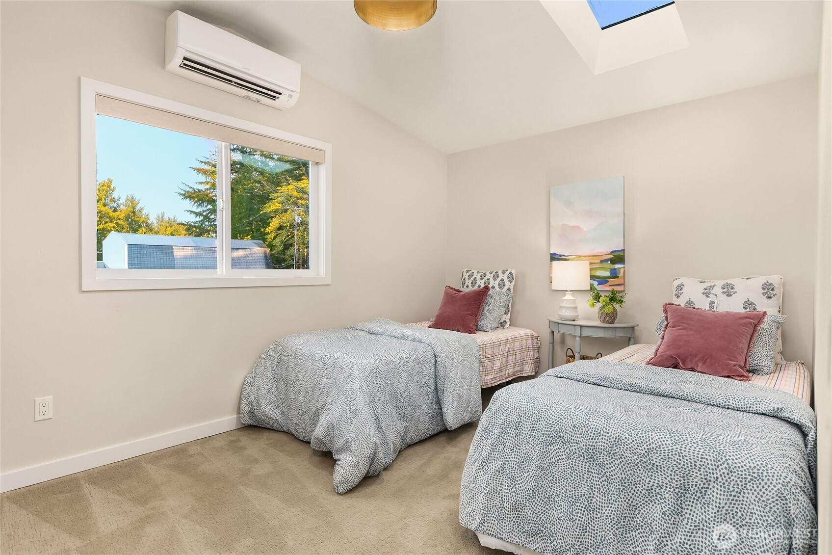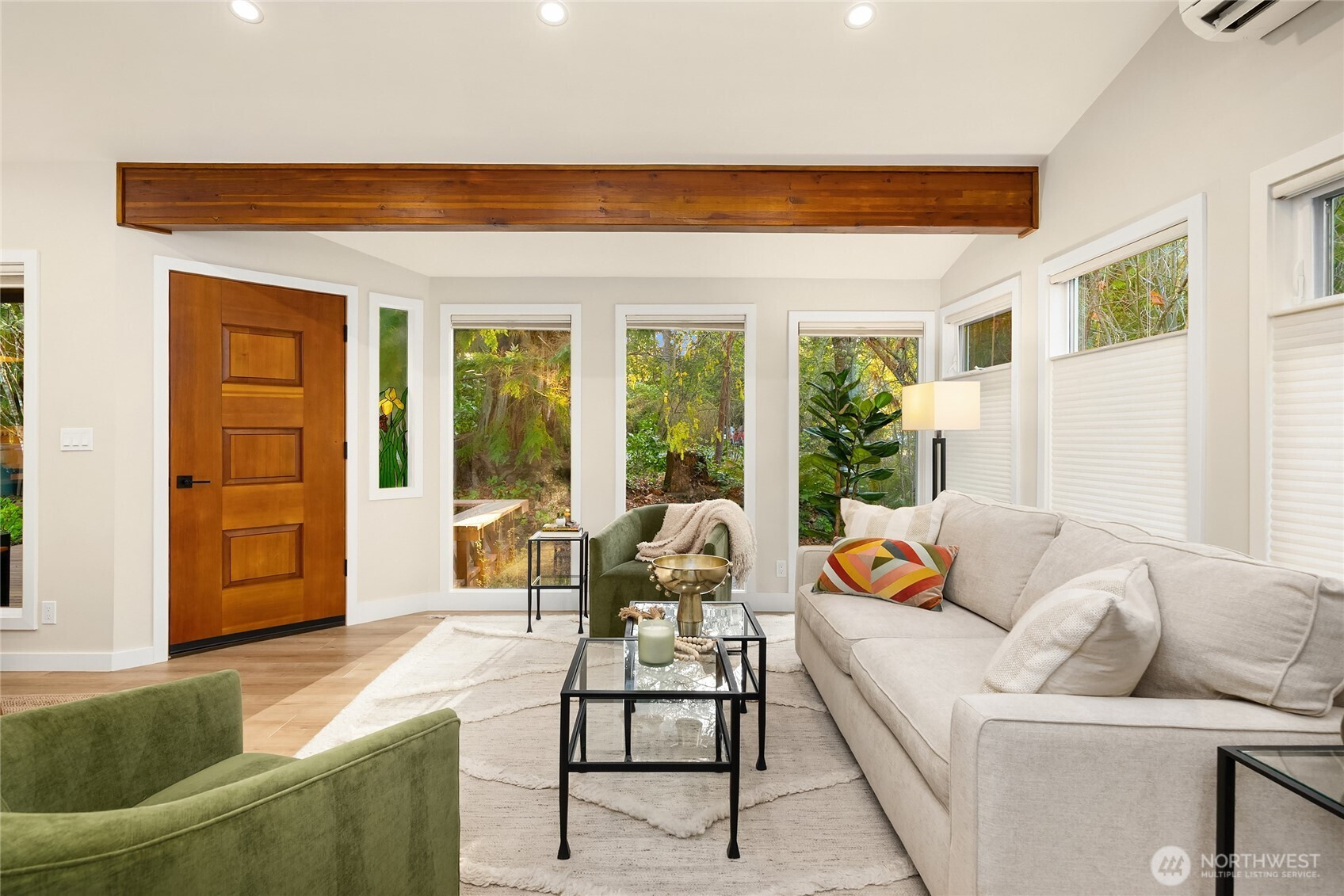 Experience the perfect blend of modern style and smart design in this fabulously updated home just minutes from the heart of Winslow and the ferry to Seattle. Thoughtfully designed for efficient living, the open-concept kitchen, dining, and living space is filled with natural light, highlighted by vaulted ceilings with exposed beams and a cozy woodstove that anchors the space. The stunning kitchen is perfect for both everyday living and entertaining featuring quartz countertops, designer tile and lighting, stainless Thermador and Samsung appliances, and a deep double stainless sink. Step outside to a partial wrap-around deck with easy access to the yard, ideal for relaxing or hosting gatherings. The main floor primary bedroom offers comfort and convenience with an adjacent 3/4 bath showcasing a tiled shower and sleek floating vanity, while a second main-level bedroom provides flexibility as a den or office. A laundry closet on the main floor adds ease, and upstairs you’ll find two additional bedrooms each vaulted with skylights plus a shared full bath. With beautiful finishes throughout and an unbeatable location, this home truly has it all.