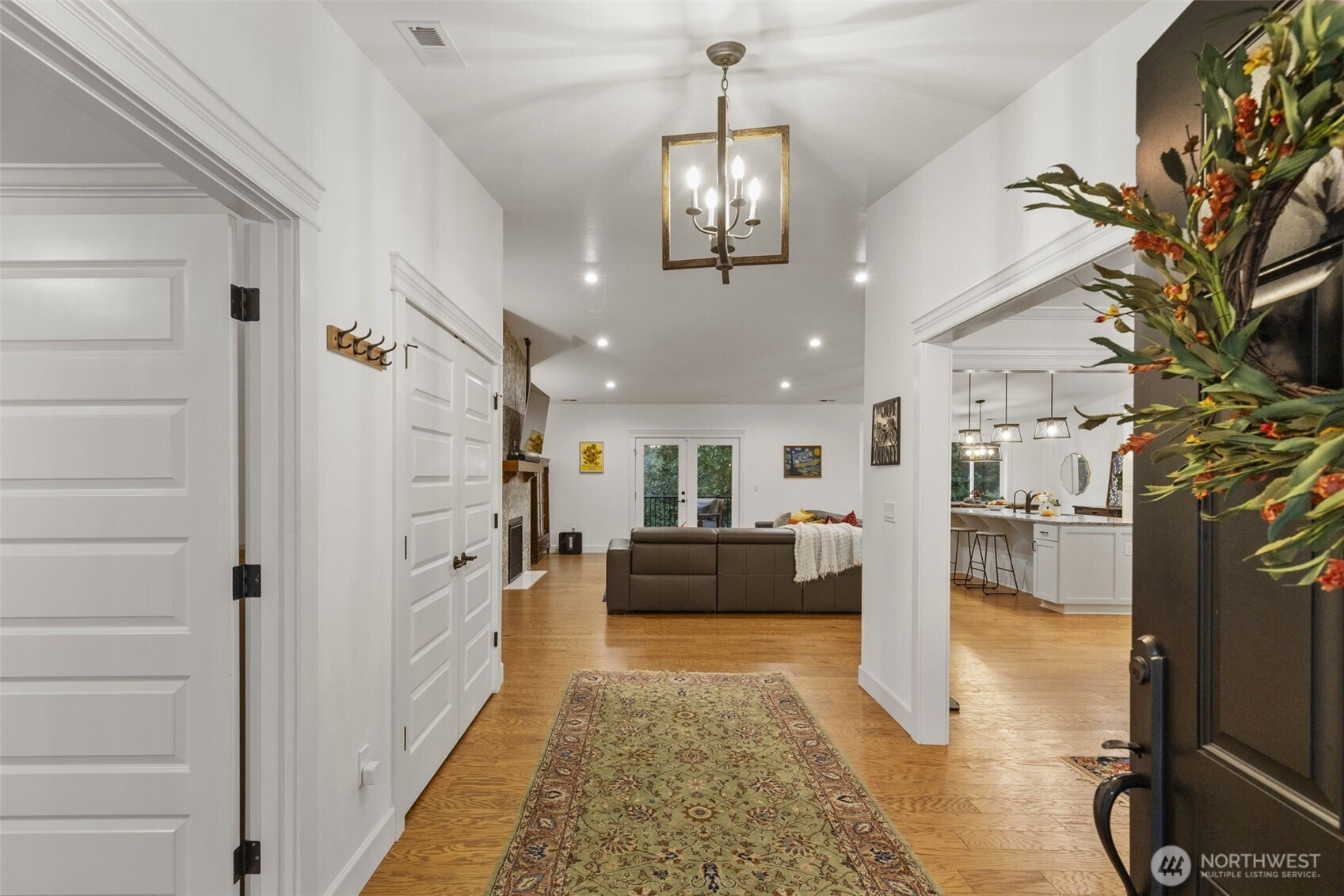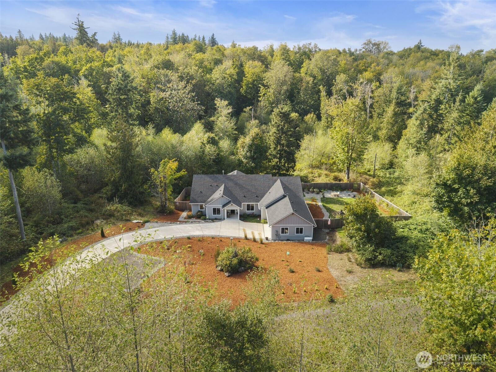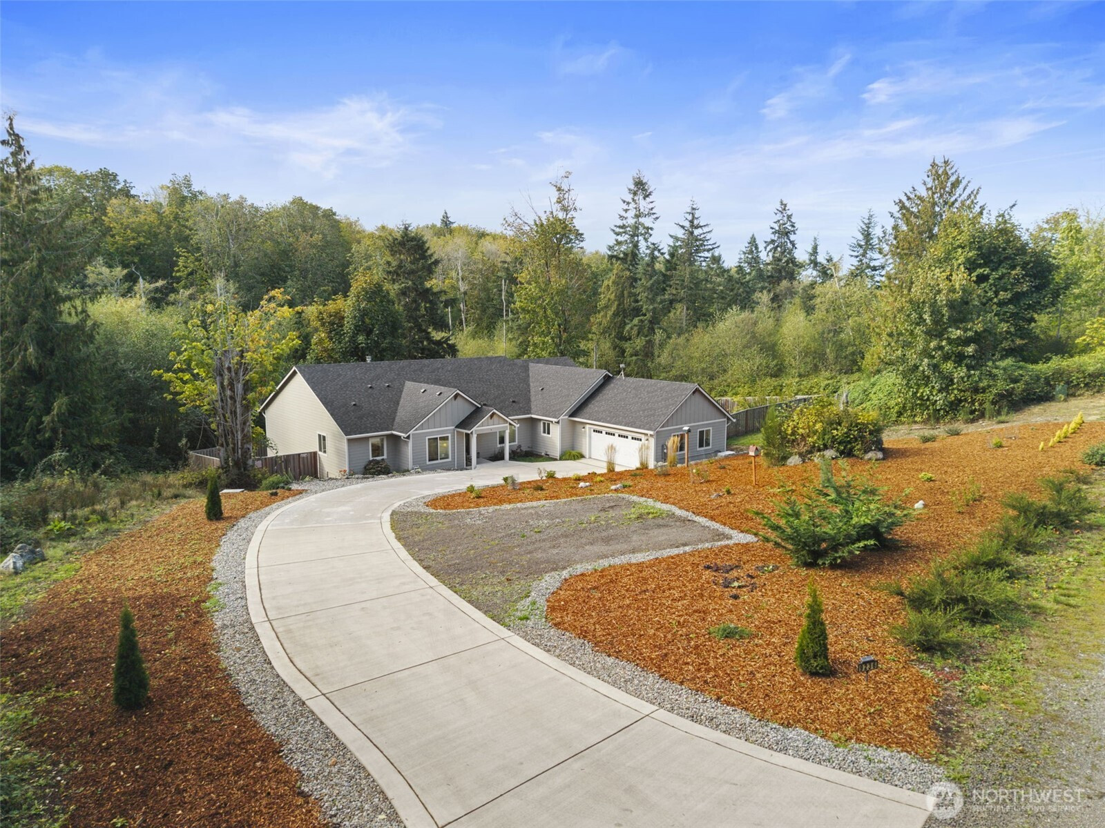 Built in 2021, this rare modern home offers peaceful country living on 5 private acres, while remaining close to everyday conveniences. The interior is completely single level with no steps inside - just two steps at entry - featuring wide halls, an open floor plan, and warm honey-oak flooring throughout. The expansive living area is anchored by a striking rock-faced gas fireplace, creating a welcoming and cozy atmosphere. The modern kitchen is finished in neutral tones and designed for both daily living and entertaining. A spacious primary suite provides a quiet retreat. Despite the tranquil setting, the home is fully equipped for modern life and remote work with gigabit fiber internet, Starlink backup, a whole-house automatic standby generator, and a premium water filtration system. Additional features include a two-car garage, extra parking, and space for future RV parking, plus 1,800+ SF of full height storage space complete this home. Enjoy fruit trees, berries, and heritage redwoods, all just minutes from the Kingston ferry, Safeway, beaches, trails, and easy access to Edmonds and Seattle.
