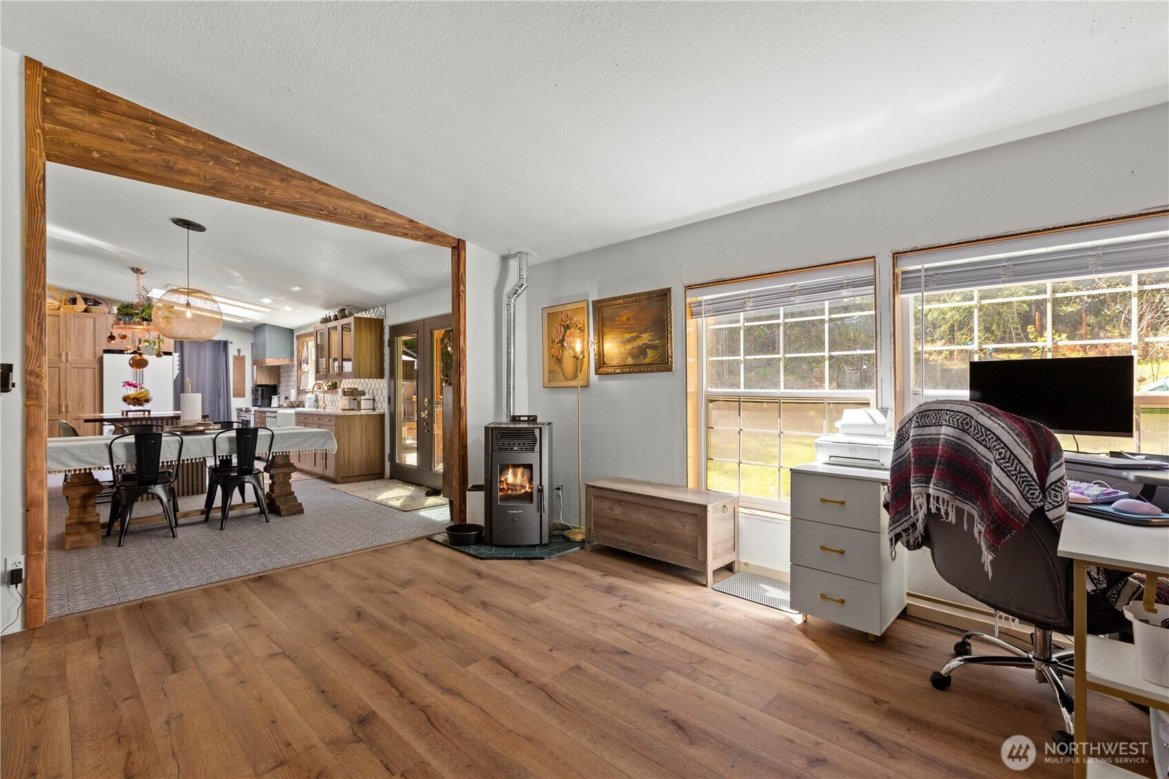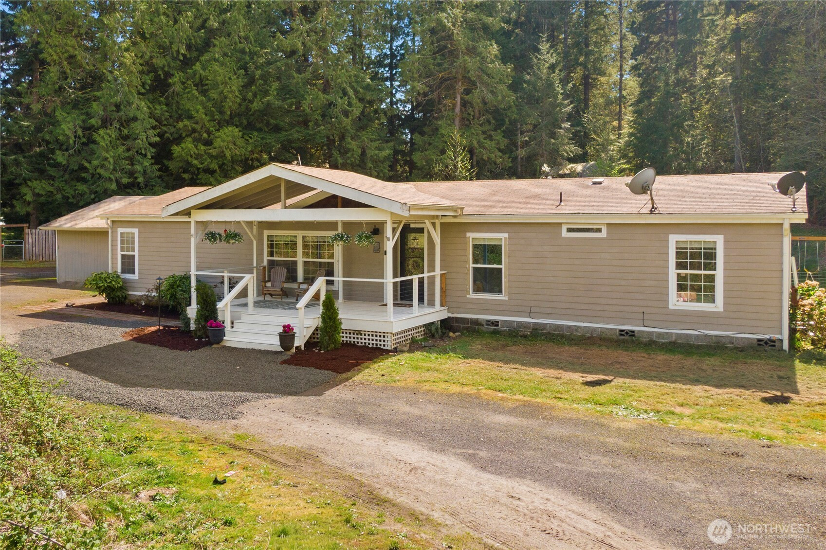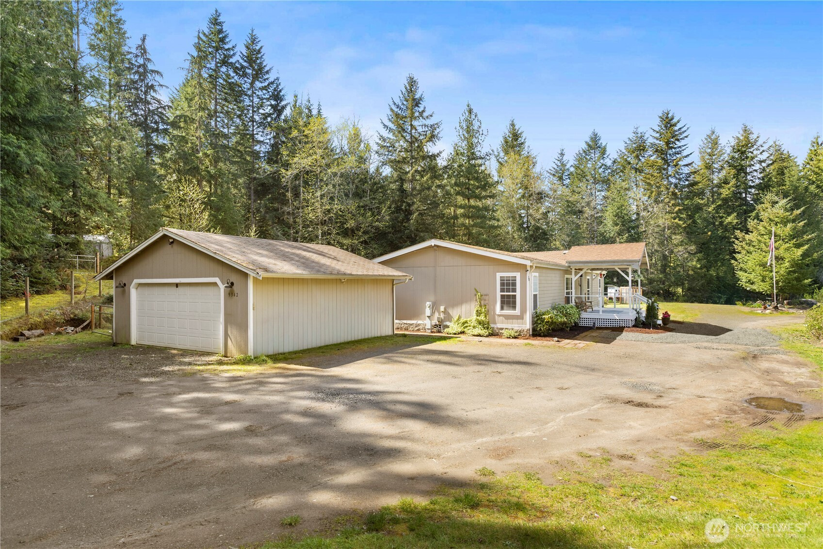 Welcome to this beautifully updated 3 bed, 2 bath rambler, offering the perfect blend of comfort and style on a sprawling 1.25 acre lot. This home has been thoughtfully renovated with modern touches throughout, including a brand-new kitchen with all new appliances, new LVP flooring, and a stunning, fully remodeled bathroom with a standalone tub – perfect for unwinding after a long day. Enjoy the bright and airy living spaces, including a number of new windows allowing for plenty of natural light. The spacious primary suite features its own private bathroom and walk-in closet. The inviting den provides extra flexibility for home office space, an additional bedroom or a cozy retreat. Step outside to the expansive lot, perfect for outdoor activities, gardening, or simply enjoying the privacy. The front door opens to a large covered front deck, ideal for relaxing or entertaining. Other highlights include a pellet stove for cozy winter nights and a convenient mudroom area. 2 car detached garage & shed provide even more storage. New furnace in 2025 & new back deck. This home is move-in ready with all appliances staying, offering both comfort and functionality in a peaceful setting. Don’t miss out on this incredible opportunity in Port Orchard!