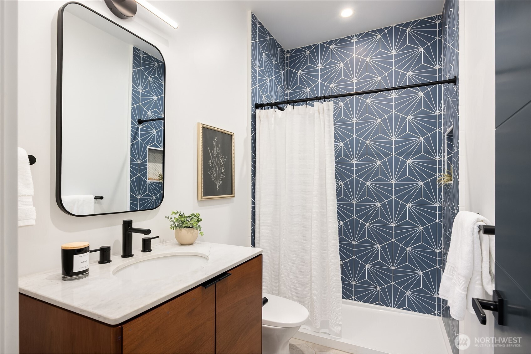 Enjoy quintessential island living in this stunning Modern Farmhouse in the heart of historic Eagledale! Set on a sunny one acre knoll overlooking 100+ year old homes, this architectural gem delivers both privacy and style. This better than new, custom 3BR/3BA home was built in 2023 with impeccable materials and craftsmanship. The open floor plan boasts vaulted ceilings and generous windows that brighten the interiors year-round. A fabulous gourmet kitchen is at the heart of the great room, offering ample storage, gorgeous cabinetry and a quartz topped waterfall island with eating bar. Just outside the dining area is a spacious covered patio perfect for year-round enjoyment. With a main floor primary suite and an office on each floor, this flexible floorplan lives larger than the square footage. An oversized detached 2 car garage connects to the house via a covered breezeway. Thoughtful infrastructure has an eye to the future including being solar panel ready and having a 5BR septic system to allow for a potential ADU. Best of all...there are numerous trails right out your door to Eagledale Park, Port Blakely & Blakely Harbor!