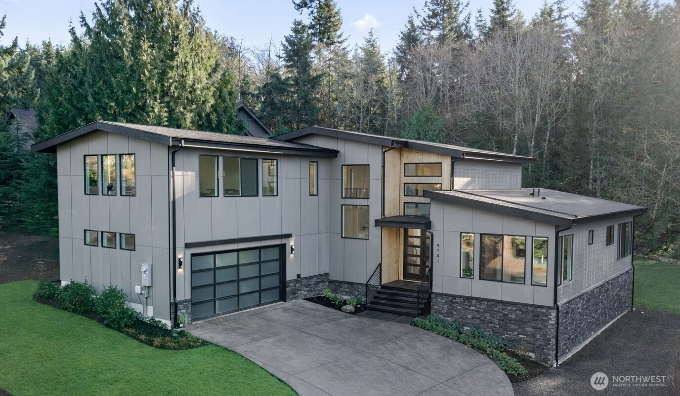 Experience refined Northwest living in this custom contemporary home that truly feels better than new in a wonderful golf community. From the moment you step through striking glass double doors, you’re welcomed by an impressive entry anchored by a dramatic floor-to-ceiling stone fireplace, a stunning focal point that sets the tone for the entire home. Designed for both comfort & style, the light-filled open floor plan showcases expansive windows in every room, bringing in natural light & serene greenbelt views. Main level features a luxurious primary suite & private den, offering flexibility for work or relaxation. Gourmet kitchen is beautifully appointed w/ custom cabinetry, elevated finishes & premium appliances, seamlessly flowing into great room & out to a covered deck, perfect for year-round entertaining. Thoughtful upgrades continue throughout, including heated bathroom floors, heated toilets, contemporary backlit built-ins & custom window coverings. Upstairs, a spacious bonus room w/ stone fireplace provides ideal gathering space. Finished lower level/basement offers versatility for a home gym or media room. Practical luxury shines w/ a well-designed mudroom off the garage w/ built-in storage, an oversized utility room w/ abundant cabinetry & counter space, epoxy-finished garage floors, sprinkler system & additional parking. Modern design, exceptional upgrades & a peaceful setting. This move-in-ready home offers comfort, functionality & elevated style at every turn.