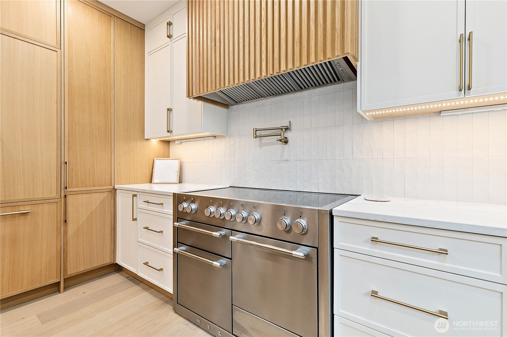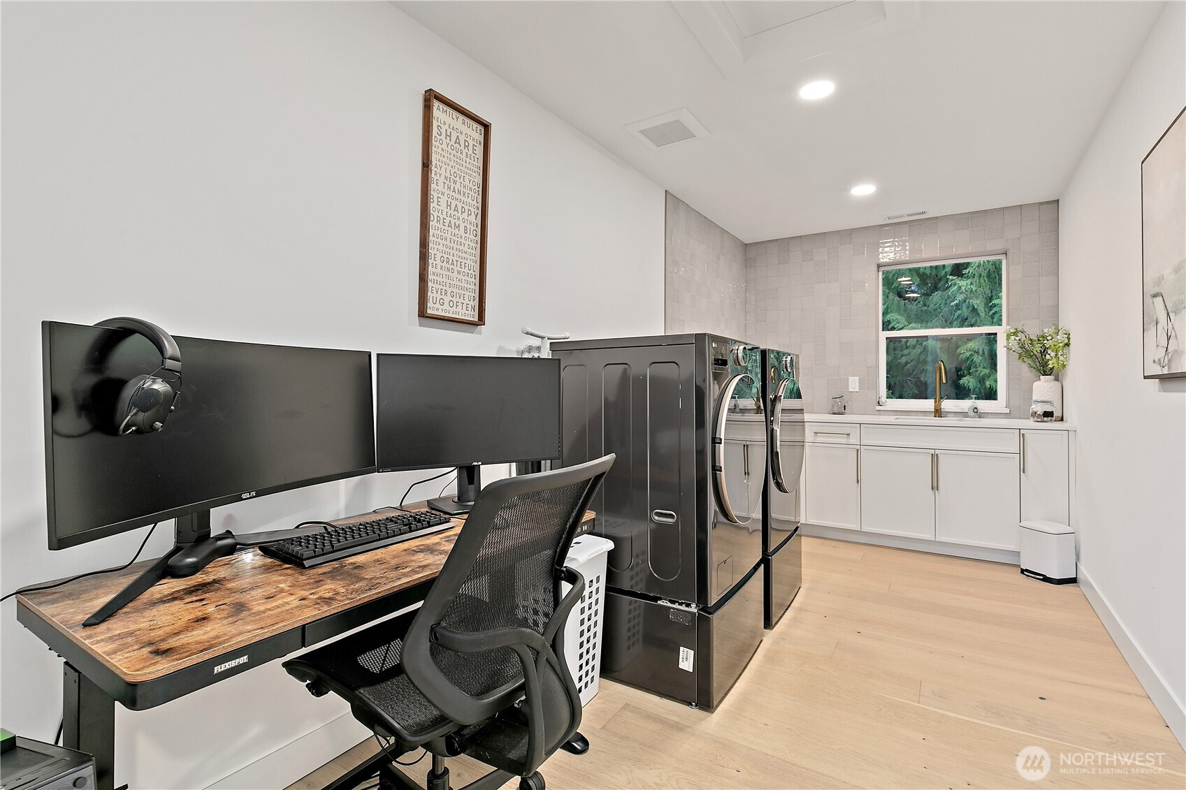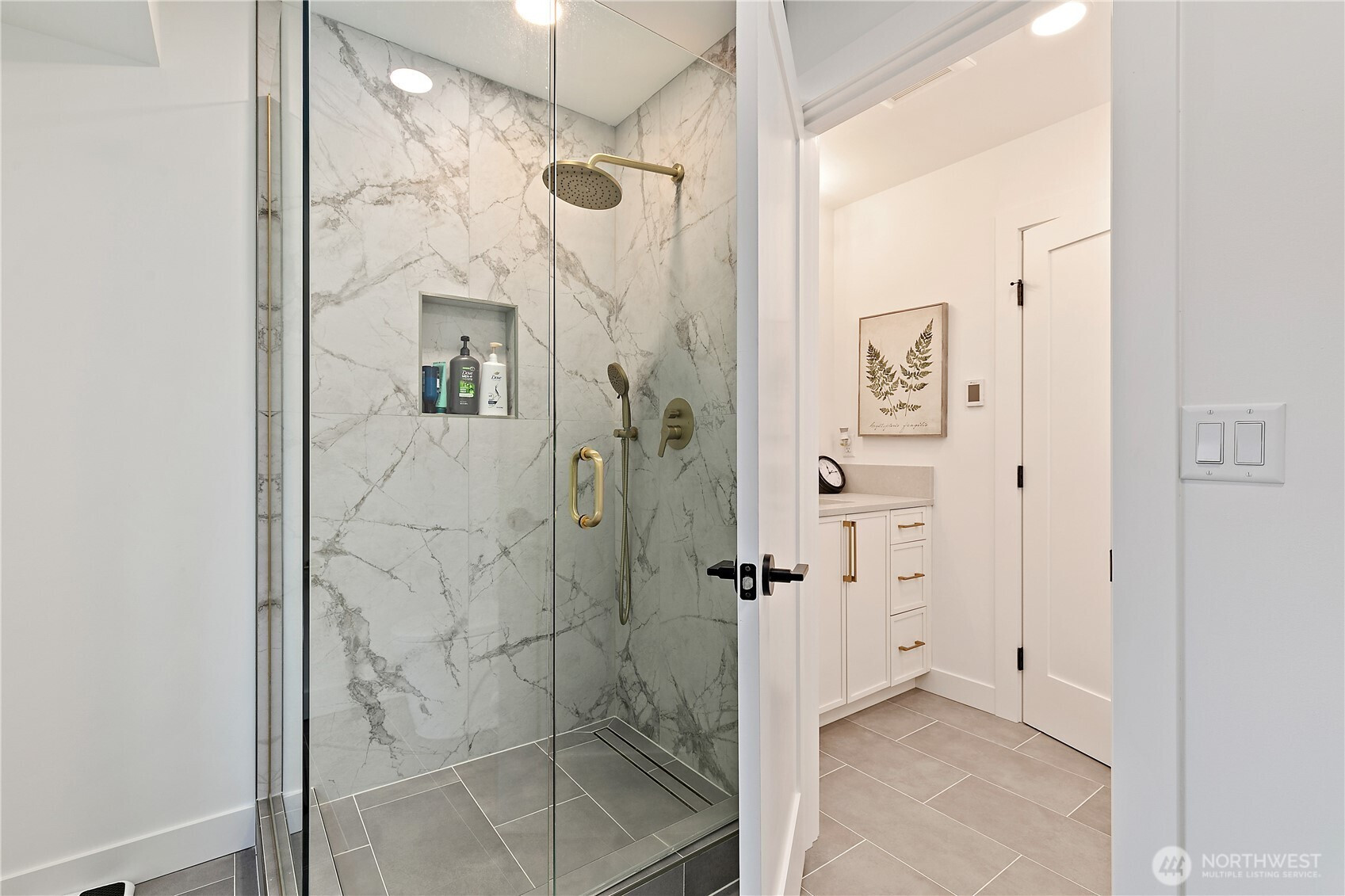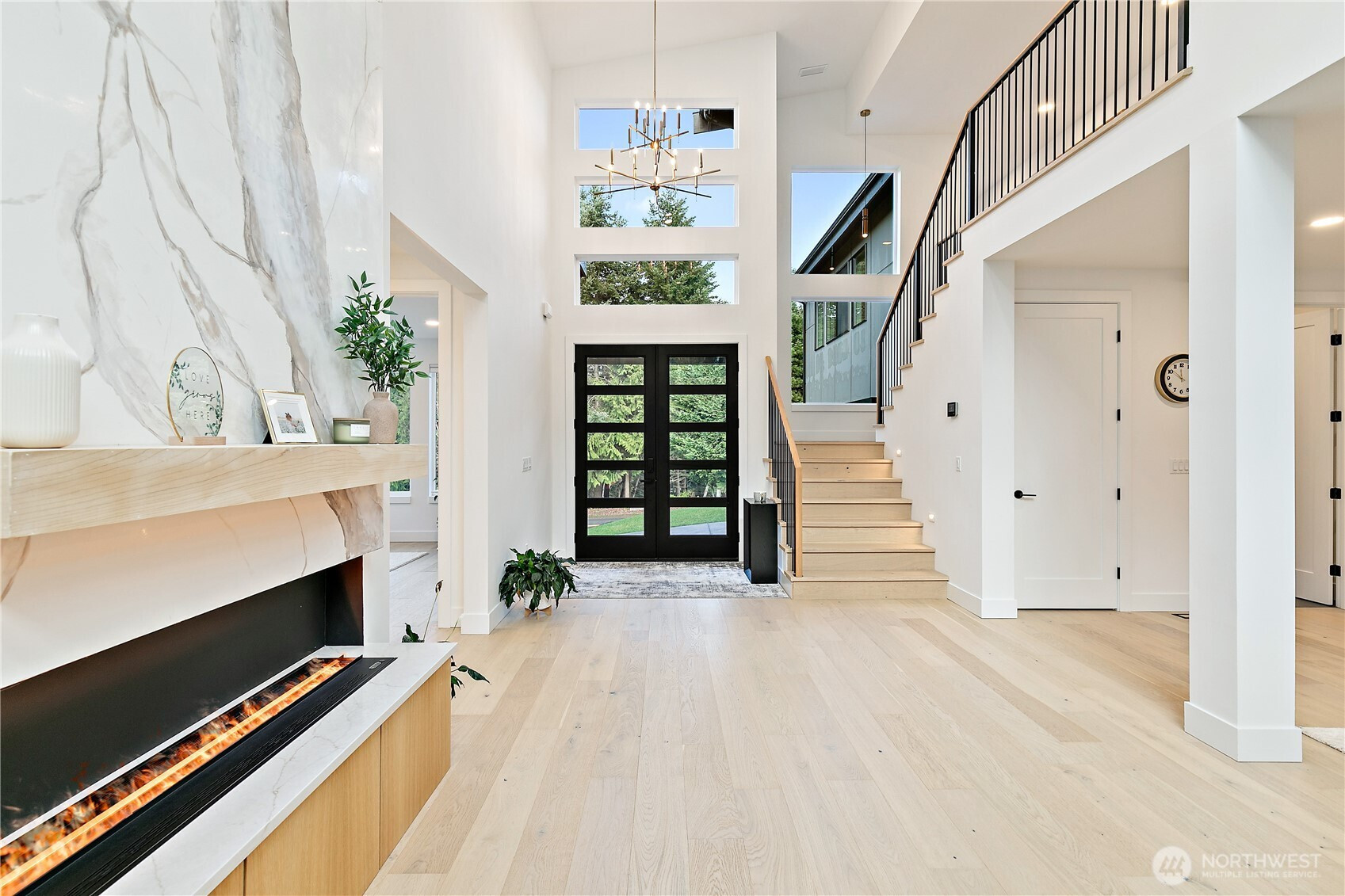 Welcome to this contemporary custom residence, delivering the sophistication and style of new construction with premium upgrades. Thoughtfully designed, the home offers four bedrooms plus a den, with the primary suite and den on the main level. A floor-to-ceiling fireplace anchors the entry, while open-concept living spaces extend to a covered deck overlooking a greenbelt. The gourmet kitchen features custom cabinetry, refined surfaces, and top-tier appliances, ideal for entertaining and living. A bonus room adds versatility, while the finished basement offers space for a gym or media retreat. Complete with custom window coverings, a sprinkler system, and an epoxy-finished garage, this move-in-ready home offers a lifestyle better than new!