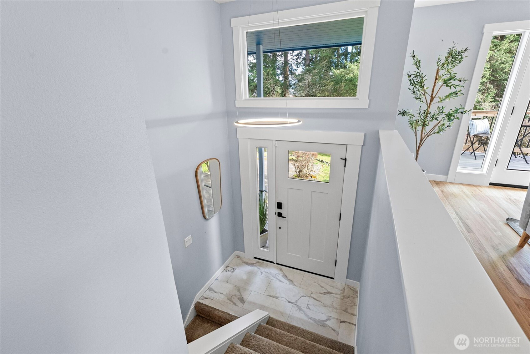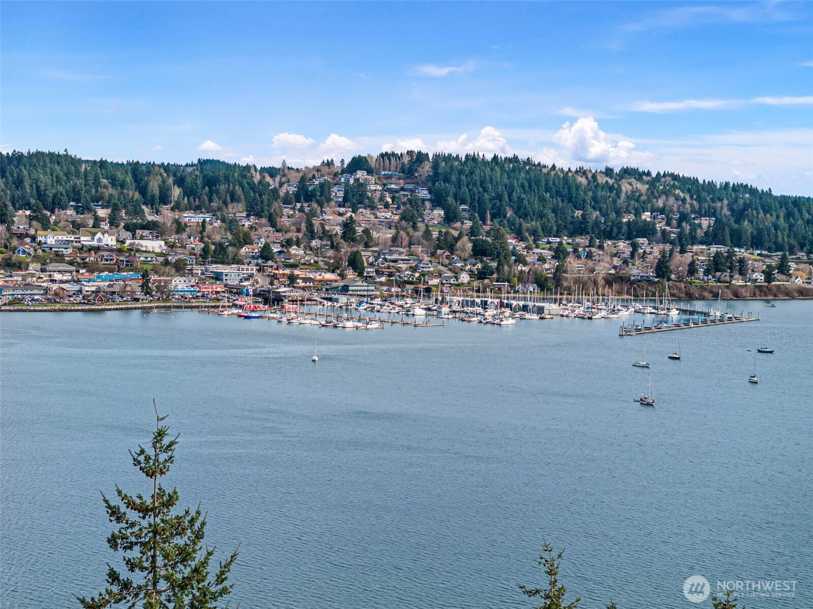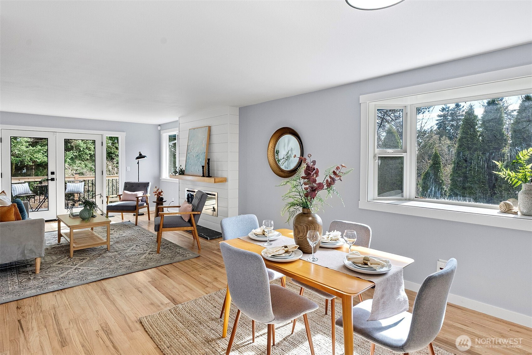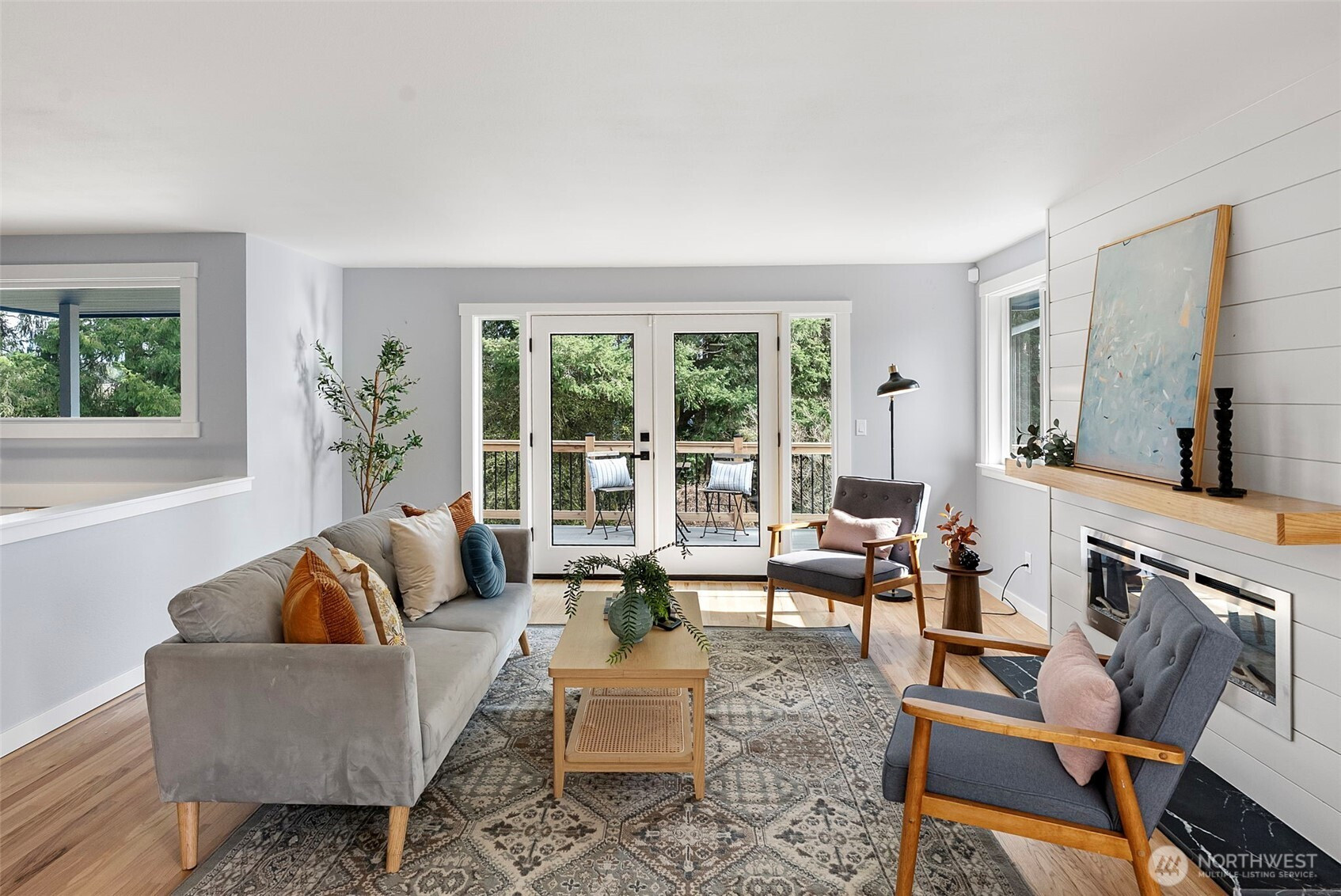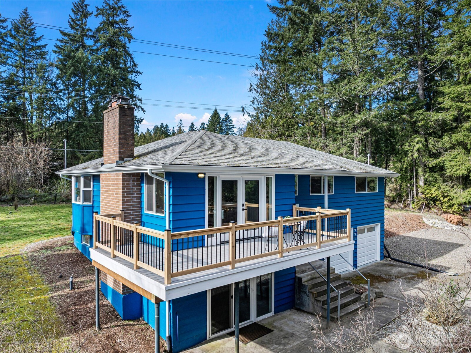 Beautifully updated 3-bedroom home with Liberty Bay views! This spacious home features an open and bright living room with refinished hardwood floors, fireplace and French doors leading to the huge deck to relax and take in the view. Dining area with built in cabinets and modern kitchen with quartz counters and stainless steel appliances. Primary bedroom with attached ¾ bathroom, two guest beds and additional full bath. Spacious family room with slider to the patio and utility room on lower level. Large private backyard with huge shed for extra storage or work space. Fresh exterior paint, new trex deck, all new light fixtures, trim, heat pump and much more! Attached 2-car garage, plus driveway parking. Desirable location just minutes to downtown Poulsbo, highways, Navy bases, shopping & dining!