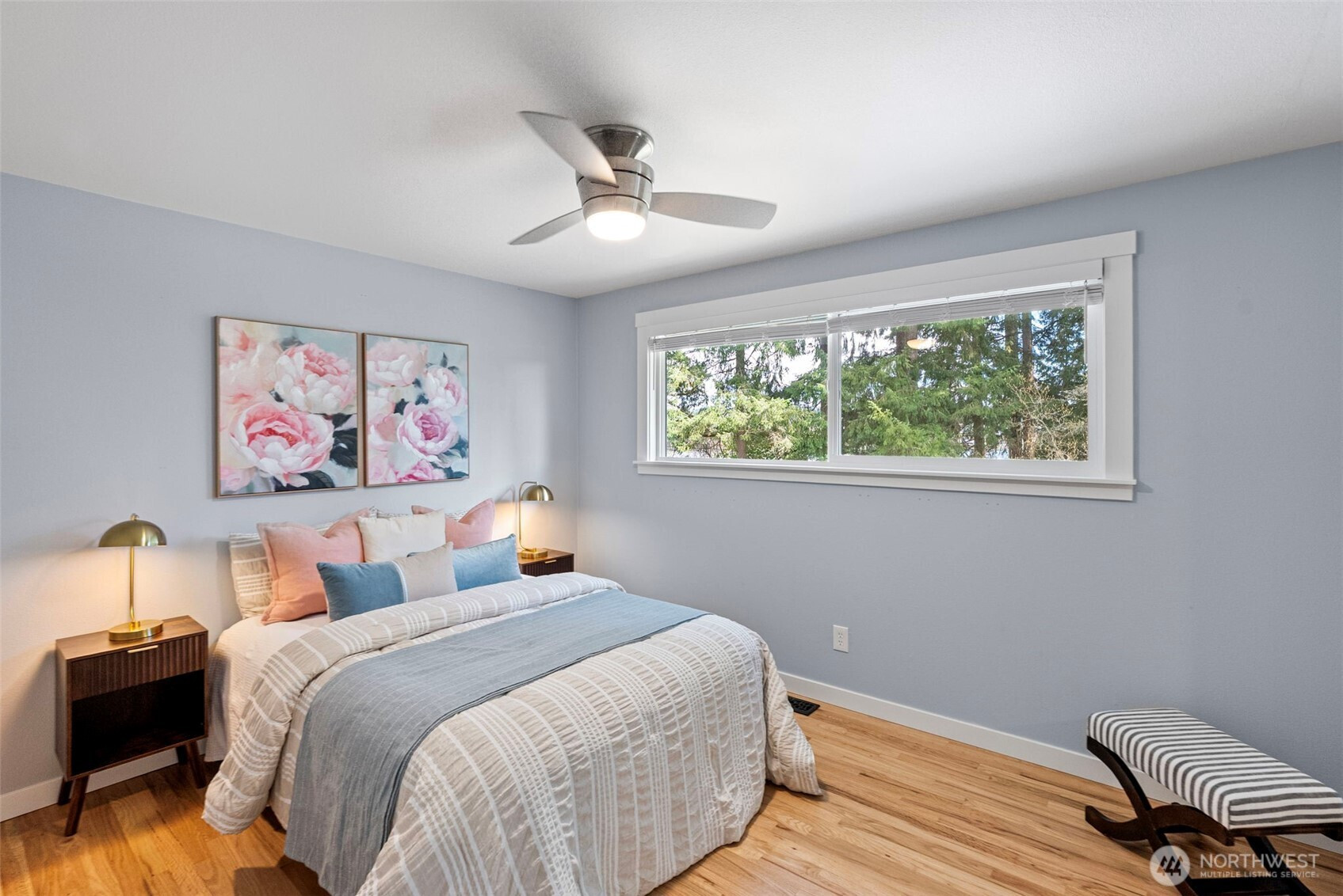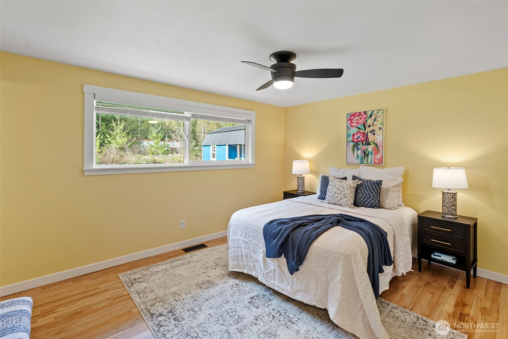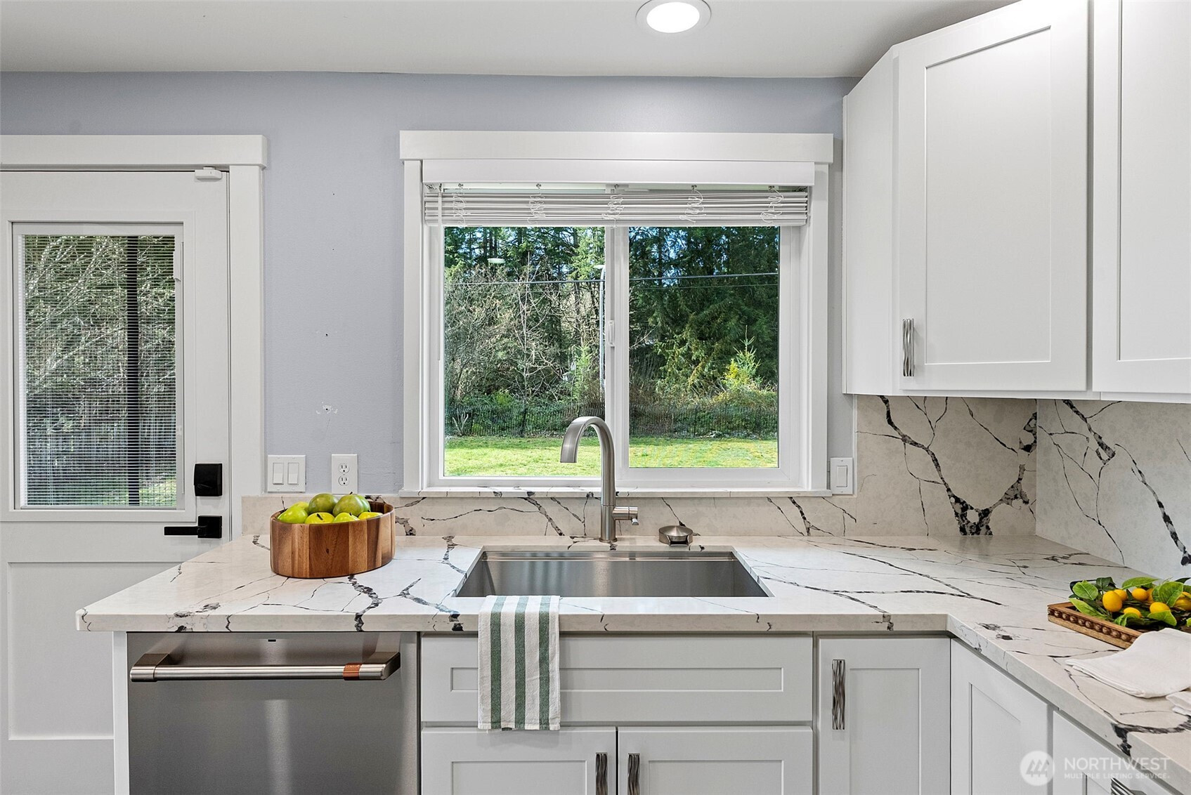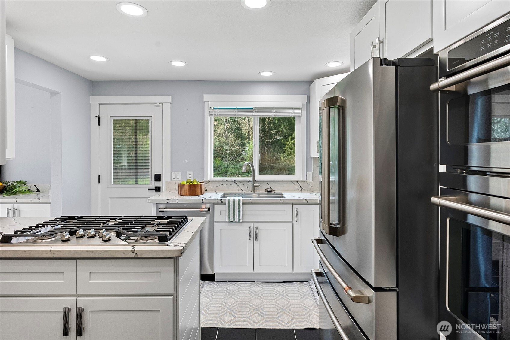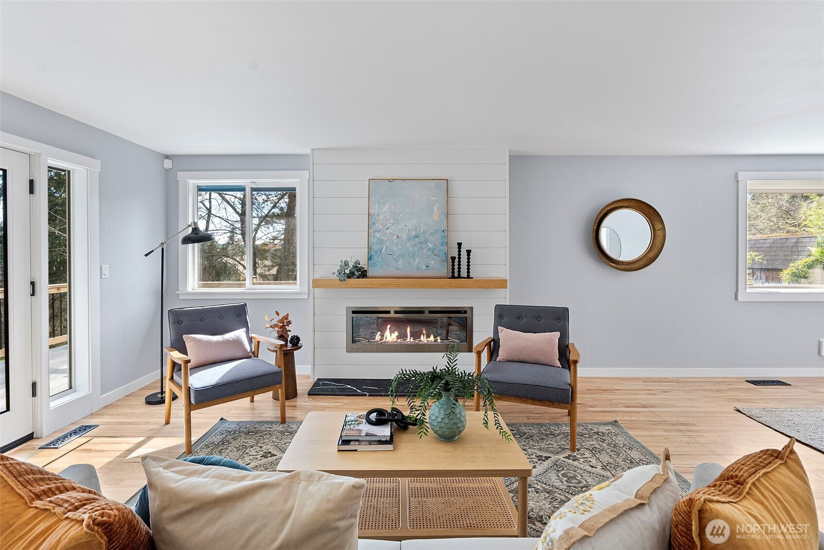 Beautifully updated 3-bedroom home with Liberty Bay views! This spacious home features an open and bright living room with refinished hardwood floors, fireplace and French doors leading to the huge deck to relax and take in the view. Dining area with built in cabinets and modern kitchen with quartz counters and stainless steel appliances. Primary bedroom with attached ¾ bathroom, two guest beds and additional full bath. Spacious family room with slider to the patio and utility room on lower level. Large private backyard with huge shed for extra storage or work space. Fresh exterior paint, new trex deck, all new light fixtures, trim, heat pump and much more! Attached 2-car garage, plus driveway parking. Desirable location just minutes to downtown Poulsbo, highways, Navy bases, shopping & dining!