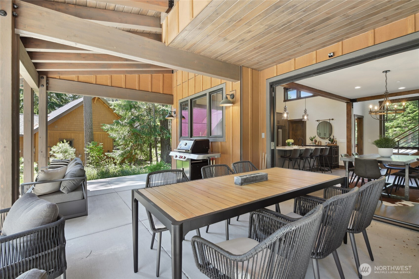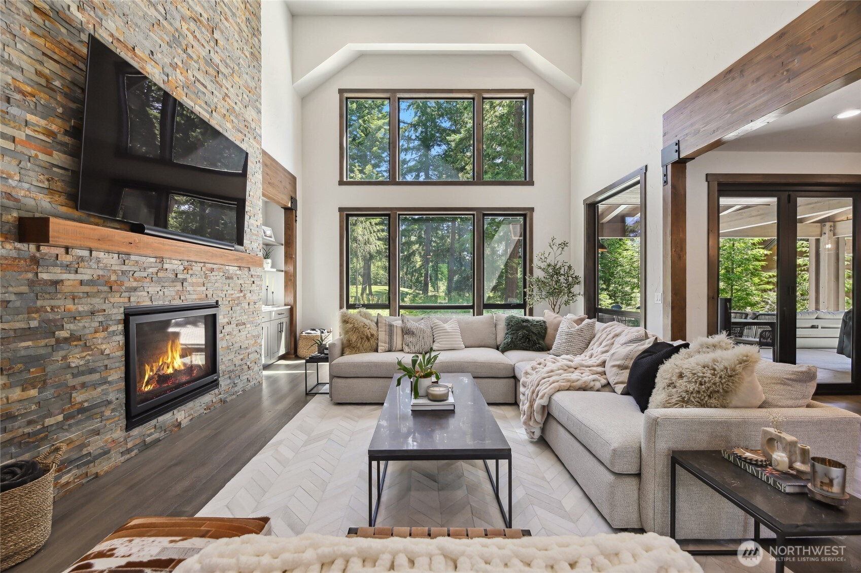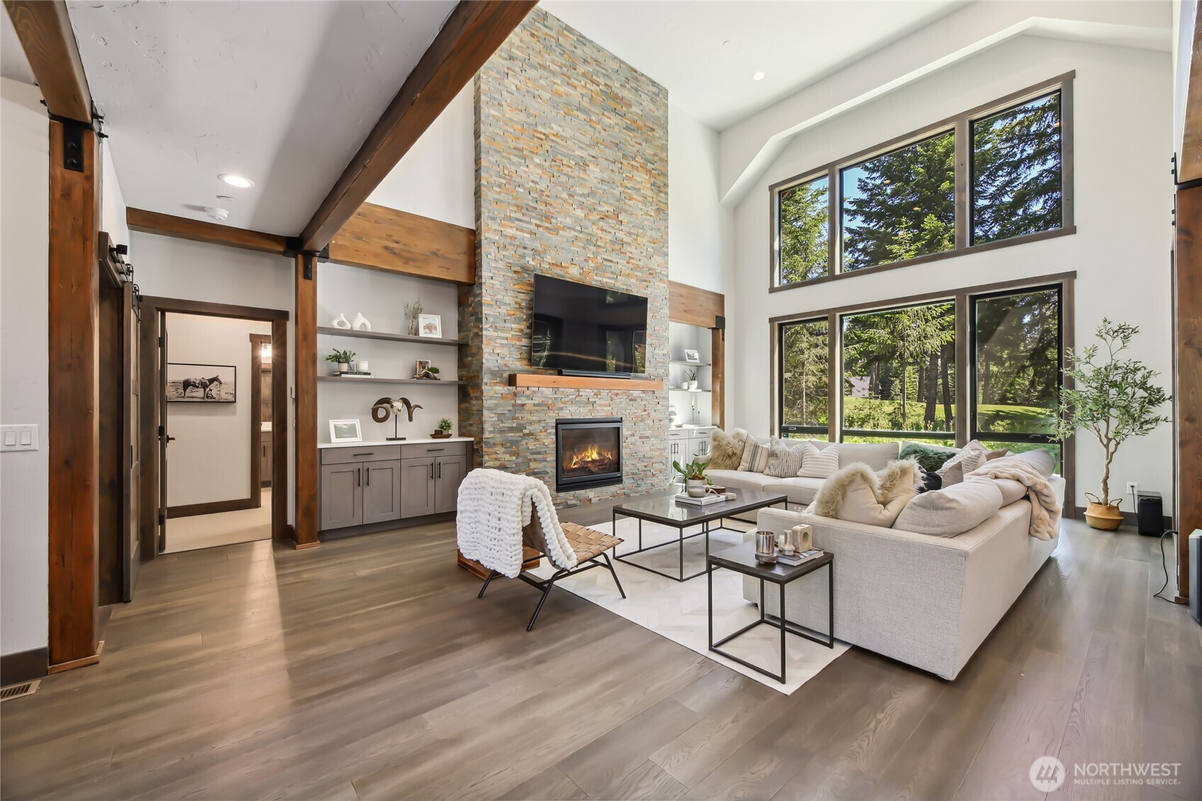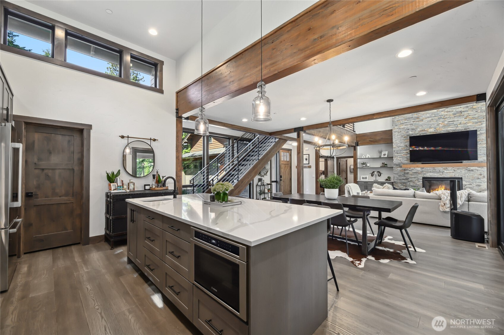 Perfectly positioned along the 7th green of Prospector Golf Course, this exceptional Suncadia retreat offers premier golf frontage in the heart of the community—just moments from the lodge, golf courses, swim and fitness center, and Suncadia Social. Thoughtfully designed with 4 bedrooms, plus an additional fully finished guest suite above the garage, ideal for visitors or multi-generational living. The backyard has been transformed with over $60,000 in upgrades, creating a private wellness escape complete with an infrared sauna, saltwater hot tub, and a beautifully landscaped concrete patio with an outdoor fire pit—perfect for year-round enjoyment. Inside, dramatic north- and south-facing double-height windows flood the home with natural light throughout the day. The open-concept design is tailored for both everyday living and entertaining, highlighted by a gourmet kitchen with soaring ceilings, a walk-in pantry, oversized island with prep sink, and premium finishes throughout. Seamless indoor-outdoor living is achieved through folding doors that open to the expanded patio, offering a true connection to Suncadia’s stunning natural surroundings.