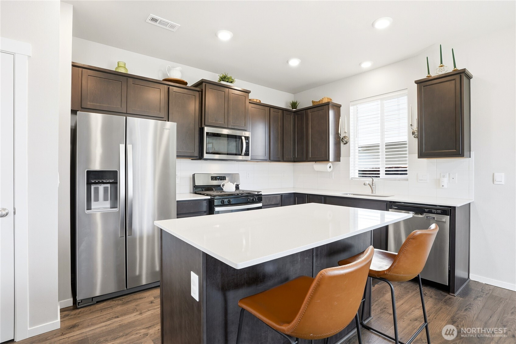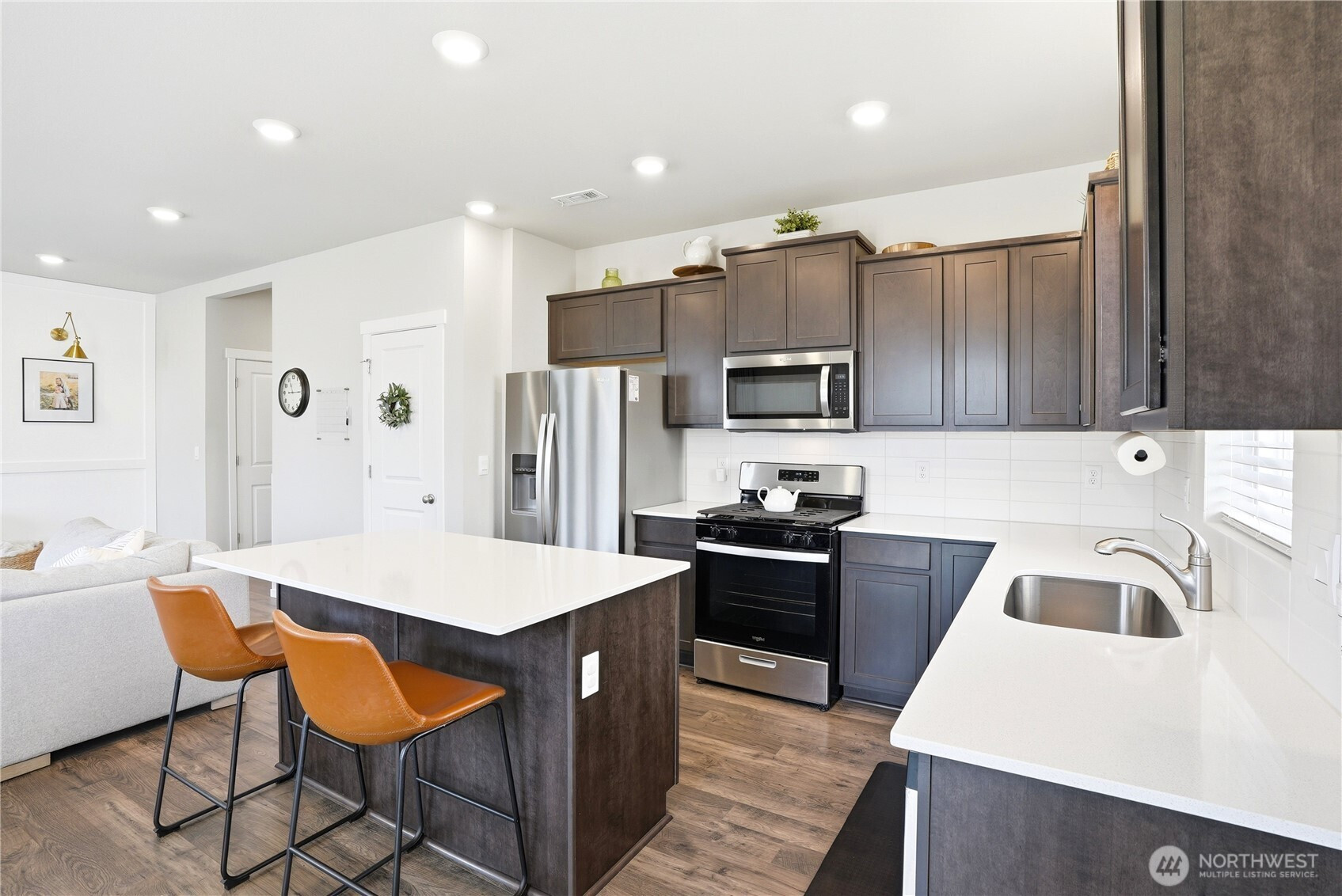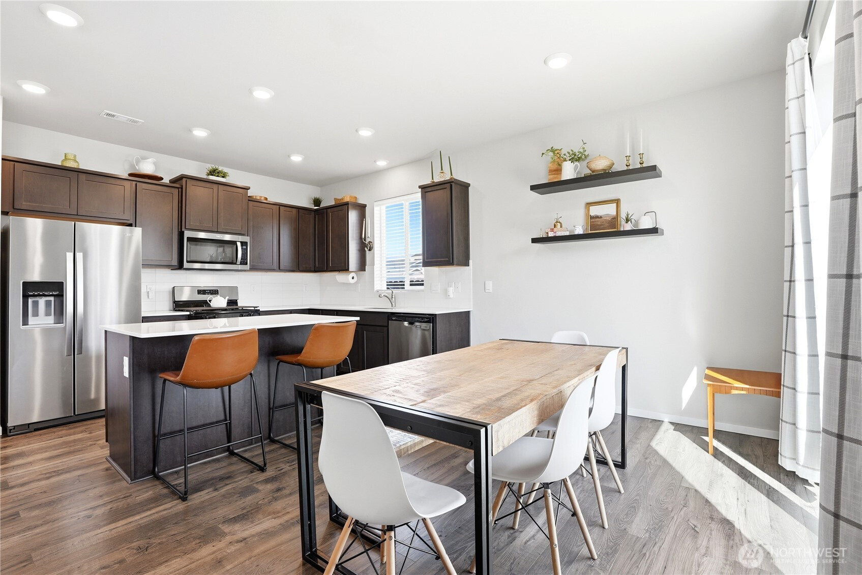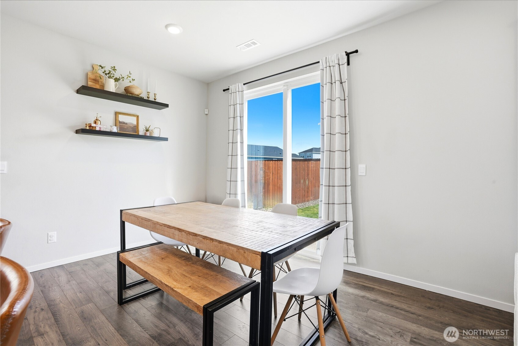 Better than new and the photos prove it. This 2022 DR Horton home in Phase 1 of Black Horse at Whiskey Creek has the finishes the newest builds left behind, plus the character the owners brought with them. Step inside to a welcoming entryway with board and batten detail, warm laminate hardwood floors, and a staircase that flows effortlessly into the open living space. The main level is bright and airy with 9-foot ceilings, a stylish living room featuring a custom shiplap accent wall, and a kitchen equipped with a gas stove, quartz countertops, and tile backsplash — the upgrades that matter. Upstairs, the primary suite is a true retreat with a designer board and batten feature wall, carpet, and plenty of natural light. Every room in this home has been thoughtfully cared for and tastefully finished. Move-in ready means actually ready — all appliances included, garage door opener installed, yard fully fenced and landscaped. The neighborhood does the rest: playground, paved paths, and irrigation water all covered through a low $86/month HOA.