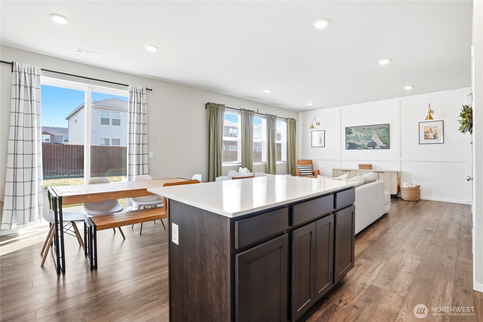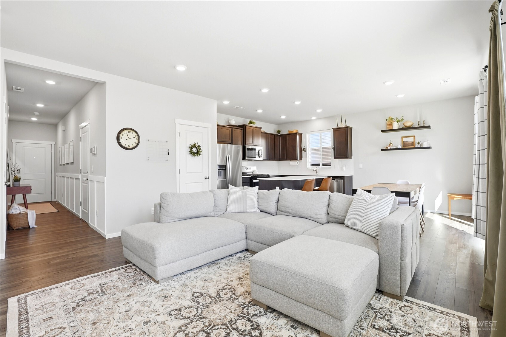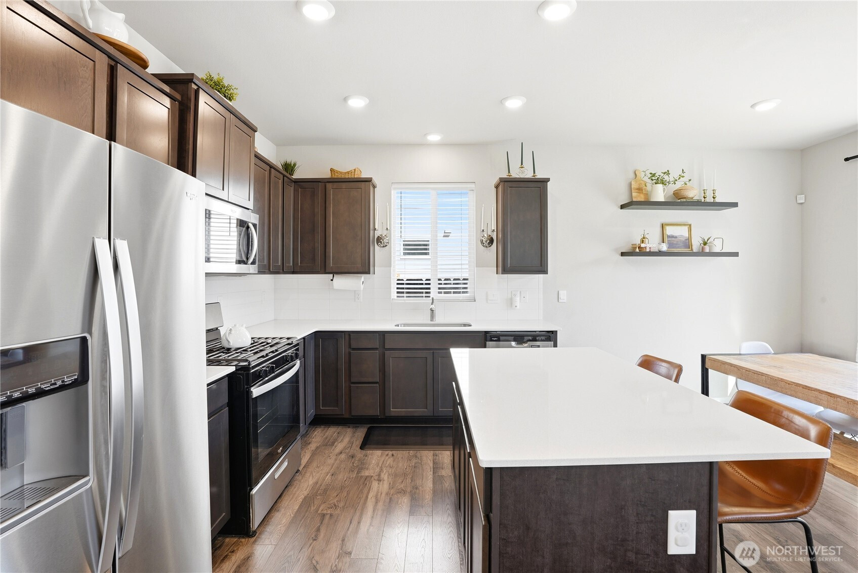 Better than new and the photos prove it. This 2022 DR Horton home in Phase 1 of Black Horse at Whiskey Creek has the finishes the newest builds left behind, plus the character the owners brought with them. Step inside to a welcoming entryway with board and batten detail, warm laminate hardwood floors, and a staircase that flows effortlessly into the open living space. The main level is bright and airy with 9-foot ceilings, a stylish living room featuring a custom shiplap accent wall, and a kitchen equipped with a gas stove, quartz countertops, and tile backsplash — the upgrades that matter. Upstairs, the primary suite is a true retreat with a designer board and batten feature wall, carpet, and plenty of natural light. Every room in this home has been thoughtfully cared for and tastefully finished. Move-in ready means actually ready — all appliances included, garage door opener installed, yard fully fenced and landscaped. The neighborhood does the rest: playground, paved paths, and irrigation water all covered through a low $86/month HOA.
