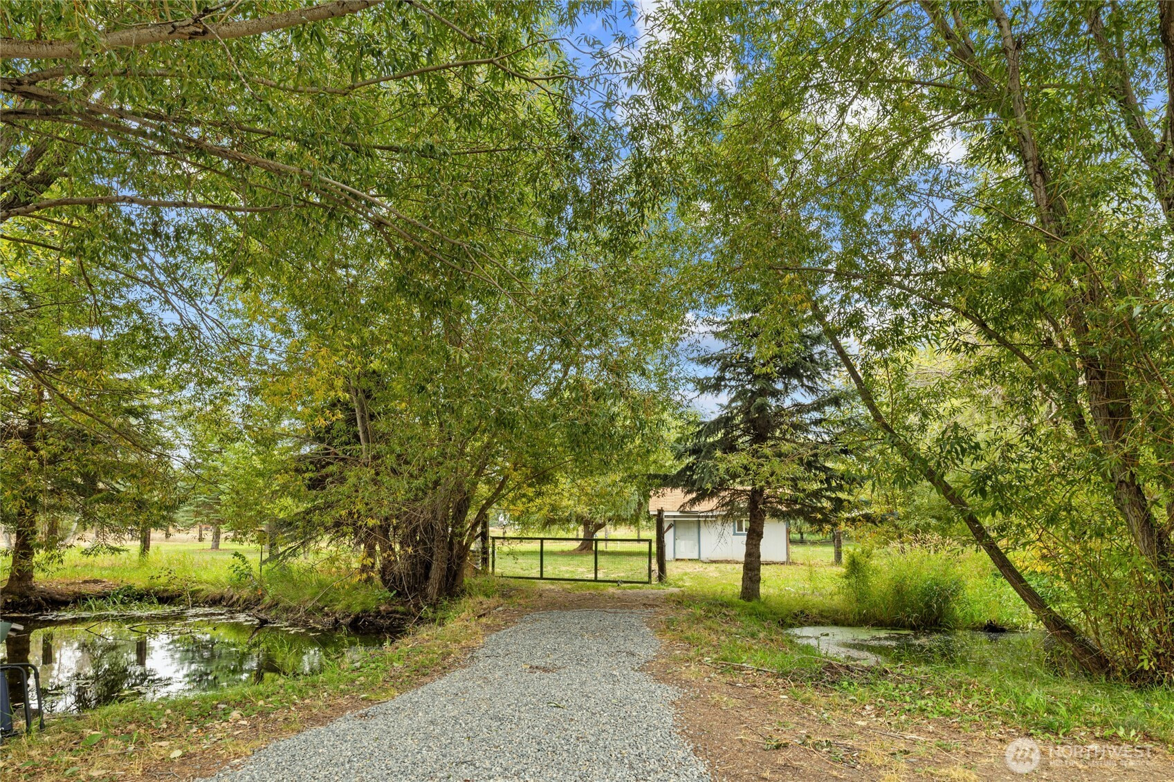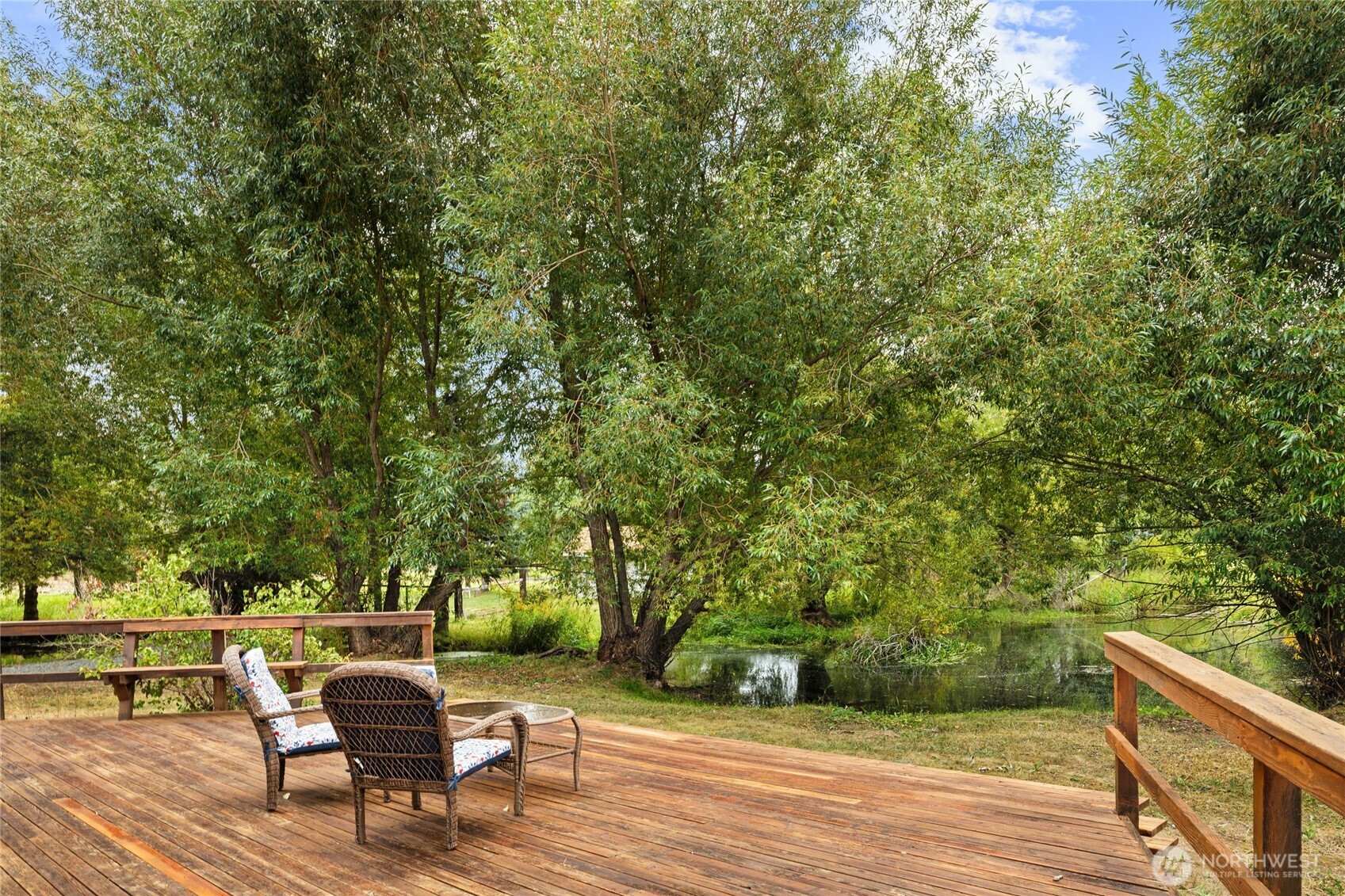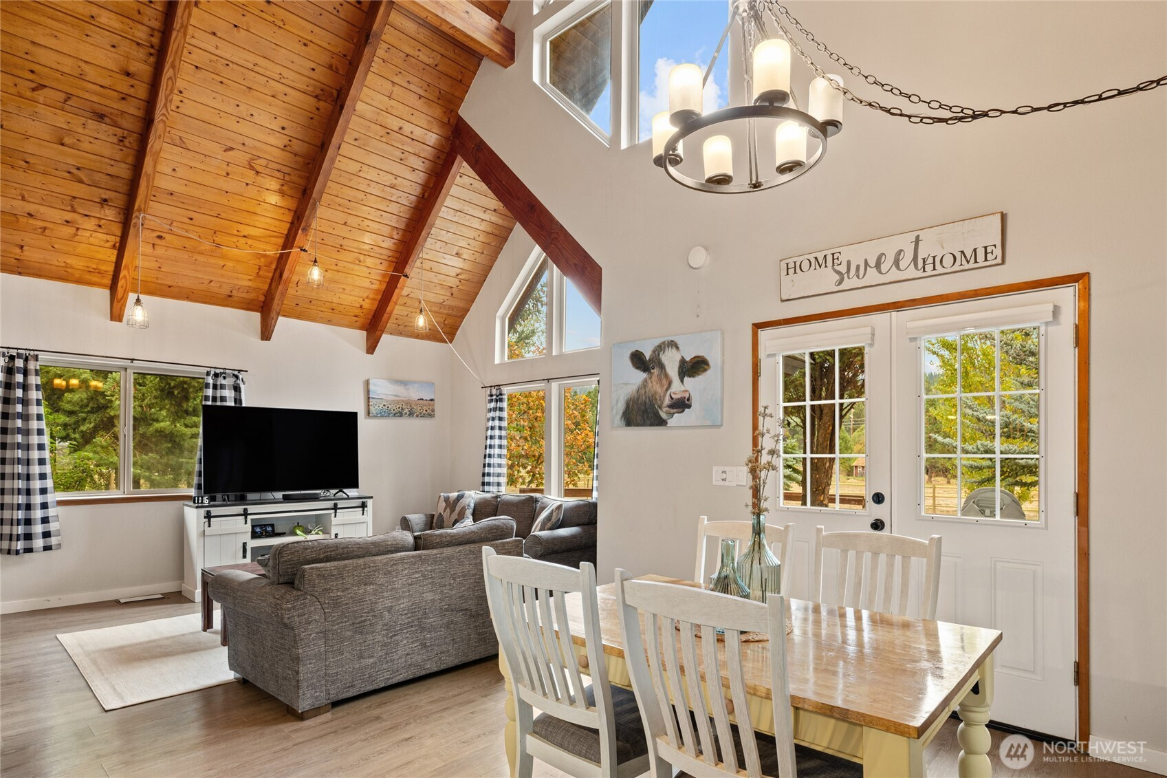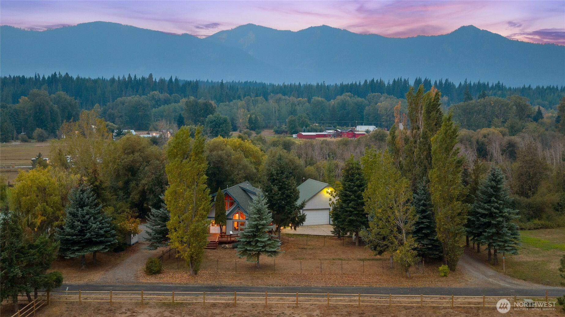 This private, cozy 1,620 sq ft cabin-inspired home offers a tranquil escape on a sprawling 3.38-acre lot. Discover the Great Room with vaulted ceilings & natural wood beams and tongue and groove ceiling, providing a warm, rustic elegance. The home features 3 bedrooms, including 2 comfortable guest rooms. The upper-level primary suite is a true sanctuary, featuring a walk-in closet and an ensuite w/ dual vanity and large tub+shower. The property's privacy is enhanced by a spacious deck for entertaining & large private pond & lush open pasture. Outside, a large shop w/ a dedicated workshop provides utility/storage + multiple sheds/outbuildings & fruit trees. The partially fenced acreage, complete with a dog run, awaits your outdoor lifestyle.
